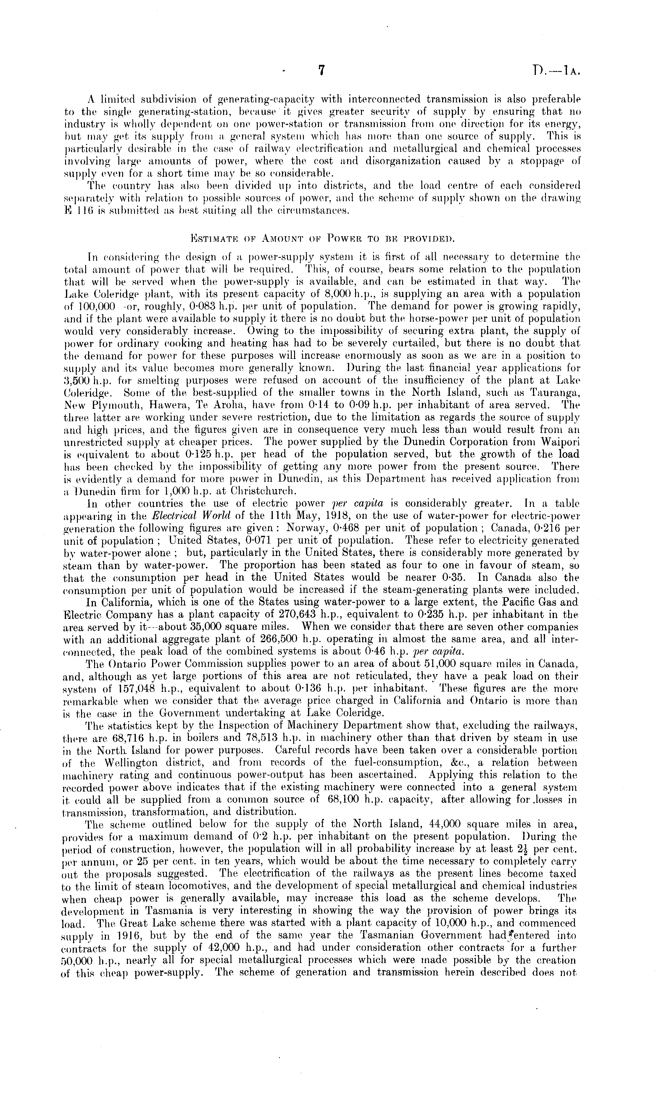 A limited subdivision of generating-capacity with interconnected transmission is also preferable to the single generating-station, because it gives greater security of supply by ensuring that no industry is wholly dependent on one power-station or transmission from one direction for its energy, but may get; its supply from a general system which has more than one source, of supply. This is particularly desirable in the case of railway electrification and metallurgical and chemical processes involving large amounts of power, where the cost and disorganization caused by a stoppage of supply even for a short time may be so considerable. The country has also been divided up into districts, and the load centre of each considered separately with relation to possible sources of power, and the scheme of supply shown on the drawing E 116 is submitted as best suiting all the circumstances. Estimate of Amount ok Power to be provided. In considering the design of a power-supply system it is first of all necessary to determine the total amount of power that will be required. This, of course, bears some relation to the population that will be served when the power-supply is available, and can be estimated in that way. The Lake Coleridge plant, with its present capacity of 8,000 h.p., is supplying an area with a population of 100,000 or, roughly, 0-083 h.p. per unit of population. The demand for power is growing rapidly, and if the plant were available to supply it there is no doubt but the horse-power per unit of population would very considerably increase. Owing to the impossibility of securing extra, plant, the supply of power for ordinary cooking and heating has had to be severely curtailed, but there is no doubt that the demand for power for these purposes will increase enormously as soon as we are in a position to supply and its value becomes more generally known. During the last financial year applications for 3,500 h.p. for smelting purposes were refused on account of the. insufficiency of the plant at Lake Coleridge. Some of the. best-supplied of the smaller towns in the North Island, such as Tauranga, New Plymouth, Hawera, Te Aroha, have from 0-14 to 0-09 h.p. per inhabitant of area served. The three, latter are working under severe restriction, due to the limitation as regards the source, of supply and high prices, and the figures given are in consequence very much less than would result from an unrestricted supply at cheaper prices. The power supplied by the Dunedin Corporation from Waipori is equivalent to about 0-125 h.p. per head of the population served, but the growth of the load has been checked by the impossibility of getting any more power from the present source. There is evidently a demand for more power in Dunedin, as this Department has received application from a Dunedin firm for 1,000 h.p. at Christchurch. In other countries the use of electric power per capita is considerably greater. In a table appearing in the Electrical World of the 11th May, 1918, on the use of water-power for electric-power generation the following figures are given : Norway, 0-468 per unit of population ; Canada, 0-216 per unit of population ; United States, 0-071 per unit of population. These refer to electricity generated by water-power alone. ; but, particularly in the United States, there is considerably more generated by steam than by water-power. The proportion has been stated as four to one in favour of steam, so that the consumption per head in the United States would be nearer 0-35. In Canada, also the consumption per unit of population would be increased if the steam-generating plants were included. In California, which is one of the States using water-power to a large extent, the Pacific Gas and Electric, Company has a plant capacity of 270,643 h.p., equivalent to 0-235 h.p. per inhabitant in the area served by it-- about 35,000 square miles. When we consider that there are seven other companies with an additional aggregate plant of 266,500 h.p. operating in almost the same area, and all interconnected, the peak load of the combined systems is about 0-46 h.p. per capita. The Ontario Power Commission supplies power to an area of about 51,000 square miles in Canada, and, although as yet large portions of this area are not reticulated, they have a peak load on their system of 157,048 h.p., equivalent to about 0-136 h.p. per inhabitant. These figures are the more remarkable when we consider that the, average price charged in California and Ontario is more than is the case in the Government undertaking at Lake Coleridge. The statistics kept by the Inspection of Machinery Department show that, excluding the railways, there are 68,716 h.p. in boilers and 78,513 h.p. in machinery other than that driven by steam in use in the North. Island for power purposes. Careful records have been taken over a considerable portion of the Wellington district, and from records of the fuel-consumption, &c, a relation between machinery rating and continuous power-output has been ascertained. Applying this relation to the recorded power above, indicates that if the existing machinery were connected into a general system it could all be supplied from a common source of 68,100 h.p. capacity, after allowing for.losses in transmission, transformation, and distribution. The, scheme outlined below for the supply of the North Island, 44,000 square miles in area, provides for a maximum demand of o'2 h.p. per inhabitant on the present population. During the period of construction, however, the population will in all probability increase by at least 2| per cent, per annum, or 25 per cent, in ten years, which would be about the time necessary to completely carry out the proposals suggested. The electrification of the railways as the present lines become taxed to the limit of steam locomotives, and the development of special metallurgical and chemical industries when cheap power is generally available, may increase this load as th