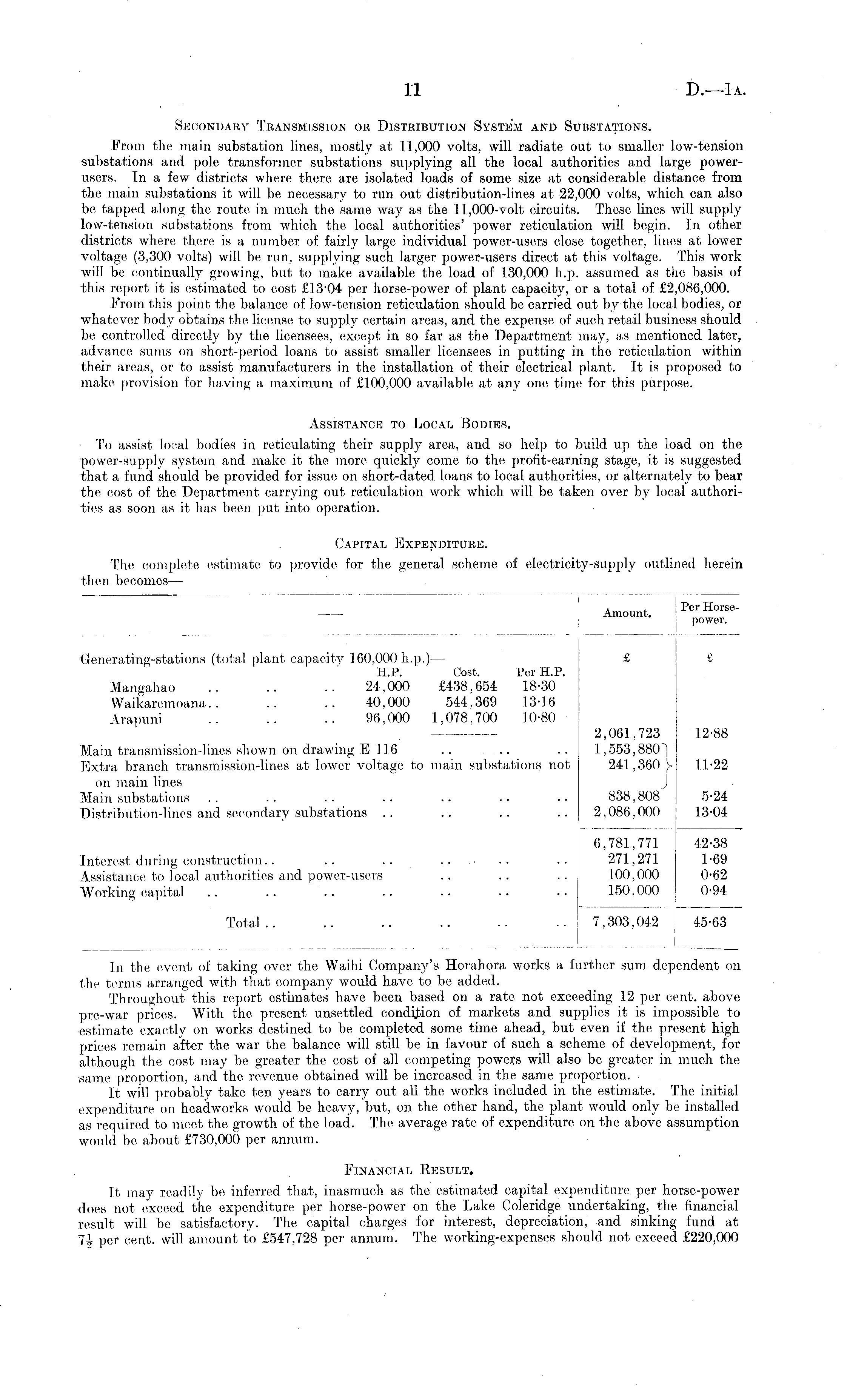 Secondary Transmission or Distribution System and Substations. From the main substation lines, mostly at 11,000 volts, will radiate out to smaller low-tension substations and pole transformer substations supplying all the local authorities and large powerusers. In a few districts where there are isolated loads of some size at considerable distance from the main substations it will be necessary to run out distribution-lines at 22,000 volts, which can also be tapped along the route in much the same way as the 11,000-volt circuits. These lines will supply low-tension substations from which the local authorities' power reticulation will begin. In other districts where there is a number of fairly large individual power-users close together, lines at lower voltage (3,300 volts) will be run, supplying such larger power-users direct at this voltage. This work will be continually growing, but to make available the load of 130,000 h.p. assumed as the basis of this report it is estimated to cost £13 - 04 per horse-power of plant capacity, or a total of £2,086,000. From this point the balance of low-tension reticulation should be carried out by the local bodies, or ■whatever body obtains the, license to supply certain areas, and the expense of such, retail business should be controlled directly by the licensees, except in so far as the Department may, as mentioned later, advance sums on short-period loans to assist smaller licensees in putting in the reticulation within their areas, or to assist manufacturers in the installation of their electrical plant. It is proposed to make provision for having a maximum of £100,000 available at any one time for this purpose. Assistance to Local Bodies. To assist local bodies in reticulating their supply area, and so help to build up the load on the power-supply system and make it the more quickly come to the profit-earning stage, it is suggested that a fund should be provided for issue on short-dated loans to local authorities, or alternately to bear the cost of the Department carrying out reticulation work which will be taken over by local authorities as soon as it has been put into operation. Capital Expenditure. The complete estimate to provide for the general scheme of electricity-supply outlined herein then becomes—