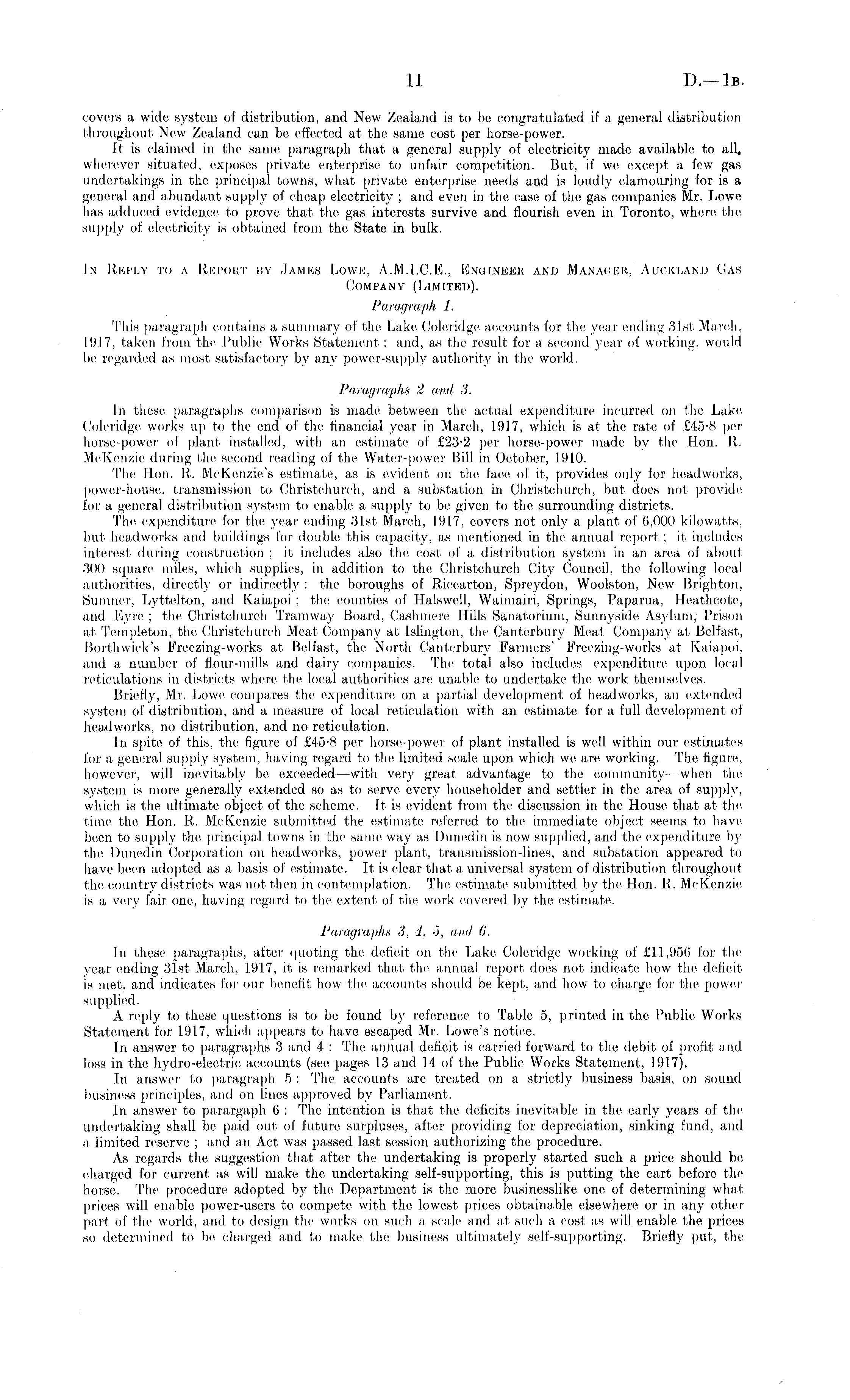 covers a wide, system of distribution, and New Zealand is to be congratulated if a general distribution throughout New Zealand can be effected at the same cost per horse-power. It is claimed in the same paragraph that a general supply of electricity made available to all, wherever situated, exposes private enterprise to unfair competition. But, if we except a few gas undertakings in the principal towns, what private enterprise needs and is loudly clamouring for is a general and abundant supply of cheap electricity ; and even in the case of the gas companies Mr. Lowe has adduced evidence to prove that the gas interests survive and flourish even in Toronto, where the supply of electricity is obtained from the State in bulk. In Reply to a Report by .James Lowe, A.M.I.CM., Engineer and Manager, Auckland Cas Company (Limited). Paragraph 1. This paragraph contains a summary of the Lake Coleridge accounts for the year ending 31st March, 1917. taken from the Public Works Statement : and, as the result for a second year of working, would be regarded as most satisfactory by any power-supply authority in the world. Paragraphs 2 and '■'>. In these paragraphs comparison is made between the actual expenditure incurred on the Lake Coleridge works up to the end of the financial year in March, 1917, which is at the rate of £15-8 per horse-power of plant installed, with an estimate of £23-2 per horse-power made by the Hon. R. McKenzie during the second reading of the Water-power Bill in October, 1910. The Hon. R. McKenzie's estimate, as is evident on the face of it, provides only for headworks, power-house, transmission to Christchurch, and a substation in Christchurch, but does not provide for a general distribution system to enable a supply to be given to the surrounding districts. The expenditure for the year ending 31st March, 1917, covers not only a plant of 6,000 kilowatts, but headworks and buildings for double this capacity, as mentioned in the annual report ; it includes interest during construction ; it includes also the, cost of a distribution system in an area of about 300 square, miles, which supplies, in addition to the Christchurch City Council, the following local authorities, directly or indirectly : the boroughs of Riccarton, Spreydon, Woolston, New Brighton, Sumner, Lyttelton, and Kaiapoi ; the counties of Halswell, Waimairi, Springs, Paparua, Heatheote, and Eyre ; the Christchurch Tramway Board, Cashmere Hills Sanatorium, Sunnyside Asylum, Prison at Templeton, the Christchurch Meat Company at Islington, the Canterbury Meat Company at Belfast, Borthwick's Freezing-works at Belfast, the North Canterbury Farmers' Freezing-works at Kaiapoi, and a number of flour-mills and dairy companies. The total also includes expenditure upon local reticulations in districts where the local authorities are unable to undertake the work themselves. Briefly, Mr. Lowe compares the expenditure on a partial development of headworks, an extended system of distribution, and a measure of local reticulation with an estimate for a full development ol headworks, no distribution, and no reticulation. In spite of this, the figure of £45-8 per horse-power of plant installed is well within our estimates lor a general supply system, having regard to the limited scale upon which we, are working. The figure, however, will inevitably be exceeded—with very great advantage to the community when the system is more generally extended so as to serve every householder and settler in the area of supply, which is the ultimate object of the scheme. It is evident from the discussion in the House that at the time the Hon. R. McKenzie, submitted the estimate referred to the, immediate object seems to have been to supply the principal towns in the same way as Dunedin is now supplied, and the expenditure by the Dunedin Corporation on headworks, power plant, transmission-lines, and substation appeared to have been adopted as a basis of estimate. It is clear that a universal system of distribution throughout the country districts was not then in contemplation. The estimate submitted by the Hon. R. McKenzie is a very fair one, having regard to the extent of the work covered by the estimate. Paragraphs 3, 1, 5. ami 0. in these paragraphs, after quoting the deficit on the Lake Coleridge working of £11,956 for the year ending 31st March, 1917, it is remarked that the annual report does not indicate how the deficit is met, and indicates for our benefit how the accounts should be, kept, and how to charge for the power supplied. A reply to these questions is to be found by reference to Table 5, printed in the Public Works Statement for 1917, which appears to have escaped Mr. Lowe's notice. In answer to paragraphs 3 and 4 : The annual deficit is carried forward to the debit of profit and loss in the hydro-electric accounts (see pages 13 and 14 of the Public Works Statement, 1917). In answer to paragraph 5 : The accounts are treated on a strictly business basis, on sound business principles, and on lines approved by Parliament. In answer to parargaph 6 : The intention is that the deficits inevitable in the early years of the undertaking shall be paid out of future surpluses, after providing for depreciation, sinking fund, and a limited reserve ; and an Act was passed last session authorizing the procedure. As regards the suggestion that after the undertaking is properly started such a price should be charged for current as will make the undertaking self-supporting, this is putting the cart before the horse. The procedure adopted by the Department is the more businesslike one of determining what prices will enable power-users to compete with, the lowest prices obtainable elsewhere or in any other part of the world, and to design the works on such a scale and at such a cost as will enable the prices so determined to be charged and to make the business ultimately self-supporting. Briefly put, the