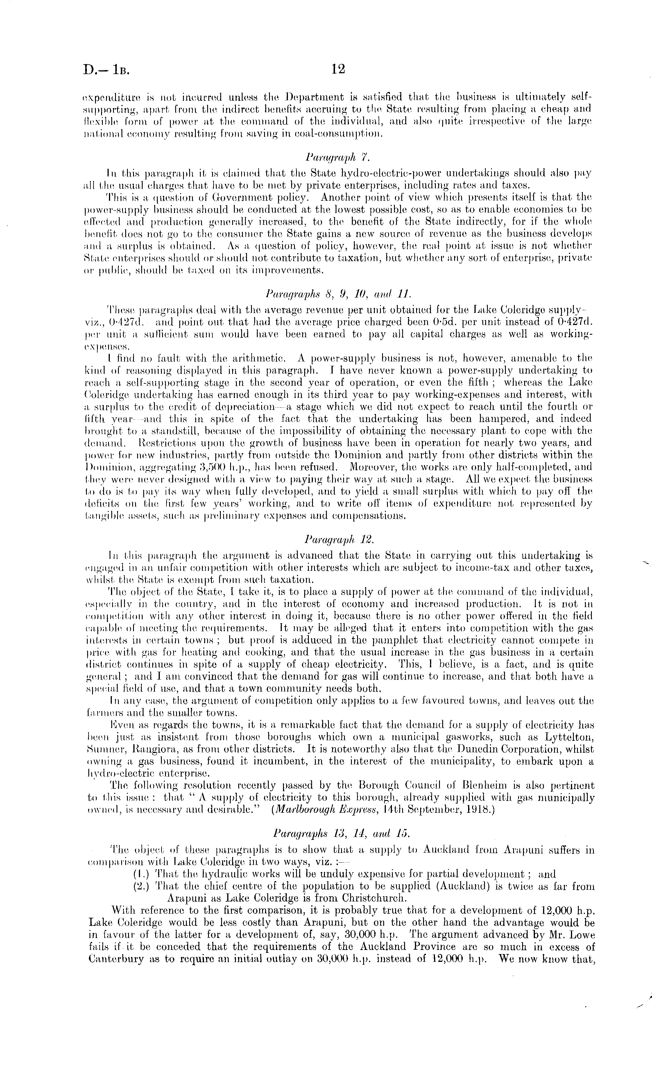 expenditure is not incurred unless the Department is satisfied that the business is ultimately selfsupporting, apart from the indirect benefits accruing to the State resulting from placing a cheap and flexible form of power at the, command of the individual, and also quite irrespective of the large, national economy resulting from saving in coal-consumption. Paragraph 7. In this paragraph if is claimed that the State hydro-oleetrie-power undertakings should also pay all the usual charges that have to be met by private enterprises, including rates and taxes. This is a, question of Government policy. Another point of view which presents itself is that the, power-supply business should be conducted at the lowest possible cost, so as to enable economies to be effected and production generally increased, to the benefit of the State indirectly, for if the whole benefit does not go to the consumer the, State gains a new source of revenue as the business develops and a, surplus is obtained. As a question of policy, however, the real point at issue, is not whether State enterprises should or should not contribute to taxation, but whether any sort of enterprise, private m- public, should be taxed on its improvements. Paragraphs S, 9, 10, and 11. These paragraphs deal with the average, revenue per unit obtained for the Lake Coleridge supply viz., 0-127 d. and point out that had the average price charged been 0-sd. per unit instead of 0-427 d. per unit a sufficient sum would have been earned to pay all capita] charges as well as workingexpenses. I find no fault: with the arithmetic, A power-supply business is not,, however, amenable to the kind of reasoning displayed in this paragraph. I have never known a, power-supply undertaking to reach a self-supporting stage in the second year of operation, or even the fifth ; whereas the Lake Coleridge undertaking has earned enough in its third year to pay working-expenses and interest, with a surplus to the, credit of depreciation a stage which we did not expect to reach until the fourth or fifth year and this in spite of the fact that the undertaking has been hampered, and indeed brought to a standstill, because of the impossibility of obtaining the necessary plant to cope with the demand. Restrictions upon the growth of business have, been in operation for nearly two years, and power for new industries, partly from outside the Dominion and partly from other districts within the Dominion, aggregating 3,500 h.p., has been refused. Moreover, the works are only half-completed, and they were never designed with a view to paying their way at such a stage. All we expect the, business Io do is to pay its way when fully developed, and to yield a small surplus with which to pay oil the deficits on the first few years' working, and to write, oil items of expenditure not represented by tangible assets, such as preliminary expenses and compensations. Paragraph, 12. In this paragraph the argument is advanced that the State in carrying out this undertaking is engaged in an unfair competition with other interests which are subject to income-tax and other taxes, whilst the State is exempt from such taxation. The, object of the State, I take it, is to place a, supply of power at the command of the individual, especially in the country, and in the interest of economy and increased production. It is not in competition with any other interest in doing it, because there is no other power offered in the field capable of meeting the requirements. It may be alleged that it enters into competition with the gas interests in certain towns ; but, proof is adduced in the pamphlet that electricity cannot compete in price with gas for heating and cooking, and that the usual increase in the gas business in a certain district continues in spite of a, supply of cheap electricity. This, I believe, is a, fact, and is quite general ; and J am convinced that the demand for gas will continue to increase, and that both have a special held of use, and that a town community needs both. In any case, the argument of competition only applies to a few favoured towns, and leaves out the farmers and the smaller towns. Even as regards the towns, it is a, remarkable fact that the, demand for a supply of electricity has been just as insistent from those boroughs which own a municipal gasworks, such as Lyttelton, Sumner, Rangiora, as from other districts. It is noteworthy also that the Dunedin Corporation, whilst owning a gas business, found it incumbent, in the interest of the, municipality, to embark upon a hydro-electric enterprise. The following resolution recently passed by the Borough Council of Blenheim is also pertinent to this issue : that " A supply of electricity to this borough, already supplied with gas municipally owned, is necessary and desirable." (Marlborough Express, 14th September, 1918.) Paragraphs 13, 11, and 15. The object of these paragraphs is to show that, a, supply to Auckland from Arapuni suffers in comparison with Lake Coleridge in two ways, viz. :- (I.) That, the hydraulic works will bo unduly expensive for partial development ; and (2.) That the, chief centre of the population to be supplied (Auckland) is twice as far from Arapuni as Lake Coleridge is from Christchurch. With reference to the first comparison, it is probably true that for a development of 12,000 h.p. Lake Coleridge would be less costly than Arapuni, but on the other hand the advantage would be in favour of the latter for a development of, say, 30,000 h.p. The argument advanced by Mr. Lowe fails if it be conceded that the requirements of the Auckland Province are so much in excess of Canterbury as to require an initial outlay on 30,000 h.p. instead of 12,000 h.p. We now know that,