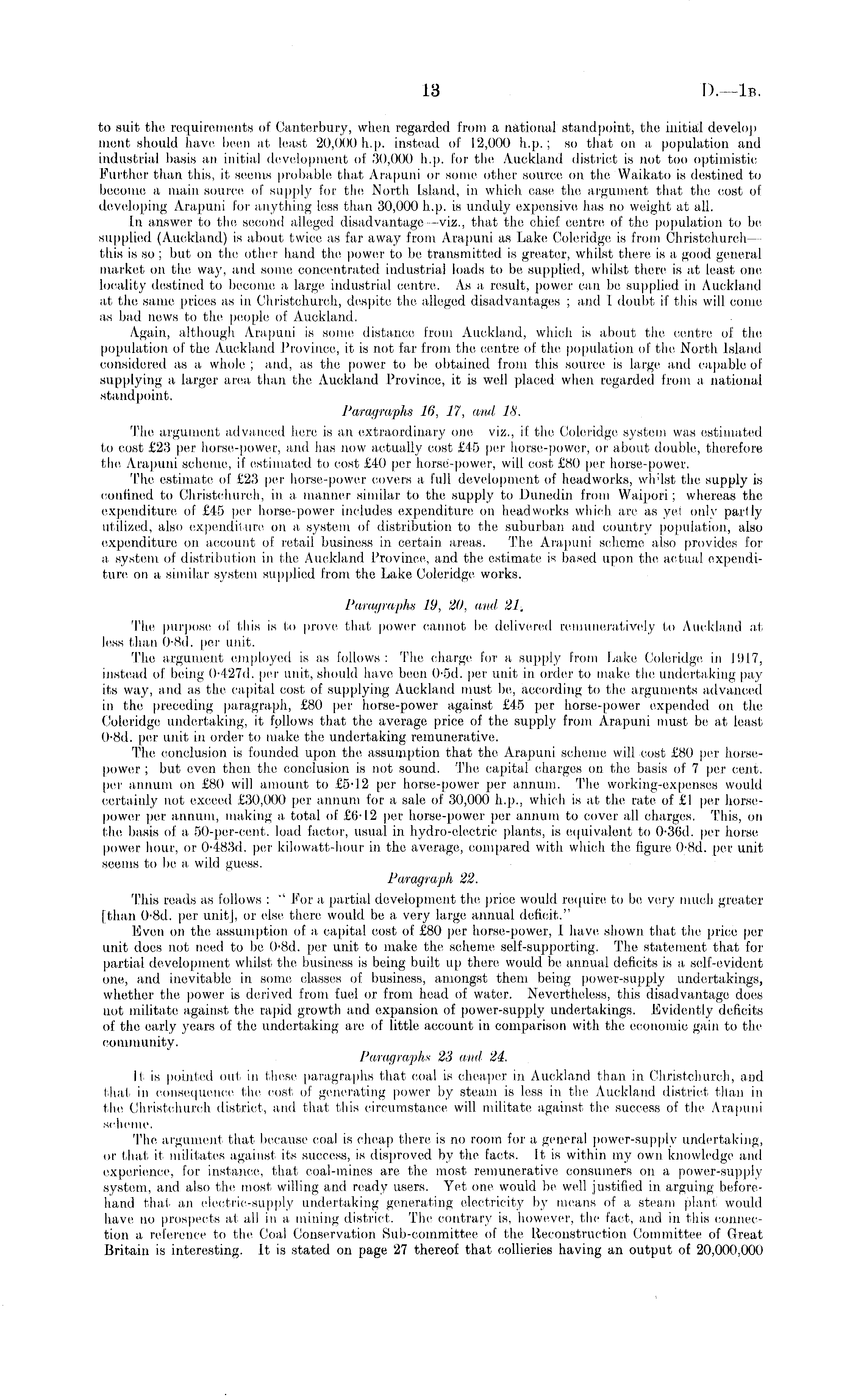 to suit the, requirements of Canterbury, when regarded from a national standpoint, the initial develop merit should have been at least 20,000 h.p. instead of 12,000 h.p.; so that on a population and industrial basis an initial development of 30,000 h.p. for the Auckland district is not too optimistic Further than this, it seems probable that .Arapuni or some other source on the Waikato is destined to become a, main source of supply for the North Island, in which case the, argument that the cost of developing Arapuni for anything less than 30,000 h.p. is unduly expensive has no weight at all. In answer to the second alleged disadvantage viz., that the chief centre of the population to be supplied (Auckland) is about twice as far away from Arapuni as Lake Coleridge is from Christehurchthis is so ; but on the other hand the power to be transmitted is greater, whilst there, is a good general market on the way, and some concentrated industrial loads to be supplied, whilst there is at least one locality destined to become a large industrial centre. As a, result, power can be supplied in Auckland at the same prices as in Christchurch, despite the alleged disadvantages ; and I doubt if this will come as bad news to the people, of Auckland. Again, although Arapuni is some distance from Auckland, which is about the centre of the population of the Auckland Province, it is not far from the centre of the population of the North Island considered as a whole; and, as the power to be obtained from this source is large and capable of supplying a larger area than the Auckland Province, it is well placed when regarded from a national standpoint. Paragraphs 16, 17, a ltd 18, The argument advanced here is an extraordinary one, viz., if the Coleridge system was estimated to cost £23 per horse-power, and has now actually cost £45 per horse-power, or about double, therefore (lie Arapuni scheme, if estimated to cost £40 per horse-power, will cost £80 per horse-power. The estimate, of £23 per horse-power covers a full development of headworks, wh'lst the supply is confined to Christchurch, in a manner similar to the supply to Dunedin from Waipori ; whereas the, expenditure of £45 per horse-power includes expenditure on headworks which are as yet only partly utilized, also expenditure on a system of distribution to the suburban and country population, also expenditure on account of retail business in, certain areas. The Arapuni scheme also provides for a, system of distribution in the Auckland Province, and the estimate is based upon the. actual expenditure on a similar system supplied from the Lake Coleridge works. Paragraphs 19, 20. and 21. The purpose of this is to prove that power cannot be delivered remuneratively to Auckland at less than 0-Bd. per unit. The argument employed is as follows: The charge for a, supply from Lake Coleridge in 1917, instead of being 0-127(1. per unit, should have been 0-5(1. per unit in order to make the undertaking pay its way, and as the capital cost of supplying Auckland must be, according to the arguments advanced in the preceding' paragraph, £80 per horse-power against £45 per horse-power expended on the Coleridge undertaking, it follows that the average price of the supply from Arapuni must be at least 0-Bd. per unit in order to make the undertaking remunerative. The conclusion is founded upon the assumption that the Arapuni scheme will cost £80 per horsepower ; but even then, the conclusion is not sound. The capita,! charges on the basis of 7 per cent, per annum on £80 will amount to £5-12 per horse-power per annum. The working-expenses would certainly not exceed £30,000 per annum for a sale of 30,000 h.p., which is at the rate of £1 per horsepower per annum, making a, total of £6-12 per horse-power per annum to cover all charges. This, on the basis of a 50-per-cenf. load factor, usual in hydro-electric plants, is equivalent to 0-36(1. per horse power hour, or 0483 d. per kilowatt-hour in the average, compared with which the figure 0-Bd. per unit seems to be a, wild guess. Paragraph 22. This reads as follows : " For a partial development the price would require to be very much greater [than 0-Bd. per unit], or else there would be a very large annual deficit." Even on the assumption of a capital cost of £80 per horse-power, 1 have shown that the price per unit does not need to be 0-Bd. per unit to make the scheme self-supporting. The statement that for partial development whilst the business is being built up there would be annual deficits is a self-evident one, and inevitable in some, classes of business, amongst them being power-supply undertakings, whether the power is derived from fuel or from head of water. Nevertheless, this disadvantage does not militate against the rapid growth and expansion of power-supply undertakings. Evidently deficits of the early years of the undertaking are of little account in comparison with the economic gain to the community. Paragraphs 23 anil 24. It is pointed out- m these paragraphs that- coal is cheaper in Auckland than in Christchurch, and that in consequence the cost- of generating power by steam is less in the Auckland district than in the Christchurch district, and that this circumstance will militate against the success of the Arapuni scheme. The argument that because coal is cheap there is no room for a general power-supply undertaking, or thai it militates against its success, is disproved by the facts. It is within my own knowledge and experience, for instance, that coal-mines are the most- remunerative consumers on a power-supply system, and also the most willing and ready users. Yet one would lie well justified in arguing beforehand that, an electric-supply undertaking generating electricity by means of a steam plant would have no prospects at all in a, mining district. The contrary is, however, the fact-, and in this connection a reference to the Coal Conservation Sub-committee of the Reconstruction Committee of