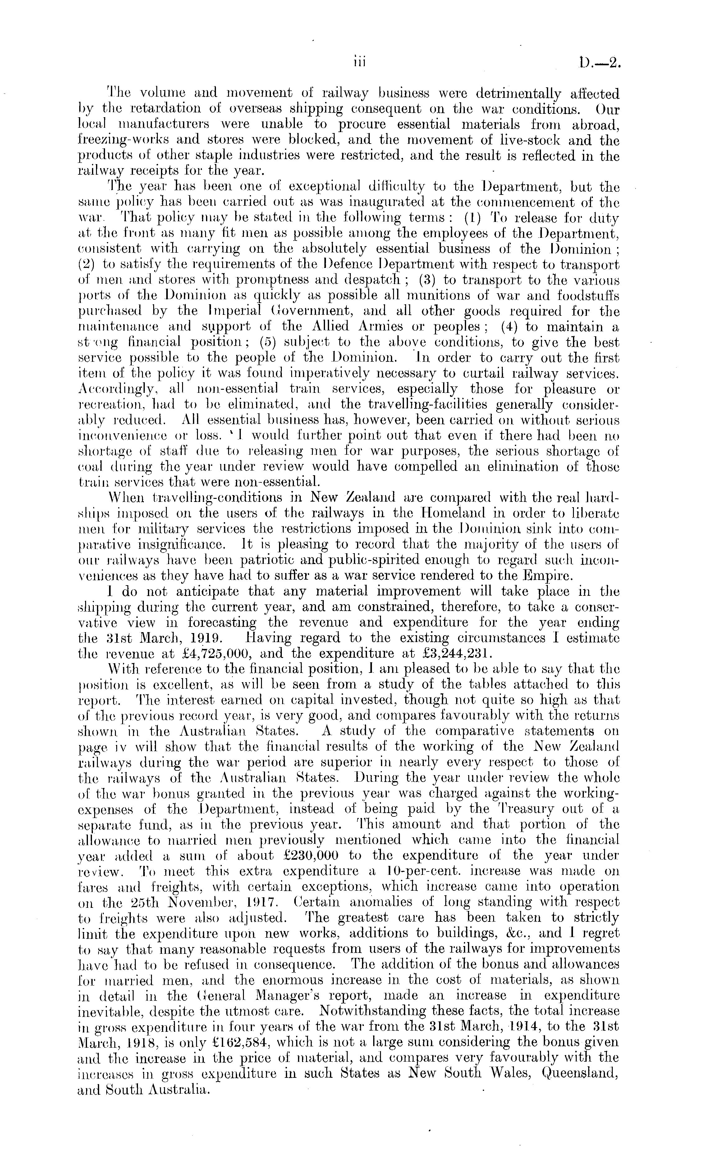 The volume and movement of railway business were detrimentally affected by the retardation of overseas shipping consequent em the war conditions. Our local manufacturers were unable to procure essential materials from abroad, freezing-works and stores were blocked, and the movement of live-stock and the products of other staple industries were restricted, and the result is reflected in the railway receipts for the year. The year has been one eif exceptional difficulty to the Department, but the same policy has been carried out as was inaugurated at the commencement of the war. That policy may be stated in the following terms : (I) Tei release for duty at the front as many fit men as possible among the employees of the Department, consistent with carrying on the absolutely essential business eif the Dominion ; (2) to satisfy the requirements of the Defence Department with respect to transport of men and stores with promptness and despatch ; (3) to transport to the various ports of the Dominion as (prickly as possible all munitions of war and foodstuffs purchased by the Imperial Government, and all other goods required for the maintenance and support eif the Allied Armies or peoples ; (4) to maintain a st.'ong financial position; (5) subject to the above conditions, tei give the best service possible to the people eif the Dominion. In order to carry out the first item of the policy it was found imperatively necessary to curtail railway services. Accordingly, all non-essential train services, especially those for pleasure or recreation, had tei be eliminated, and the travelling-facilities generally considerably reduced. All essential business has, however, been carried on without serious inconvenience e>r loss. VI would further point out that even if there had been no shortage eif staff due to releasing men for war purposes, the serious shortage of coal during the year under review would have compelled an elimination of those train services that were non-essential. When travelling-conditions in New Zealand are compared with the real hardships imposed on the users of the railways in the Homeland in order to liberate men for military services the restrictions imposed in the Dominion sink into comparative insignificance. It is pleasing to record that the majority of the users of our railways have been patriotic and public-spirited enough tei regard such, inconveniences as they have had to suffer as a war service rendered to the Empire. I do not anticipate that any material improvement will take place in the shipping during the current year, and am constrained, therefore, to take a conservative view in forecasting the revenue and expenditure for the year ending the 31st March, 1919. Having regard to the existing circumstances 1 estimate the revenue at £4,725,000, and the expenditure at £3,244,231. With reference to the financial position, J am pleased to be able to say that the position is excellent, as will be seen from a study of the tables attached to this report. The interest earned on, capital invested, though, not quite so high as that of the previous record year, is very good, and compares favourably with the returns shown in. the Australian States. A. study of the comparative statements on page iv will show that the financial results of the working of the New Zealand railways during the war period are superior in nearly every respect to those of the railways of the Australian States. .During the year under review the whole of the war bonus granted in the previous year was charged against the workingexpenses of the .Department, instead of being paid by the Treasury out of a separate fund, as in the previous year. This amount and. that portion of the allowance to married men previously mentioned which came into the financial year added a sum of about £230,000 to the expenditure of the year under review. 'I 1*) meet this extra expenditure a 10-per-cent. increase was made on. fares anel freights, with certain exceptions, which increase came into eiperation em the 25th November, 1917. Certain anomalies of long standing with, respect to freights were alsei adjusted. The greatest care has been taken to strictly limit the expenditure upon new works, additions to buildings, &c, and 1 regret to say that many reasonable requests from users of the railways for improvements have had to be refused in consequence. The addition of the bonus and allowances for married, men, arid the enormous increase in the cost of materials, as shown in detail in the General Manager's report, made an, increase in expenditure inevitable, despite the utmost care. Notwithstanding these facts, the total, increase in gross expenditure in, four years of the war from the 31st March, 1914, to the 31st March, 1918, is only £162,584, which is not a large sum considering the bonus given and the increase in the price of material, and compares very favourably with the increases in gross expenditure in such States as New South Wales, Queensland, and South Australia.