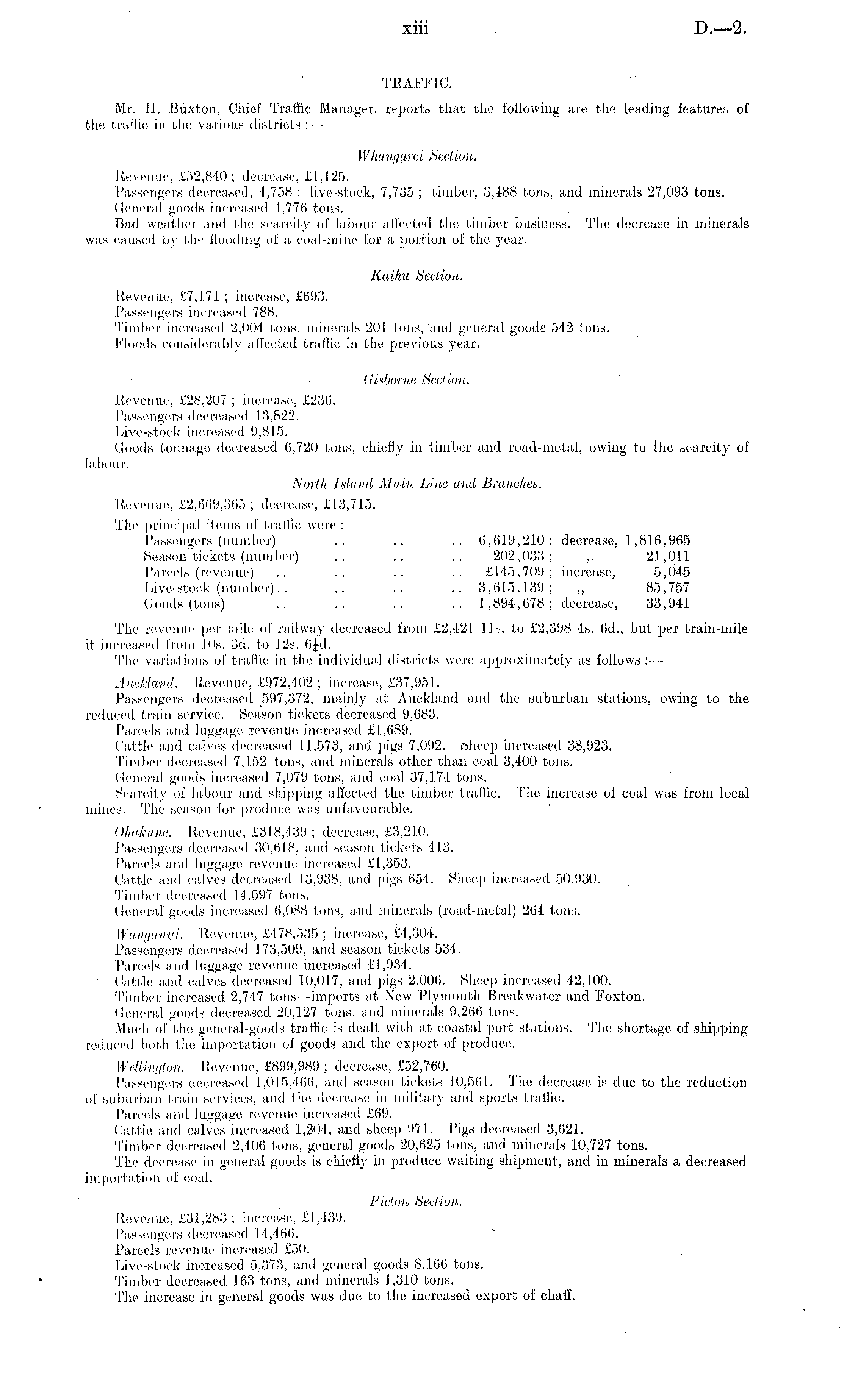 TRAFFIC. Mr. H. Buxton, Chief Traffic Manager, reports that the following are the leading features of the traffic in the various districts : Whangarei Section. Revenue, £52,840; decrease, £1,125. Passengers decreased, 4,758 ; LiVe-stock, 7,735 ; timber, 3,488 tons, and minerals 27,093 tons. General goods increased 4,776 tons. Bad weather and the scarcity of labour affected the timber business. The decrease in minerals was caused b}' the flooding of a coa.l-n.iinc for a portion of the year. Kailm Section. Revenue, £7,171 ; increase, £693. Passengers increased 788. Timber increased 2,004 tons, minerals 201 tons, anel general goods 542 tons. Fleiods considerably affected traffic in the previous year. Gisborne Section. Revenue, £28,207 ; increase, £236. Passengers decreased 13,822. Live-stock increased 9,815. Goods tonnage decreased (i,720 tons, chiefly in timber anel road-metal, owing to the scarcity of labour. North. Island Main Line and Brandies. Revenue, £2,669,365 ; decrease, £13,715. The- principal items of traffic were :— Passengers (number) .. .. .. 6,619,210; decrease, 1,816,965 Season tickets (number) .. .. .. 202,033; „ 2LOII Parcels (revenue) .. .. .. .. £145.709; increase, 5,045 Live-stock (number).. .. .. .. 3.615.139; „ 85,757 Goods (tons) .. .. .. .. 1,894,678; decrease, 33,941 The revenue per mile of railway decreased from £2,421 I Is. to £2,398 Is. (id., but per train-mile it increased from 10s. 3d. to 12s. 6jd, The variations of traffic in the individual districts were approximately as follows : - Auckland. Revenue, £972,402 ; increase-, £37,951. Passengers decreased 597,372, mainly at Auckland anel the suburban stations, owing to the reduced train service. Season tickets decreased 9,683. Parcels and luggage revenue increased £1,689. Cattle anel calves decreased 11,573, and pigs 7,092. Sheep increased 38,923. Timber decreased 7,152 tons, anel minerals either than coal 3,400 tons. General geiods increased 7,079 tons, and coal 37,174 terns. Scarcity eif labour and shipping affected the timber traffic. The increase of coal was from local mines. The season for produce was unfavourable. Ohakune. —Revenue, £318,139; decrease, £3,210. Passengers decreased 30,618, and seaseui tickets 113. Parcels and luggage revenue increased £1,353. Cattle and calves decreased 13,938, and pigs 654. Sheep increased 50,930. Timber decreased 14,597 tons. General goods increased 6,088 tons, and minerals (road-metal) 264 tons. Wanganui.- -- Revenue-, £478,535; increase, £4,304. Passengers decreased 173,509, and season tickets 534. Parcels and luggage revenue: increased £1,934. Cattle anel calves decreased 10,017, and pigs 2,006. Sheep increased 42,100. Timber increased 2,747 tons imports at New Plymouth Breakwater and Foxton. Genera] goods decreased 20,127 tons, and minerals 9,266 tons. Much of the general-goods traffic is dealt with at coastal port stations. The shortage of shipping reduced both the importation eif goods and the export of produce. Wellington.— Revenue, £899,989 ; decrease, £52,760. Passengers decreased 1,015,466, and season tickets 10,561. The- decrease is due to the reduction of suburban train services, and the decrease in military and sports traffic. Parcels and luggage: revenue increased £69. Cattle and calves increased 1,204, and sheep 971. Pigs decreased 3,621. Timber decreased 2,406 tons, general goods 20,625 tons, anel minerals 10,727 tons. The decrease in general goods is chiefly in produce waiting shipment, and in minerals a decreased importation of coal. Picton Section. Revenue, £31,283; increase, £1,139. Passengers decreased 14,466. Parcels revenue increased £50. Live-stock increased 5,373, anil genera] goods 8,166 tons. Timber decreased 163 tons, and minerals 1,310 tons. The increase in general goods was due to the increased export of chaff.