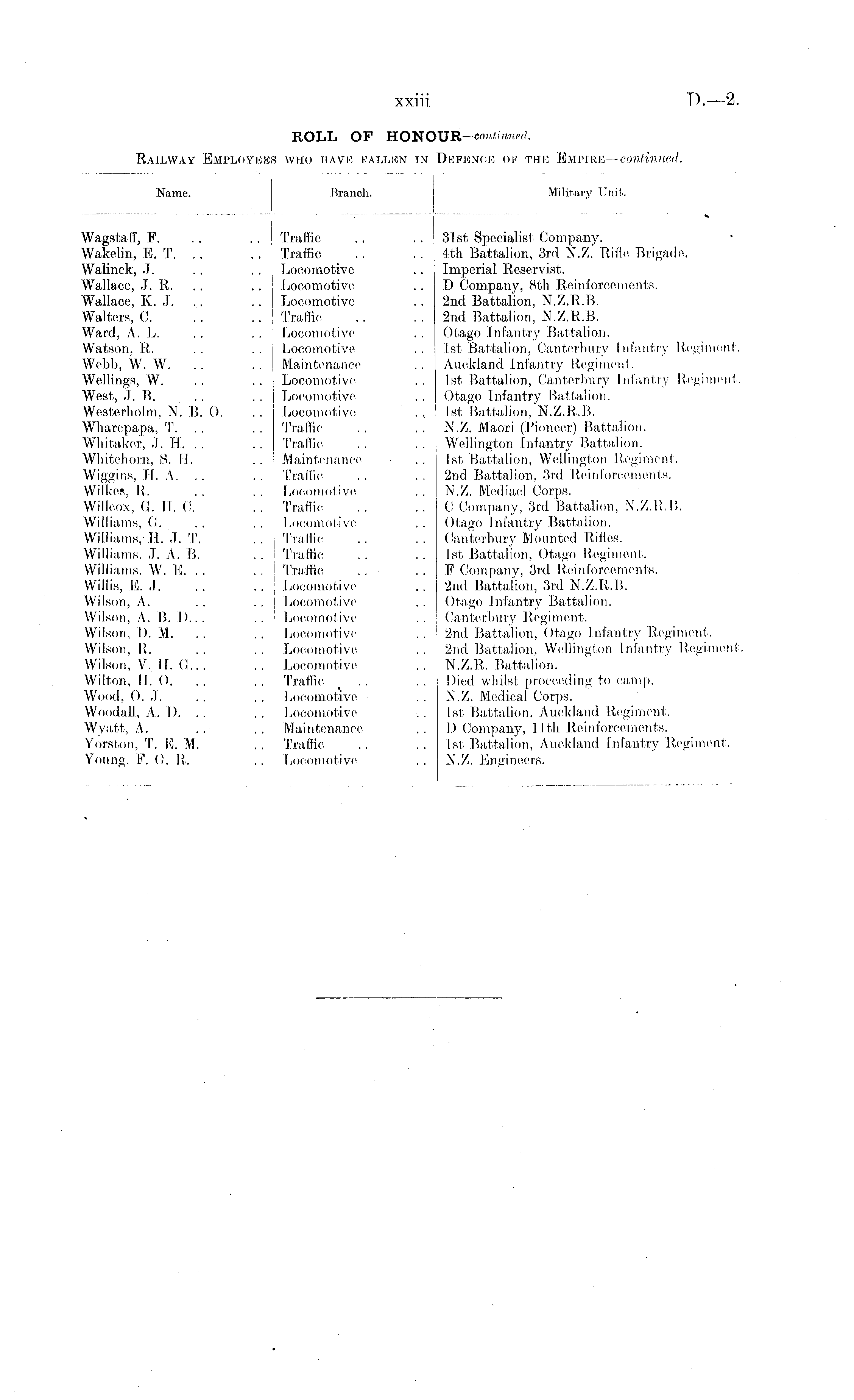 Name. Branch. Military Unit. .. Wagstaff, F. Wakelin, E. T. .. Walinck, J. Wallace, J. R. .. Wallace, K. J. .. Walters, C. Ward, A. L. Watson, R. Webb, W. W. Wellings, W. West, J. B. Westerholm, N. 15. O. Wharepapa, T. Whitakor, .1. If. .. Whifehorn, S. II. Wiggins, II. A. .. Wilkes, R. Willc-ox. G. If. C. Williams, G. Williams, II. J. T. Williams, J. A. 15. Williams, W. E. . . Willis, E. J. Wilson, A. Wilson. A. 15. D... Wilson, I). M. .. Wilson, R. Wilson, V. II. G... Wilton, II. O. .. Wood, 0. J. Woodall, A. I). .. Wvaft, A. Yorston, T. E. M. Young, F. G. R. .. Traffic .. Traffic, Locomotive Locomotive Locomotive . . Traffic .. ' Locomotive Locomotive Maintenance Locomotive Locomotive, Locomotive .. Traffic .. Traffic Maintenance , , Traffic Locomol ive .. Traffic Locomotive .. Traffic .. Traffic .. Traffic .. ■ .. ! Locomotive .. I Locomotive .. 1 Locomotive Locomotive Locomotive Locomotive .. Traffic . .. Locomotive Locomotive Maintenance .. Traffic Locomotive 31st Specialist Company. 4th Battalion, 3rd N.Z. Rifle Brigade. Imperial Reservist. D Company, 8th Reinforcements. 2nd Battalion, N.Z.R.B. 2nd Battalion, N.Z.R.B. Otago Infantry Battalion. 1st Battalion, Canterbury [nfantry Regiment, Auckland Infantry Regiment. 1st Battalion, Canterbury [nfantry Regimenl Otago Infantry Battalion. 1st Battalion, N.Z.R.B. N.Z. Maori (Pioneer) Battalion. Wellington Infantry Battalion. 1st Battalion, Wellington Regimenl, 2nd Battalion. 3rd Reinforcements. N.Z. Mediae! Corps. C Company, 3rd Battalion, N.Z.R.B. Otago Infantry Battalion. Canterbury Mounted Rides. 1st Battalion. Otago Regiment, F Company, 3rd Reinforcements. 2nd Battalion, 3rd N.Z.R.B. Otago Infantry Battalion. Canterbury Regiment, 2nd Battalion, Otago [nfantry Regiment. 2nd Battalion, Wellington [nfantry Regimenl N.Z.R. Battalion. Died whilst proceeding to camp. N.Z. Medical Corps. 1st Battalion, Auckland Regiment. I) Company, Llth Reinforcements. 1st Battalion, Auckland [nfantry Regiment. N.Z. Engineers.