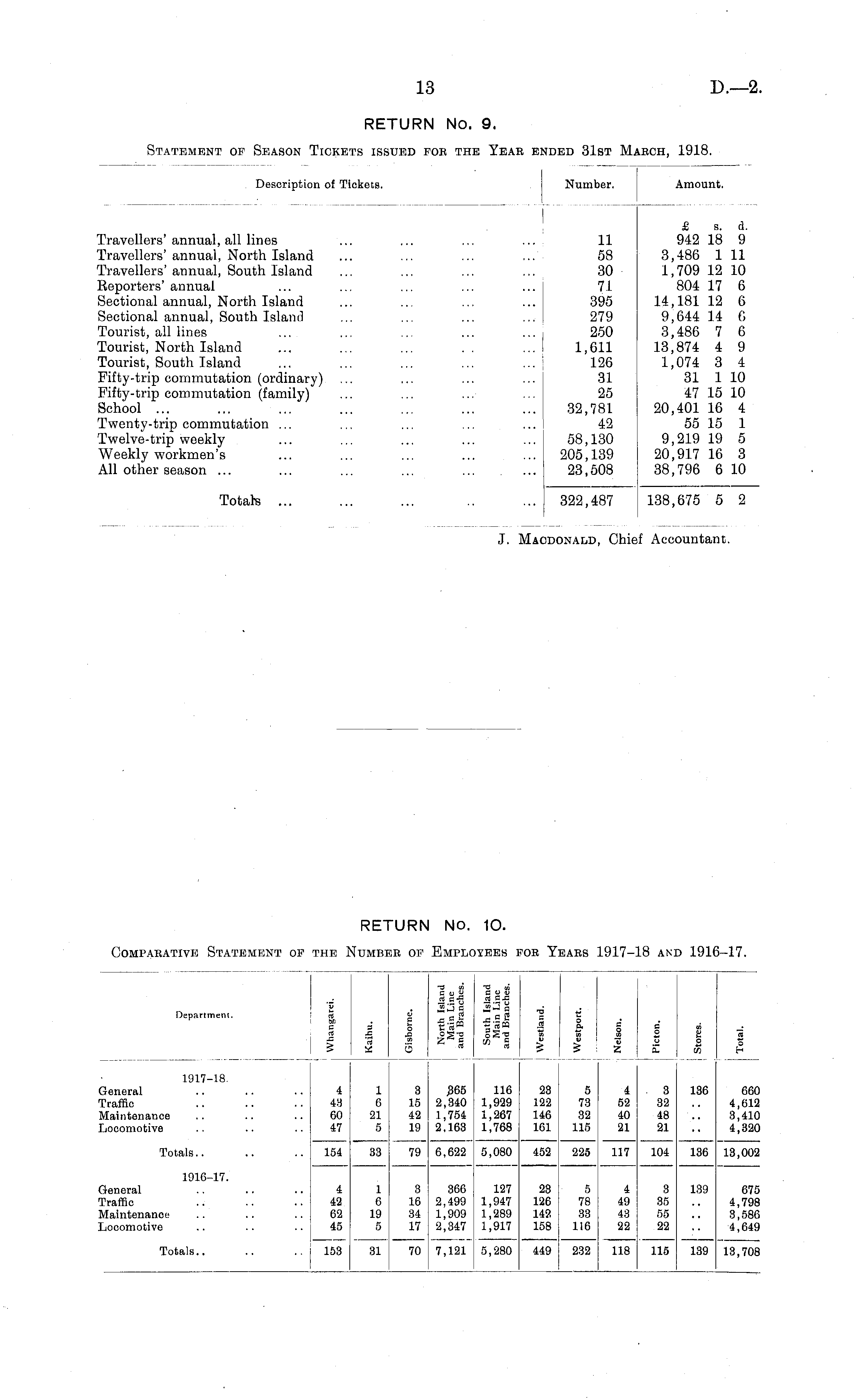 Description of Tickets. Number. Amount. Travellers' annual, all lines Travellers' annual, North Island Travellers' annual, South Island Eeporters' annual Sectional annual, North Island Sectional annual, South Island Tourist, all lines ... Tourist, North Island Tourist, South Island Fifty-trip commutation (ordinary) Fifty-trip commutation (family) School ... Twenty-trip commutation ... Twelve-trip weekly Weekly workmen's All other season ... ... 11 58 30 71 395 279 250 1,611 126 31 25 32,781 42 58,130 205,139 23,508 £ s. d. 942 18 9 3,486 1 11 1,709 12 10 804 17 6 14,181 12 G 9,644 14 6 3,486 7 6 13,874 4 9 1,074 3 4 31 1 10 47 15 10 20,401 16 4 55 15 1 9,219 19 5 20,917 16 3 38,796 6 10 Totals ... 322,487 322,487 138,675 5 2 J. Maod IDONALD, Chil )ONALD, Chi if Accountant.
