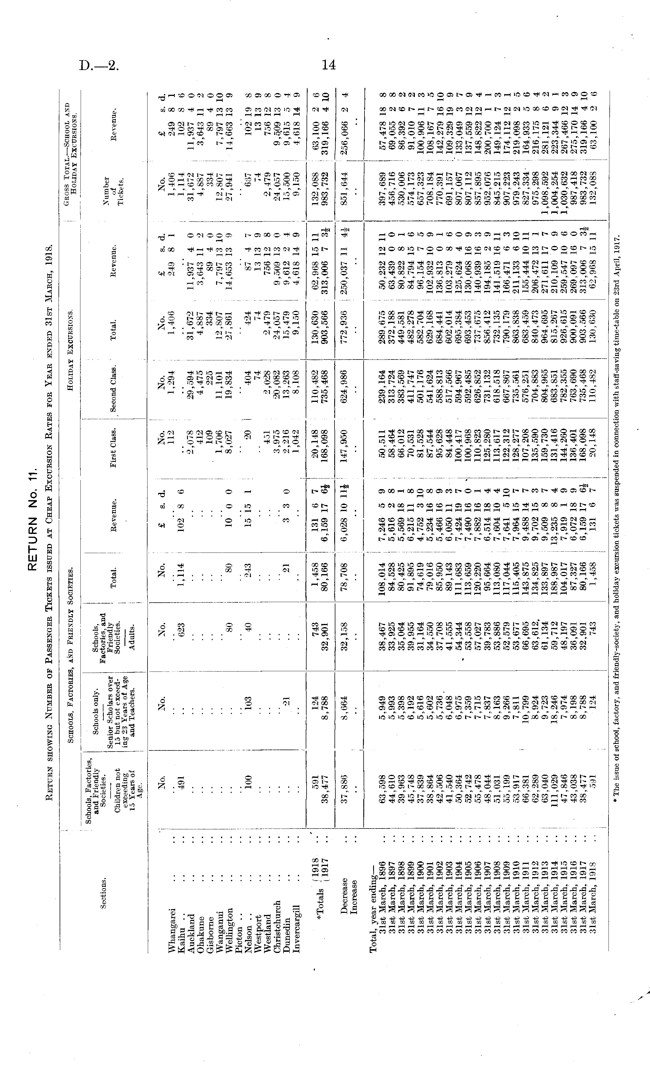 Schools, Factories, and Friendly Societies. Holiday Excursions. Gross Total. —School and Holiday Excursions. Sections. Schools, Factories, and Friendiy Societies. Children not exceeding 15 Years of Age. Schools only. Schools, Factories, and Senior Scholars over Friendly 15 but not exceed- Societies. ing 23 Years of Age and Teachers. Adults. Total. Revenue. First Class. _ Second Class. Total. Revenue. Xumber of Tickets. Revenue. Whangarei Kaihu Auckland Ohakune Gisborne Wanganui Wellington Picton Nelson Westport Westland Christchurch Dunedin Invercargill No. 491 No. No. 623 No. 1,114 £ s. d. 102 8 6 10 0 0 No. 112 2,078 412 109 1,706 8,027 No. 1,294 29,594 4,475 225 11,101 19,834 No. 1,406 31,672 4,887 334 12,807 27,861 £ s. d. 249 8 1 11,937 4 0 3,643 11 2 89 4 0 7,797 13 10 14,653 13 9 No. 1,406 1,114 31,672 4,887 334 12,807 27,941 £ s. d. 249 8 1 102 8 6 11,937 4 0 3,643 11 2 89 4 0 7,797 13 10 14,663 13 9 80 80 100 103 40 243 15 15 1 3" 3 0 20 451 3,975 2,216 1,042 404 74 2,028 20,082 13,263 8,108 424 74 2,479 24,057 15,479 9,150 87 4 7 13 13 9 756 12 8 9,509 13 0 9.612 2 4 4,618 14 9 667 74 2,479 24,057 15,500 9,150 102 19 8 13 13 9 756 12 8 9,509 13 0 9,615 5 4 4,618 14 9 •21 21 i „ , . 11918 -Totals - 1917 591 38,477 124 8,788 743 32,901 1,458 80,166 131 6 7 6,159 17 6$ I 20,148 168,098 110,482 735,468 130,630 903,566 ; 62,968 15 11 313,006 7 3J 132,088 983,732 63,100 2 6 319,166 4 10 Decrease Increase 37,886 8,664 32,158 78,708 6,028 10 11J 147,950 624,986 772,936 250,037 11 4J 851,644 256,066 2 4 Total, year ending — 31st March, 1896 31st March, 1897 31st March, 1898 31st March, 1899 31st March, 1900 31st March, 1901 31st March, 1902 31st March, 1903 31st March, 1904 31st March, 1905 31st March, 1906 31st March, 1907 31st March, 1908 31st March. 1909 31st March, 1910 31st March, 1911 31st March, 1912 31st March, 1913 31st March, 1914 31st March, 1915 31st March, 1916 31st March, 1917 31st March, 1918 63,598 44.610 39.963 45,748 37,839 38.864 42,506 41,540 50.364 52,742 55,478 48.044 51.031 55,199 53.917 66.381 62.289 63,040 111,029 47,846 43,038 38,477 591 5,949 5,993 5,398 6,192 5,616 5,602 5,736 6,048 6,975 7,359 7,715 7,837 8,163 9,266 7,811 10,799 8,924 9,723 18,246 7,974 8,198 8,788 124 38,467 33,925 35,064 39,955 31,164 34,550 37,708 41,555 54,344 53,558 57,027 39,783 53,886 52,579 53,677 66.695 63,612. 61,134 59,712 48,197 36.091 32,901 743 108,014 7,246 5 9 84,528 5,616 2 8 80.425 5,569 18 1 91,895 6,215 11 8 74,619 4,752 3 10 79,016 5,234 16 8 85,950 5,466 16 9 89,143 6,050 11 3 111,683 7,424 19 7 113,659 7,490 16 0 ' 120,220 7,882 16 1 95,664 6,514 18 4 113,080 7,604 10 4 117,044 7,641 5 10 115,405 7,964 15 7 143,875 9,488 14 7 134,825 9.702 15 3 133,897 9,509 8 7 188,987 13,235 8 4 104,017 7,919 1 9 87,327 6,072 18 9 80,166 6,159 17 6J 1,458 131 6 7 50,511 58,464 66,012 70,531 81,528 87,544 95,628 84,448 100,417 100,968 110,823 125,280 113,617 122,312 128,277 107,208 135,590 159,730 131,416 144,260 136,401 168,098 20,148 239,164 313,724 383,569 411,747 501,176 541,624 588,813 517,566 594,967 592,485 626.852 731,132 618.518 667,867 735,561 576,251 704,883 804,965 683,851 782,355 763,690 735,468 110,482 289,675 50.232 12 11 372,188 63,439 0 0 449,581 I 80,822 8 1 482,278 84,794 15 6 582,704 j 96,154 7 5 629,168 102.932 10 9 684,441 136,813 0 1 602,014 : 103,279 8 6 695,384 I 125,624 4 0 693.453 130,068 16 9 737.675 140,939 16 3 856,412 194,185 2 9 732,135 141,519 16 11 790,179 166,471 6 3 863.838 211,133 6 10 683,459 i 155,444 10 11 840,473 ! 206,472 13 1 964,695 271,611 17 7 815,267 210,109 0 9 926,615 259,547 10 6 900,091 269,097 16 0 903.566 313,006 7 3J 130,630 62,968 15 11 397,689 57,478 18 8 456,716 69,055 2 8 530,006 86.392 6 2 574,173 91,010 7 2 657,323 100,906 11 3 708.184 108,167 7 5 770,391 142,279 16 10 691,157 109,329 19 9 807,067 '133,049 3 7 807,112 ! 137.559 12 9 857,895 148,822 12 4 952,076 200,700 1 1 845,215 149.124 7 3 907,223 j 174,112 12 1 979,243 219,098 2 5 827,334 164.933 5 6 975,298 216.175 8 4 1,098,592 j 281,121 6 2 1,004,254 223,344 9 1 1,030,632 267,466 12 3 987,418 275,170 14 9 983,732 : 319,166 4 10 132,088 i 63,100 2 6 * The issue of school, factory, and friendly-society, and holiday excursion tickets was suspended in connection with staff-saving time-table on 23rd April, 1917.