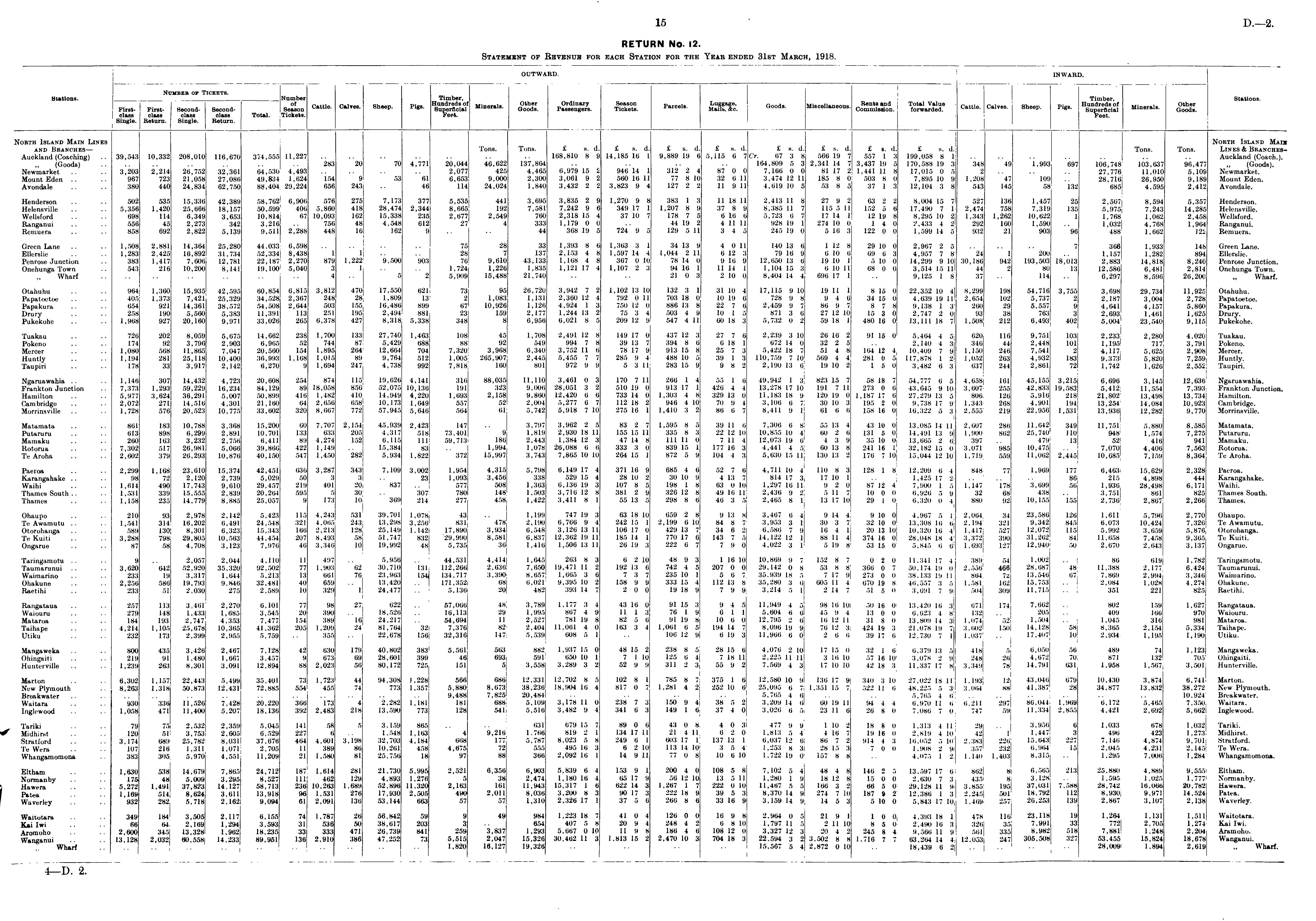 OUTWARD. INWARD. Number op Tickets. Stations. Number Timber, Timber, Stations. ol Pnttlff finlvna Sh««n Pins Hundreds of MinM .. ls Other Ordinary Season Parcels Luggage, Goods Miscellaneous Rents and Total Value f , . tl „ p..--- sw,, Hundreds of Other First- First- Second- Second- Season Cattle - Galve s. Sheep. Pigs. Su p erfloia i Minerals. Goods . Passengers. Tickets. Parcels. Mailt, &c. Goods. Miscellaneous. Commisaion forwarded. Cattle. Calves. Sheep. PigB. Superficial Minerals. GoodB. class class class class Total. Tickets. Feet. Feet. Single. Return. Single. Return. North Island Main Lines North Island Main and Branches — Tons. Tons. £ s. d. £ s. d. £ s. d. £ s. d. £ s. d. £ s. d. £ s. d. £ s. d. Tons. Tons. Lines & BranchesAuckland (Coaching) .. 39,543 10,332 208,010 116,670 374,555 11,227 .. .. .. .. .. .. .. 168,810 8 9 14,185 16 1 9,889 19 6 5,115 6 7 Cr. 67 3 8 566 19 7 557 1 3 199,058 8 1 .. .. .. .. .. .. Auckland (Coach.). (Goods) .. .. .. 283 20 70 4,771 20,044 46,622 137,864 .. .. .. .. 164,809 5 3 2,341 14 7 3,437 19 5 170,588 19 3 348 49 1,993 697 106,748 103,637 96,477 „ (Goods). Newmarket .. .. 3,203 2,214 26,752 32,361 64,530 4,493 .. .. .. .. 2,077 425 4,465 6,979 15 2 946 14 1 312 2 4 87 0 0 7,166 0 0 81 17 2 1,441 11 8 17,015 0 5 2 .. .. 27,776 11,010 5,109 Newmarket. Mount Eden .. .. 967 723 21,058 27,086 49,834 1,624 154 9 53 61 6,653 9,000 2,300 3,061 9 2 560 16 11 77 8 10 32 6 11 3,474 12 11 185 8 0 503 8 0 7,895 10 9 1,208 47 109 .. 28,716 26,950 9,189 Mount Eden. Avondale .. .. 380 440 24,834 62,750 88,404 29,224 656 243 .. 46 114 24,024 1,840 3,432 2 2 3,823 9 4 127 2 2 11 9 11 4,619 10 5 53 8 5 37 1 3 12,104 3 8 543 145 58 132 685 4,595 2,412 Avondale. Henderson .. .. 502 535 15,336 42,389 58,762 6,906 576 275 7,173 377 5,535 441 3,695 3,835 2 9 1,270 9 8 383 1 3 11 18 11 2,413 11 8 27 9 2 63 2 2 8,004 15 7 527 136 1,457 25 2,567 8,594 5,357 Henderson. Helens ville .. .. 5,356 1,420 25,666 18,157 50,599 406 5,860 418 28,474 2,344 8,665 192 7,581 7,242 9 6 349 17 1 1,207 8 9 37 8 9 8,385 11 7 115 5 11 152 5 6 17,490 7 1 2,474 758 7,319 135 5,975 7,243 14,285 Helensville. Wellsford .. .. 698 114 6,349 3,653 10,814 67 10,093 162 15,338 235 2,677 2,549 760 2,318 15 4 37 10 7 178 7 5 6 16 6 5,723 6 7 17 14 1 12 19 8 8,295 10 2 1,343 1,262 10,622 1 1,768 1,062 2,458 Wellsford. Ranganui .. .. 556 45 2,273 342 3,216 .. 756 48 4,548 612 27 4 333 1,179 0 0 .. 44 19 2 4 11 11 928 19 1 274 10 0 1 4 0 2,433 4 2 292 160 1,590 .. 1,032 4,768 1,964 Ranganui. Remuera .. .. 858 692 2,822 5,139 9,511 2,288 448 16 162 9 .. .. 44 368 19 5 724 9 5 129 5 11 3 4 5 245 19 0 5 16 3 122 p 0 1,599 14 5 932 21 903 96 488 1,662 12S Remuera. Green Lane .. •• 1,508 2,881 14,364 25,280 44,033 6,598 .. .. .. .. 75 28 33 1,393 8 6 1,363 3 1 34 13 9 4 0 11 140 13 6 1 12 8 29 10 0 2,967 2 5.. .. .. 7 366 1,933 148 Green Lane. Ellerslie .. .. 1,283 2,425 16,892 31,734 52,334 8,438 1 1.... 28 7 137 2,153 4 8 1,597 14 4 1,044 2 11 6 12 3 79 16 9 6 10 6 69 6 3 4,957 7 8 24 1 200 .. 1,157 1,282 894 Ellerslie. Penrose Junction .. 383 1,417 7,606 12,781 22,187 2,270 879 1,222 9,500 903 76 9,610 43,133 1,168 4 8 367 0 10 78 14 0 9 16 9 12,650 13 6 19 10 1 5 10 0 14,299 9 10 30,186 942 193,503 18,013 2,883 14,818 8,240 Penrose Junction. Onehunga Town .. 543 216 10,200 8,141 19,100 5,040 3 1.. .. 1,724 1,226 1,835 1,121 17 4 1,107 2 3 94 16 1 11 14 1 1,104 15 3 6 10 11 68 0 0 3,514 15 11 44 2 80 13 12,586 6,481 2,814 Onehunga Town. Wharf .. .. .. .. .. .... 4 5 2 5,909 15,488 21,740 .. .. 21 0 3 2 10 0 8,404 14 4 696 17 1 .. 9,125 1 8 37 114 .. 6,297 8,596 26,200 „ Wharf. Otahuhu .. .. 964 1,360 15,935 42,595 60,854 6,815 3,812 470 17,550 621 73 95 26,720 3,942 7 2 1,102 13 10 132 3 1 31 10 4 17,115 9 10 19 11 1 8 15 0 22,352 10 4 8,299 198 54,716 3,755 3,698 29,734 11,925 Otahuhu. Papatoetoe .. .. 405 1,373 7,421 25,329 34,528 2,367 248 28 1,809 13 2 1,083 1,131 2,360 12 4 792 0 11 703 18 0 10 19 6 728 9 8 9 4 6 34 15 0 4,639 19 11 2,654 102 5,737 2 2,187 3,004 2,728 Papatoetoe. Papakura .. .. 654 921 14,361 38,572 54,508 2,644 503 155 16,486 899 67 10,926 1,126 4,924 1 3 750 12 0 886 13 8 22 7 6 2,459 9 7 86 9 7 8 7 8 9,138 1 3 260 29 5,557 9 4,641 4,157 5,860 Papakura. Drury .. •• 258 190 5,560 5,383 11,391 113 251 195 2,494 881 23 159 2,177 1,244 13 2 75 3 4 503 4 9 10 1 5 871 3 6 27 12 10 15 3 0 2,747 2 0 93 38 763 3 2,693 1,461 1,625 Drury. Pukekohe .. .. 1,968 927 20,160 9,971 33,026 265 6,378 427 8,318 5,338 348 8 6,956 6,021 8 5 209 12 9 547 4 11 60 18 3 5,732 0 2 59 18 1 480 16 0 13,111 18 7 1,508 212 6,493 402 5,004 23,540 9,115 Pukekohe. Tuakau .. .. 726 202 8,059 5,675 14,662 238 1,700 133 27,740 1,463 108 45 1,708 2,491 12 8 149 17 0 437 12 3 27 7 6 2,239 3 10 26 16 2 91 15 0 5,464 4 5 620 116 9,751 103 2,233 2,280 4,020 Tuakau. Pokeno .. .. 174 92 3,796 2,903 6,965 52 744 87 5,429 688 88 92 549 994 7 8 39 13 7 394 8 6 6 18 1 672 14 0 32 2 5 .. 2,140 4 3 346 44 2,448 101 1,195 717 3,791 Pokeno. Mercer .. .. 1,080 568 11,865 7,047 20,560 154 1,895 264 12,664 704 7,320 3,968 6,340 3,752 11 6 78 17 9 913 15 8 25 7 3 5,422 18 7 51 4 8 164 12 4 10,409 7 9 1,150 246 7,541 2 4,117 5,625 2,908 Mercer. Huntly .. .. 1,194 281 25,118 10,400 36,993 1,168 1,015 89 9,764 512 1,005 265,907 2,445 5,455 7 7 285 9 4 488 10 5 39 1 3 110,759 7 10 569 4 4 281 0 5 117,878 1 2 1,052 263 4,932 183 9,373 5,820 7,259 Huntly. Taupiri .. .. 178 33 3,917 2,142 6,270 9 1,694 247 4,738 992 7,818 160 801 972 9 9 5 3 11 283 15 9 9 8 2 2,190 13 6 19 10 2 1 5 0 3,482 6 3 637 244 2,861 72 1,742 1,626 2,552 Taupiri. Ngaruawahia .. .. 1,146 307 14,432 4,723 20,608 254 874 115 19,626 4,141 316 88,035 11,110 3,461 0 3 170 7 11 266 1 4 55 1 6 49,942 1 3 823 15 7 58 18 7 54,777 6 5 4,658 161 45,155 3,215 6,696 3,145 12,636 Ngaruawahia. Frankton Junction .. 7,373 1,293 59,229 16,234 84,129 89 18,058 856 52,075 10,136 191 323 9,006 28,051 3 2 510 19 0 913 17 1 426 4 4 13,278 17 10 191 7 11 273 0 6 43,64
