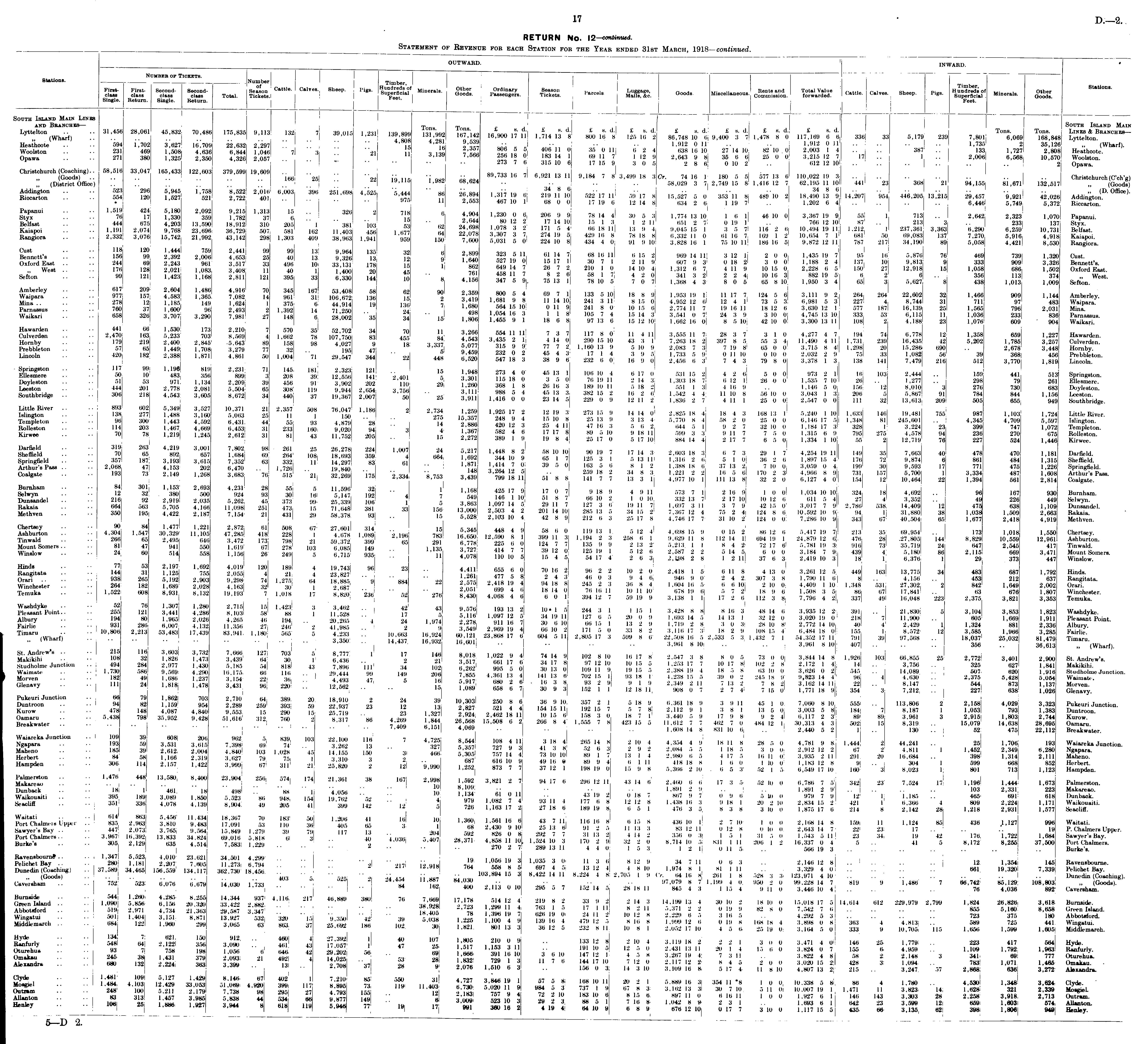 OUTWARD. INWARD. ' Number op Tickets. Stations. Number Timber, Timber First- First- Second- Second- Season Cattle - Calves. Sheep. Pigs, luuerflcia?' Min erals. Ordinary Season Parcels Luggage, f;1 nriB<.olln.nBnn« Rents and Total Value (< a ttie Calves Sheen Pics Hundreds of M - Other Stations. class class class class Total. Tickets. i pw Goods. Passengers. Tickets. Parcels. Mails, &c. Goods. Miscellaneous. Commiss i on . forwarded. battle. Calves. bheep. Pigs. Superficial Minerals. Goods. Single. Return. Single. Return. ' Feet. | | South Island Main Lines and Branches — T South Island Main Lyttelton .. .. 31,456 28,061 45,832 70,486 175,835 9,113 132 7 39 015 1 231 139 899 q Q9 .o . „ ,, , *,, d - £ s. d. £ s. d. £ s. d. £ s. d. £ s. d. £ s. d. Tons. Tons. Lines & Branches— (Wharf) .! ,U l ' iiV U . 9 '™ 131,992 l'J% ,W0 17 11 !' 714 13 8 800 1 6 8 125 16 2 86,748 10 6 9,400 3 7 1,478 8 0 117,169 6 6 336 33 5,179 239 7,801 6,069 168,848 Lyttelton. Heathoote .. •• 594 1,702 3,627 16,709 22,632 2,297 !! " " ,5 ,i _ _ •• A •• •• 1.912 0 11 .. .. 1,912 0 11 .. .. .. .. 1,735 2 35,126 „ (Wharf). Woolston .. 231 469 1,508 4,636 6,844 1,046 7 3 "21 11 , ,L n'fl £ ? 06 11 0 35 0 11 6 2 4 638 16 10 27 14 10 82 10 . 0 2,003 1 4.. .. 387 .. 133 1,727 2,808 Heathcote. Opawa .. .. 271 380 1,325 2 350 4 326 2 057 " ' 256 18 0 183 14 1 69 11 7 1 12 9 2,643 9 8 35 6 6 25 0 0 3,215 12 7 17 1 2,006 6,568 10,570 Woolston. " ■*' "• •• •• •• 273 7 6 315 10 6 17 15 9 3 0 5 2 8 6 0 10 2 612 12 10 .. .. .. .. 2 Opawa. Christchuroh (Coaching).. 58,516 33,047 165,433 122,603 379,599 19,609 .... .. on „„„ _ „ „ (Goods) .. .. .. .. .. .. X66 25 22 19 lift 1 Q89 ro koa > 6,921 13 11 9,184 7 8 3,499 18 3 Cr. 74 16 1 180 5 5 577 13 6 110,022 19 3 .. .. .. .. .. .. .. Christchurch(C'ch'g) „ (District Office) .. .. .. .. .. " ' 4 ' 982 68,624 .. .. .. 58,029 3 7 2,749 15 8 1,416 12 7 62,195 11 10 441 23 368 21 94,155 81,671 132,517 „ (Goods) SfflST ;; " 554 120 I',527 ''521 2*722 2 '2oV b '" 0,5 396 251,698 4,525 5,4 1 4 86 26 - 894 1.317 19 6 2191110 5221711 59'17 8 15,527 5 0 35311 8 489 10 2 18,490 13 9 14,'207 '954 446,205 13i215 29,457 '9,921 42,026 Addin^ton U ' 0ffiCt) ' •• 975 11 2 > 553 467 10 1 68 0 0 17 19 6. 12 14 8 634 2 6 1 19 7 .. 1,202 6 4.. .. .. .. 6,446 5,749 5,372 Riccarton. Papanm .. .. 1,519 424 5,180 2,092 9,215 1,313 15 .. 326 2 718 6 4,904 1,230 0 6 206 9 9 78 14 4 30 5 3 1,774 13 10 1 6 1 46 10 0 3,367 19 9 55 1 713 .. 2,642 2,323 1,070 Papanui. Belfast .. 444 675 4,203 13,590 18,912 310 205 1 381 K>3 53 " 62 24'fi98 l 07» ? o 4 0 J® 1 3 1 2 11 651 2 7 0 19 1 .. 766 12 10 87 .. 213 3 .. 233 137 Styx. Kaiapoi .. .. 1,191 2,074 9,768 23,696 36,729 507 581 162 11 403 456 1 677 64 It'oll '« I n n t 3 J! 4 13 9 4 9,045 15 1 3 5 7 116 2 6 10,494 19 11 1,212 1 237,361 3,363 6,290 6,259 10,731 Belfast. Rangiora .. .. 2,332 3,076 15,742 21,992 43,142 298 1,303 409 38 963 1 941 959 i,o 7mn K « I lit a 429 15 8 78 18 8 6,332 11 0 61 16 7 169 1 2 10,654 7 1 681 50 69,083 137 7,270 5,916 4,918 Kaiapoi. ' ' Jj9 150 "'600 5,031 5 0 224 10 8 434 4 0 91 9 10 3,828 16 1 75 10 11 18« 16 5 9,872 12 11 787 217 34,190 89 5,058 4,421 8,530 Rangiora. Bennett's !! " 156 2,006 4)653 25 40 13 9*326 ll 9 f'SS Ifl ,0 1, 1 £ *5 H " 15 2 969 14 11 3 12 1 2 0 0 1,435 19 7 95 16 5,876 76 469 739 1,320 Cust. Oxford East .. 244 69 2,243 961 3 517 33 496 10 33 131 178 15 ? , 2 15 \ „?° I 1 2 11 9 607 9 3 0 18 2 3 0 0 1,188 2 4 137 10 9,813 9 333 909 3,326 Bennett's. „ West .. 176 128 2,021 1,083 3 408 11 40 1 1 400 20 45 5S J? I 26 7 2 210 1 0 14 10 4 1,312 6 7 4 11 9 10 15 0 2,228 6 5 150 27 12,918 15 1,058 686 1,502 Oxford East. Sefton .. •• 99 121 1,423 1,168 2 811 121 395 33 6 330 144 10 " 8 $5 \ I ™ ,5 ? M ' 4 2 0 341 3 2 2 2 4 10 16 3 882 19 5 6 2 6 .. 356 113 374 „ West. ' 10 8 4 '1 56 347 5 9. 75 13 1 78 10 5 7 0 7 1,368 4 3 8 0 5 65 8 10 1,950 3 4 65 3 5,627 8 438 1,013 1,009 Sefton. w™iparf :: " 977 S? !$£ tioll 14 961 "l 106*672 136 15 |'2i9 ! j£? q o i 3 ? 5 }9 18 8 9 1,953 19 1 11 17 7 124 5 6 3,111 9 2 1 264 264 22,602 32 1,466 909 1,144 Amberley. Mina 278 12 1,185 149 1 624 1 375 6 44 914 19 136 7 ?'£X 'SI i« ,n 1 f 1 2 ! 3 11 8 15 0 4,95212 6 12 4 1 73 5 3 6 ' 981 5 3 227 4 8,744 31 711 97 483 Waiparaf Parnassus .. .. 760 37 1,600 96 2,493 2 1,392 14 71 250 24 '22 , o ? 9 241 8 0 10 15 6 2,774 11 7 19 16 11 18 12 6 3,630 12 1 577 187 16,139 25 1,565 796 2,031 Mina. Waikari .. 658 326 3,707 3,290 7,981 27 148 6 28 002 "35 U " a ? , I 8 7 4 15 14 3 3,541 0 7 24 3 0 3 10 0 4,745 13 10 333 53 6,115 11 1,036 233 836 Parnassus. ' 34 15 I' 806 1,455 9 1 18 6 8 97 13 6 15 12 10 1,662 16 0 8 5 10 42 10 0 3,300 13 11 108 2 4,188 23 1,076 609 904 Waikari. Hawarden .. 441 66 1,530 173 2,210 7 570 35 52 702 34 70 11 q orr kka h h _ „ „ „ Culverden .. .. 2,470 163 5,233 703 8,569 4 1,662 78 107 750 83 455 84 l 1 1 73 7 111 8 « 11 411 3 ' 555 H 7 28 3 7 3 1 0 4,277 4 7 194 74 6,778 12 1,358 659 1,227 Hawarden. Hornby •• 179 219 2,400 2,845 . 5 643 89 158 98 4 027 9 18 s Vw n \ 4 9 290 15 10 43 3 1 7,263 18 2 397 8 5 55 3 4 11,490 4 11 1,731 239 16,435 42 5,202 1,785 3,257 Culverden. Prebbleton .. .. 57 65 1,449 1,708 3,279 77 32 195 47 ' I I'aII oJo « o III I 1,160 13 9 5 10 9 2,083 7 3 7 19 8 65 0 0 3,715 8 4 1,298 20 15,286 690 .. 2,678 3,448 Hornby. Lincoln .. 420 182 2,388 1,871 4,861 50 1,004 "*71 29 547 344 "22 448 f?n ,2 , 45 4 3 " I 4 3 9 5 X - 733 5 9 0 11 10 0 10 0 2,032 2 9 75 33 1,082 56 39 368 456 Prebbleton. , ' U 448 6,520 547 18 3 38 9 6 232 6 0 16 9 0 2,456 6 3 7 4 3 79 8 0 3,378 1 3 138 141 7,479 216 512 3,770 1,819 Lincoln. EUesmere 11 " "o 10 ' .356 2 '899 ? 3 208 12'556 \l\ 2401 3I01 ul 1« o n }q ,f 6 17 ° 531 15 2 4 2 6 5 0 0 973 2 1 16 103 2,444 .. 159 441 513 Springston. Doyleston .. .. 51 53 971 1,134 2,209 39 456 91 3 902 202 110 29 f'am ? « J 9 7 2 14 3 1,303 18 7 6 12 1 26 0 0 1,535 7 10 26 ..