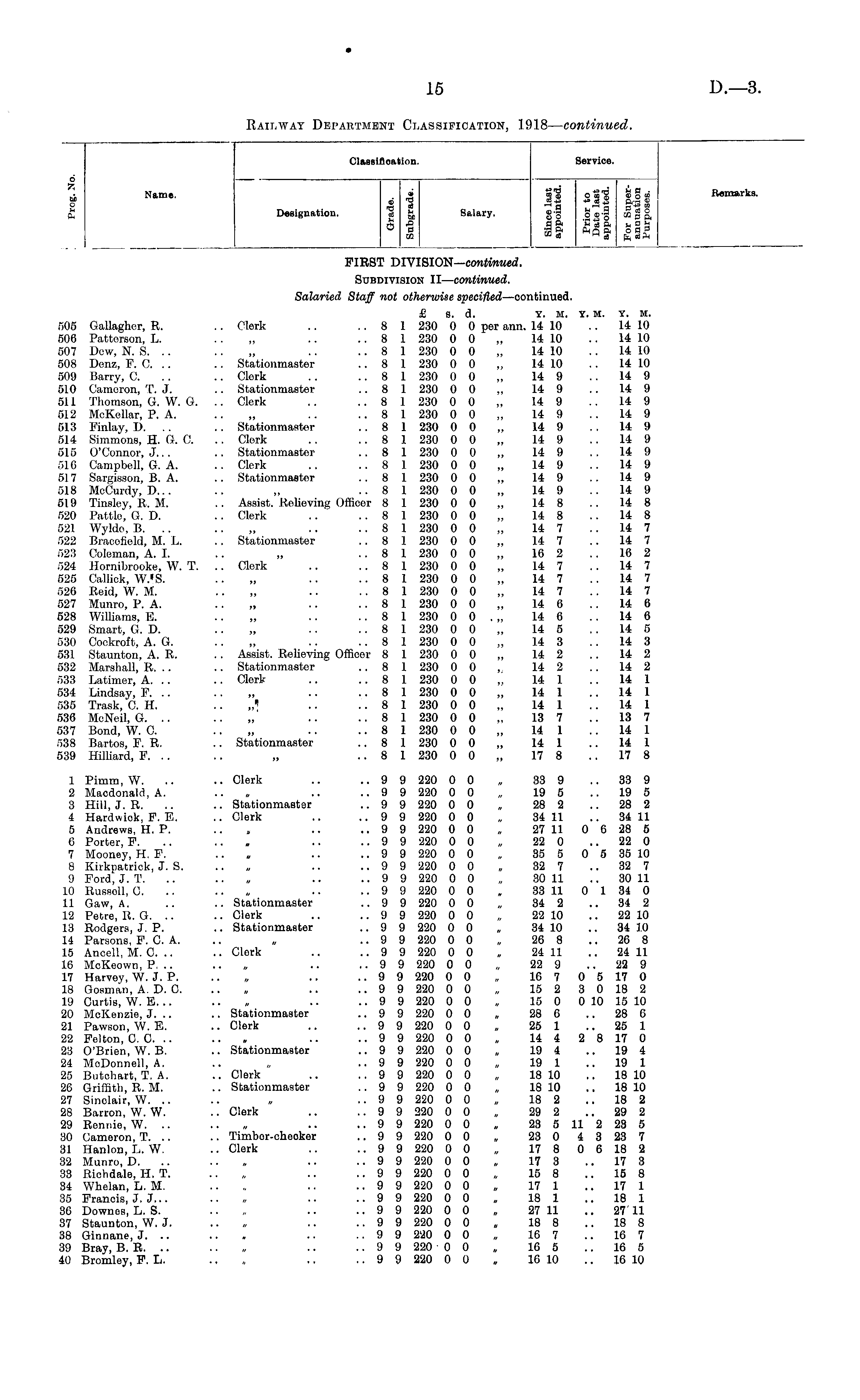Classification. Service. d Z cc O fa P. Name. Designation. Salary. ■is 2 3? ft-2S3 So Ij'i CO B n a a fadft faafa S3 & to a ft o a a CO d H d ft, da Remarks. FIRST DIVISION— continued. Subdivision II— continued. 505 Gallagher, R. 506 Patterson, L. 507 Dew, N. S. 508 Denz, F. C. 509 Barry, C. 510 Cameron, T. J. 511 Thomson, G. W. G. 512 McKellar, P. A. 513 Finlay, D. .. 514 Simmons, H. G. C. 515 O'Connor, J... 516 Campbell, G. A. 617 Sargisson, B. A. 518 McCurdy, D... 519 Tinsley, R. M. 520 Pattlo, G. D. 521 Wyldo, B. .. 522 Bracoaold, M. L. 523 Coleman, A. I. 524 Hormbrooke, W. T. 525 Callick, W.'S. 526 Reid, W. M. 527 Munro, P. A. 628 Williams, E. 529 Smart, G. D. 530 Cockroft, A. G. 531 Staunton, A. R. 532 Marshall, R. .. 533 Latimer, A. .. 634 Lindsay, F. .. 535 Trask, C. H. 536 McNoil, G. .. 537 Bond, W. G. 538 Bartos, F. R. 639 Hilliard, F. .. Salaried Staff not otherwise specified —continued. £ s. d. Y. M. Y. M. Y. M. . . Clerk .. .. 8 1 230 0 0 per arm. 14 10 .. 14 10 .. 8 1 230 0 0 „ 14 10 14 10 .. 8 1 230 0 0 14 10 14 10 .. Stationmaster .. 8 1 230 0 0 „ 14 10 .. 14 10 .. Clerk .. .. 8 1 230 0 0 „ 14 9 .. 14 9 .. Stationmaster .. 8 1 230 0 0 „ 14 9 .. 14 9 .. Clerk .. .. 8 1 230 0 0 „ 14 9 .. 14 9 .. 8 1 230 0 0 14 9 14 9 .. Stationmaster .. 8 1 230 0 0 „ 14 9 .. 14 9 .. Clerk .. .. 8 1 230 0 0 „ 14 9 .. 14 9 .. Stationmaster .. 8 1 230 0 0 „ 14 9 .. 14 9 .. Clerk .. .. 8 1 230 0 0 „ 14 9 .. 14 9 .. Stationmaster .. 8 1 230 0 0 „ 14 9 .. 14 9 .. 8 1 230 0 0 „ 14 9 14 9 .. Assist. Relieving Officer 8 1 230 0 0 „ 14 8 .. 14 8 .. Clerk .. .. 8 1 230 0 0 „ 14 8 .. 14 8 .. 8 1 230 0 0 14 7 14 7 .. Stationmaster .. 8 1 230 0 0 „ 14 7 .. 14 7 .. 8 1 230 0 0 16 2 16 2 .. Clork .. .. 8 1 230 0 0 „ 14 7 .. 14 7 .. 8 1 230 0 0 14 7 14 7 .. 8 1 230 0 0 14 7 14 7 .. 8 1 230 0 0 14 6 14 6 .. 8 1 230 0 0 . „ 14 6 14 6 .. 8 1 230 0 0 „ 14 5 14 5 .. 8 1 230 0 0 14 3 14 3 . . Assist. Relieving Officer 8 1 230 0 0 „ 14 2 .. 14 2 .. Stationmaster .. 8 1 230 0 0 , 14 2 .. 14 2 .. Clerk .. .. 8 1 230 0 0 ,. 14 1 .. 14 1 .. 8 1 230 0 0 14 1 .. 14 1 „' .. .. 8 1 230 0 0 „ 14 1 14 1 .. 8 1 230 0 0 „ 13 7 13 7 .. 8 1 230 0 0 „ 14 1 14 1 .. Stationmaster .. 8 1 230 0 0 „ 14 1 .. 14 1 .. 8 1 230 0 0 „ 17 8 17 8 1 Pimm, W. 2 Maodonald, A. 3 Hill, J. R. 4 Hardwick, F. E. 5 Andrews, H. P. 6 Porter, F. 7 Mooney, H. F. 8 Kirkpatrick, J. S. 9 Ford, J. T. 10 Russoll, C 11 Gaw, A. 12 Petre, R. G. 13 Rodgers, J. P. 14 Parsons, F. 0. A. 15 Aneell, M. 0. .. 16 McKeown, P. .. 17 Harvey, W. J. P. 18 Gosman, A. D. 0. 19 Curtis, W. E... 20 McKenzie, J. .. 21 Pawson, W. E. 22 Felton, 0. G. 23 O'Brien, W. B. 24 McDonnell, A. 25 Butchart, T. A. 26 Griffith, R. M. 27 Sinclair, W. .. 28 Barron, W. W. 29 Rennie, W. .. 30 Cameron, T. .. 31 Hanlon, L. W. 32 Munro, D. 33 Riohdale, H. T. 34 Whelan, L. M. 35 Franois, J. J... 86 Downes, L. S. 37 Staunton, W. J. 38 Ginnane, J. .. 39 Bray, B. R. 40 Bromley, F. L. .. Clerk .. .. 9 9 220 0 0 „ 33 9 .. 33 9 .. „ .. .. 9 9 220 0 0 „ 19 5 19 5 .. Stationmaster .. 9 9 220 0 0 „ 28 2 .. 28 2 .. Clerk .. .. 9 9 220 0 0 „ 34 11 .. 34 11 .. 9 9 220 0 0 „ 27 11 0 6 28 5 .. .. .. 9 9 220 0 0 „ 22 0 22 0 .. 9 9 220 0 0 „ 85 5 0 5 35 10 .. „ .. .. 9 9 220 0 0 „ 32 7 32 7 .. 9 9 220 0 0 „ 30 11 .. 30 11 .. 9 9 220 0 0 . 33 11 0 1 34 0 .. Stationmaster .. 9 9 220 0 0 „ 34 2 .. 34 2 .. Clerk .. .. 9 9 220 0 0 „ 22 10 .. 22 10 .. Stationmaster .. 9 9 220 0 0 „ 34 10 .. 34 10 .. 9 9 220 0 0 „ 26 8 .. 26 8 .. Clerk .. .. 9 9 220 0 0 „ 24 11 .. 24 11 .. „ .. .. 9 9 220 0 0 „ 22 9 22 9 .. 9 9 220 0 0 „ 16 7 0 5 17 0 .. 9 9 220 0 0 „ 15 2 3 0 18 2 .. 9 9 220 0 0 „ 15 0 0 10 15 10 .. Stationmaster .. 9 9 220 0 0 „ 28 6 .. 28 6 .. Clerk .. .. 9 9 220 0 0 „ 25 1 .. 25 1 .. 9 9 220 0 0 „ 14 4 2 8 17 0 .. Stationmaster .. 9 9 220 0 0 „ 19 4 .. 19 4 .. 9 9 220 0 0 „ 19 1 19 1 .. Clerk .. .. 9 9 220 0 0 „ 18 10 .. 18 10 .. Stationmaster .. 9 9 220 0 0 „ 18 10 .. 18 10 .. 9 9 220 0 0 „ 18 2 18 2 .. Clerk .. .. 9 9 220 0 0 „ 29 2 29 2 .. 9 9 220 0 0 „ 28 5 11 2 23 5 .. Timbor-oheoker .. 9 9 220 0 0 „ 23 0 4 3 23 7 .. Clerk .. .. 9 9 220 0 0 „ 17 8 0 6 18 2 .. 9 9 220 0 0 „ 17 3 17 3 .. 9 9 220 0 0 „ 15 8 .. 15 8 .. 9 9 220 0 0 „ 17 1 17 1 .. 9 9 220 0 0 „ 18 1 18 1 .. 9 9 220 0 0 „ 27 11 27 11 .. 9 9 220 0 0 , 18 8 18 8 .. 9 9 220 0 0 „ 16 7 16 7 .. 9 9 220 0 0 „ 16 5 16 5 .. 9 9 220 0 0 „ 16 10 16 10