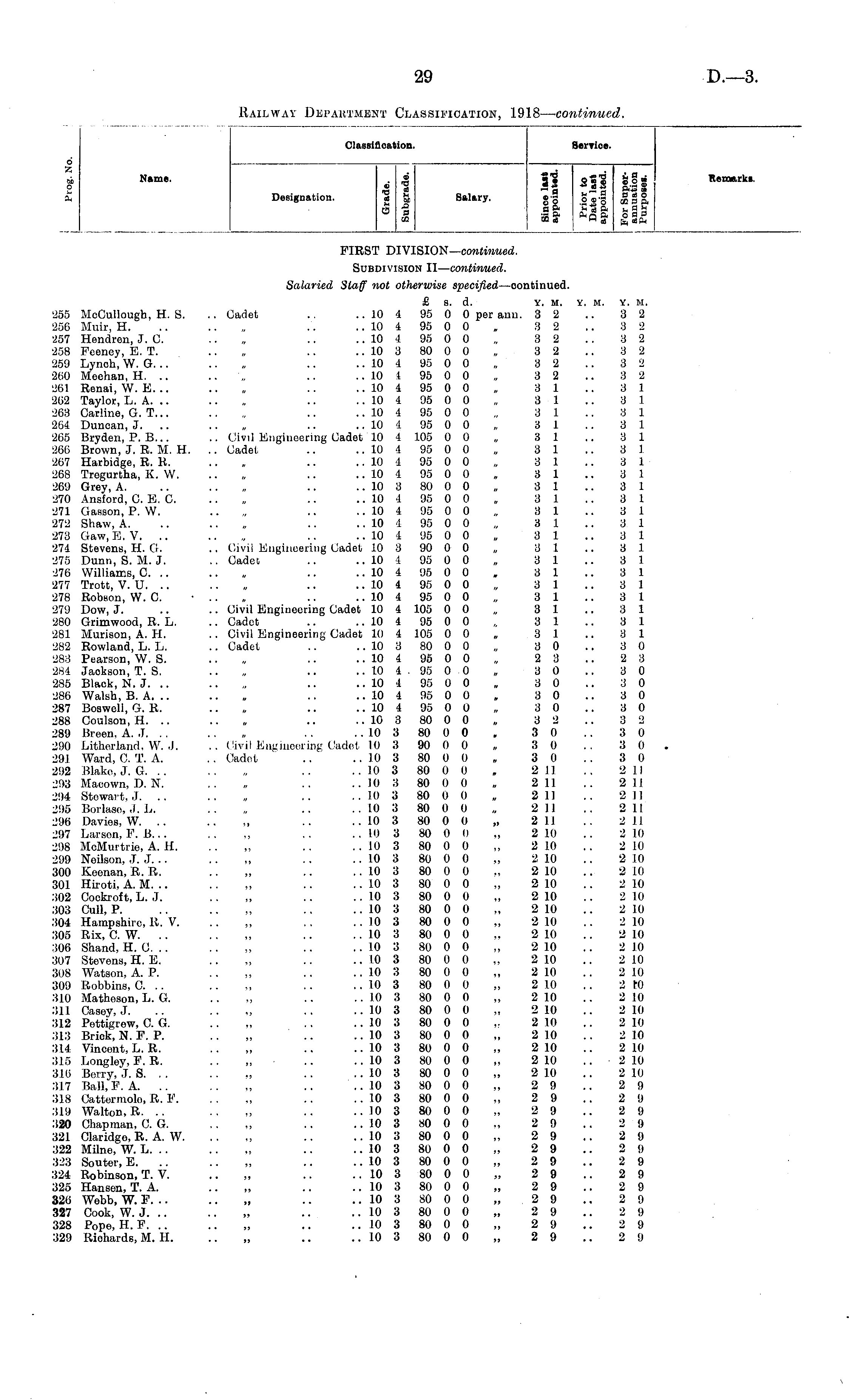 Classification. Service Classification. Service. e. d to A Name. o £ 6 z A o to 9 S"? 0. *" |Q 4 1 ~l s * s Designation. d S Salary. ••§ oo-g Designation. 9 ■2 fa d M j I CO Salary. -giO „-»H3 i,0. 85 2 52 III —< 5 „ t; ft-w a, o-S fa~.2 Ddo So .2 23 cd o ft aft fa-sft i,nfa •fa ft en a Sns Odd W Q S 1 £ dfH i 9 si i S.°S , hs,00 a, i D d O > CD 3 ft v n fa Remark!. Reme txrki. 0o SH £«§; to nod W Q 3 *• fa O fa s 8 o P a Eh "to FIRST DIVISION— continued. Subdivision II— continued. 255 McCullougb, H. S. 256 Muir, H. 257 Hendren, J. 0. 258 Fceney, E. T. 259 Lynch, W. G. .. 260 Meehan, H. 261 Renai, W. E... 262 Taylor, L. A. 263 Garline, G. T... 264 Duncan, J. 265 Bryden, P. B... 266 Brown, J. R. M. H. 267 Harbidge, R. R. 268 Tregurtha, K. W. 269 Grey, A. 270 Ansford, C E. 0. 271 Gasson, P. W. 272 Shaw, A. 273 Gaw, E. V. .. 274 Stevens, H. G. 275 Dunn, S. M. J. 276 Williams, 0. .. 277 Trott, V. U. 278 Robson, W. 0. 279 Dow, J. 280 Grimwood, R. L. 281 Murison, A. H, 282 Rowland, L. L. 283 Pearson, W. S. 284 Jaokson, T. S. 285 Black, N. J. 286 Walsh, B. A. .. 287 Boswell, G. R. 288 Coulson, H. .. 289 Breen, A. J. .. 290 Litherland, W. J. 291 Ward, C. T. A. 292 Blake, J. G. .. 293 Macown, D. N. 294 Stowart, J. .. 295 Borlaso, J. L. 296 Davies, W. .. 297 Larson, F. B... 298 McMurtrio, A. H. 299 Neilson, J. J. .. 300 Keenan, R. R. 301 Hiroti, A. M. .. 302 Cockrof t, L. J. 303 Cull, P. 304 Hampshire, R. V. 305 Rix, C. W. 306 Shand, H. 0. 307 Stevens, H. E. 308 Watson, A. P. 309 Robbins, C. .. 310 Matheson, L. G. 311 Casey, J. 312 Pettigrew, C. G. 313 Brick, N. F. P. 314 Vincent, L. R. 315 Longley, F. R. 316 Berry, J. S. , . 317 Ball,'F. A. .. 318 Cattermolo, R. F. 319 Walton, R. .. 320 Chapman, G. G. 321 Claridge, R. A. W. 322 Milne, W. L. 323 Soutor, E. 324 Robinson, T. V. 325 Hansen, T. A. 326 Webb, W. F. .. 327 Cook, W. J. 328 Pope, H. F. 329 Richards, M. II. Salaried Staff not otherwise specified —continued. £ s. d. Y. M. Y. M. .. Cadet .. .. 10 4 95 0 0 per ann. 3 2 .. 10 4 95 0 0 , 3 2 .. 10 4 95 0 0 „ 3 2 .. 10 3 80 0 0 „ 3 2 .. 10 4 95 0 0 „ 3 2 .. „ .. .. 10 1 95 0 0 „ 3 2 .. 10 4 95 0 0 „ 3 1 .. 10 4 95 0 0 „ 3 1 .. 10 4 95 0 0 „ 3 1 .. 10 4 95 0 0 „ 3 1 .. Civil Engineering Cadet 10 4 105 0 0 „ 3 1 .. Cadet .. .. 10 4 95 0 0 „ 3 1 .. 10 4 95 0 0 „ 3 1 .. 10 4 95 0 0 „ 3 1 .. „ .. .. 10 3 80 0 0 „ 3 1 .. 10 1 95 0 0 „ 3 1 .. 10 4 95 0 0 „ 3 1 .. 10 4 95 0 0 „ 3 1 .. 10 4 95 0 0 „ 3 1 .. Civil Engineering Cadet 10 8 90 0 0 „ 3 1 .. Cadet .. .. 10 4 95 0 0 „ 3 1 .. 10 4 95 0 0 „ 3 1 .. 10 4 95 0 0 „ 3 1 .. 10 4 95 0 0 „ 3 1 .. Civil Engineering Cadet 10 4 105 0 0 „ 3 1 .. Cadet .. .. 10 4 95 0 0 „ 3 1 .. Civil Engineering Cadet 10 4 105 0 0 „ 3 1 .. Cadet .. .. 10 3 80 0 0 „ 3 0 .. 10 4 95 0 0 „ 2 3 .. 10 1 . 95 0 0 „ 3 0 .. 10 1 95 0 0 „ 3 0 .. 10 4 95 0 0 , 3 0 .. 10 4 95 0 0 „ 3 0 .. 10 3 80 0 0 „ 3 2 .. 10 3 80 0 0 „ 3 0 .. Civil Engineering Cadot 10 3 90 0 0 „ 3 0 .. Cadet .. .. 10 3 80 0 0 „ 3 0 .. 1(3 3 80 0 0 . 2 11 .. 10 3 80 0 0 „ 2 11 .. 1(3 3 80 0 0 „ 2 11 .. 10 3 80 0 0 „ 2 11 .. 10 3 80 0 0 „ 2 11 .. 10 3 80 0 0 „ 2 10 .. 10 3 80 0 0 ,, 2 10 .. 10 3 80 0 0 „ 2 10 .. 10 3 80 0 0 ., 2 10 .. 10 3 80 0 0 „ 2 10 .. 10 3 80 0 0 „ 2 10 .. 10 3 80 0 0 „ 2 10 .. 10 3 80 0 0 „ 2 10 .. 10 3 80 0 0 „ 2 10 .. 10 3 80 0 0 ,, 2 10 .. 10 3 80 0 0 ,, 2 10 .. 10 3 80 0 0 „ 2 10 .. 10 3 80 0 0 „ 2 10 .. 10 3 80 0 0 „ 2 10 .. 10 3 80 0 0 „ 2 10 .. 10 3 80 0 0 ,. 2 1(3 .. 10 3 80 0 0 „ 2 10 .. 10 3 80 0 0 „ 2 10 „ .. .. 10 3 80 0 0 „ 2 10 .. 10 3 80 0 0 „ 2 10 .. 10 3 80 0 0 „ 2 9 .. 10 3 80 0 0 „ 2 9 .. .. .. 10 3 80 0 0 2 9 .. 10 3 80 0 0 ., 2 9 .. 10 3 80 0 0 „ 2 9 .. 10 3 80 0 0 „ 2 9 .. 10 3 80 0 0 „ 2 9 .. 10 3 80 0 0 „ 2 9 .. 10 3 80 0 0 „ 2 9 .. 10 3 80 0 0 „ 2 9 .. 10 3 80 0 0 „ 2 9 .. 10 3 80 0 0 „ 2 9 .. 10 3 80 0 0 „ 2 9 Y. M. 3 2 3 2 3 2 3 2 3 9 3 2 3 1 3 1 3 1 3 1 3 1 3 1 3 1 3 1 3 1 3 1 3 1 3 1 3 1 3 1 3 1 3 1 3 1 3 1 3 1 3 1 3 1 3 0 2 3 3 0 3 0 3 0 3 0 3 2 3 0 3 0 3 0 2 11 2 11 2 11 2 11 2 11 2 10 2 10 2 10 2 10 2 10 2 10 2 10 2 10 2 10 2 10 2 10 2 10 2 10 2 10 2 10 2 10 2 10 2 10 2 10 2 10 2 9 2 9 2 9 2 9 2 9 2 9 2 9 2 9 2 9 2 9 2 9 2 9 2 9