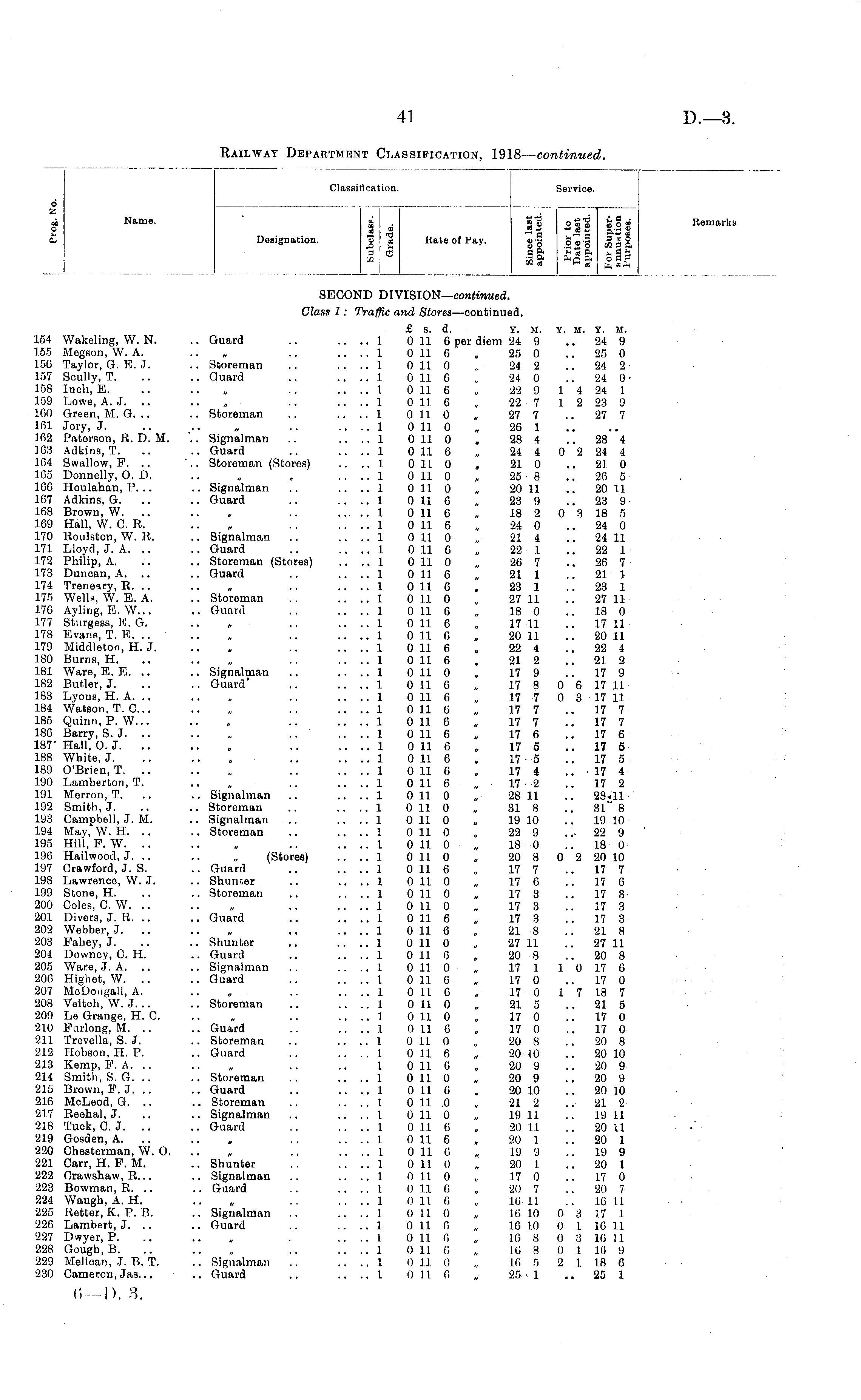d A A Name. p a. Classification. i ■ 5« Ss 9 d — _ , s iS — a Designation. u t Rate of Pay. •■3 Ss 8 |1 M to 3 ClaKsii i cation. 11 "™ a go a ft S 3 Service. ss"g i, O ■ S § 1 *.2 S S 1 £ 3 « o -2 8 o GO B fi, fa d to fa 3 fa ph q ft 5 a b M d Eh *i~i Service. si 8 fa ~ 3 -2 So X* °> 9^ ftp ft M d i, 3 . »-2S 0 Vt O co 0 a iM I a 3 a R( Remarks. ems lai ,rk ks. SECOND DIVISION— continued. Glass J : Traffic and Stores —continued. 154 Wakeling, W. N. 155 Megson, W. A. 156 Taylor, G. E. J. 157 Scully, T. 158 Inch, E. 159 Lowe, A. J. 160 Green, M. G. .. 161 Jory, J. 162 Paterson, R. D. M. 163 Adkins, T. 164 Swallow, F. .. 165 Donnelly, O. D. 166 Houlahan, P. .. 167 Adkins, G. 168 Brown, W. .. 169 Hall, W. C. R. 170 Roulston, W. R. 171 Lloyd, J. A. .. 172 Philip, A. 173 Duncan, A. .. 174 Treneiry, R. .. 175 Wolls, W. E. A. 176 Ayling, E. W... 177 Sturgess, K. G. 178 Evans, T. E. .. 179 Middleton, H. J. 180 Burns, H. 181 Ware, E. E. .. 182 Butler, J. 183 Lyons, H. A. 184 Watson, T. C... 185 Quinn.P. W... 186 Barrv, S. J. 187' Hall, O.J. .. 188 White, J. 189 O'Brien, T. .. 190 Lamberton, T. 191 Merron, T. 192 Smith, J. 193 Campbell, J. M. 194 May, W. H. 195 Hill, F. W. .. 196 Hailwood, J. .. 197 Crawford, J. S. 198 Lawrence, W. 3. 199 Stone, H. 200 Coles, 0. W. 201 Divers, J. R. .. 202 Webber, J. .. 203 Fahey, J. 204 Downev, 0. H. 205 Ware, j. A. 206 Highet, W. .. 207 MoDougall, A. 208 Veitch, W. J. .. 209 Le Grange, H. 0. 210 Furlong, M. .. 211 Trovolla, S. J. 212 Hobson, H. P. 213 Kemp, F. A. .. 214 Smith, S. G. .. 215 Brown, F. J. .. 216 McLeod, G. .. 217 Reehal, J. 218 Tuck, C. J. 219 Gosden, A. .. 220 Ghesterman, W. O. 221 Carr, H. F. M. 222 Crawshaw, R... 223 Bowman, R. .. 224 Waugh, A. H. 225 Retter, K. P. B. 226 Lambert, J. .. 227 Dwyer, P. 228 Gough, B. 229 Melican, J. B. T. 230 Cameron, Jas... £ s. d. y. m. .. Guard .. .... 1 0 11 0 per diem 24 9 .... 1 0 11 6 , 25 0 .. Storeman .. .... 1 0 11 0 „ 24 2 .. Guard .. .... 1 0 11 6 „ 24 0 .... 1 0 11 6 „ 22 9 .... 1 0 11 6 „ 22 7 .. Storeman .. .... 1 0 11 0 „ 27 7 .... 1 0 11 0 „ 26 1 .. Signalman .. .... 1 0 11 0 , 28 4 .. Guard .. .... 1 0 11 6 „ 24 4 .. Storeman (Stores) .... 1 0 11 0 „ 21 0 .... 1 0 11 0 „ 25 8 .. Signalman .. .... 1 0 11 0 „ 20 11 .. Guard .. .... 1 0 11 6 „ 23 9 1 0 11 6 „ 18 2 .... 1 0 11 6 „ 24 0 .. Signalman .. .... 1 0 11 0 „ 21 4 .. Guard .. .... 1 0 11 6 „ 22 1 .. Storeman (Stores) .... 1 0110 „ 20 7 .. Guard .. .... 1 0 11 6 „ 21 1 .... 1 0 11 6 „ 23 1 .. Storeman .. .... 1. OHO „ 27 11 .. Guard .. .... 1 0 11 6 „ 18 0 .... 1 0 11 6 „ 17 11 .... 1 0 11 6 „ 20 11 .... 1 0 11 6 , 22 4 .... 1 0 11 6 , 21 2 .. Signalman .. .... 1 0 11 0 „ 17 9 .. Guard' .. .... 1 0 11 6 ,. 1.7 8 .... 1 0 11 6 „ 17 7 .... 1 0 11 6 „ 17 7 .... 1 0 11 6 „ 17 7 .... 1 0 11 6 „ 17 6 .... 1 0 11 6 , 175 .... 1 0116 „ 175 .... 1 0 11 6 „ 17 4 .... 1 0 11 0 „ 17 2 .. Signalman .. .... 1 0 11 0 „ 28 11 .. Storeman .. .... 1 0 11 0 „ 31 8 .. Signalman .. .... 1 0 11 0 „ 19 10 .. Storeman .. .... 1 0 11 0 „ 22 9 .... 1 0 11 0 „ 18 0 (Stores) .... 1 0 11 0 . 20 8 .. Guard .. .... 1 0 11 0 „ 17 7 .. Shunter .. .... 1 0 11 0 „ 17 6 .. Storeman .. .... 1 0 11 0 „ 17 3 .... 1 0 11 0 „ 17 3 .. Guard .. .... 1 0 11 6 „ 17 3 .... 1 0 11 6 „ 21 8 .. Shunter .. .... 1 0 11 0 „ 27 11 .. Guard .. .... 1 0 11 6 „ 20 8 .. Signalman .. .... 1 0110 „ 171 .. Guard .. .... 1 0 11 6 „ 17 0 .... 1 0 11 G „ 17 0 .. Storeman .. .... 1 0 11 0 „ 21 5 .... 1 0 11 0 „ 17 0 .. Guard .. .... 1 0 11 6 „ 17 0 .. Storeman .. .... 1 0 11 0 „ 20 8 .. Guard .. .... 1 0 11 6 „ 20 10 1 0 11 6 „ 20 9 .. Storeman .. .... 1 0 11 0 „ 20 9 .. Guard .. .... 1 0 31 6 „ 20 10 .. Storeman .. .... 1 0 11 .0 „ 21 2 .. Signalman .. .... 1 0 11 0 „ 19 11 .. Guard .. .... 1 0 11 (1 „ 20 11 .... 1 0 11 6 » 20 1 .... 1 0 11 6 „ 19 9 .. Shunter .. .... 1 0 1.1 0 „ 20 1 .. Signalman .. .... 1 0 11 0 ,, 17 0 .. Guard .. .... 1 0 11 6 „ 20 7 .... 1 0 116 „ 1.6 11 .. Signalman .. .... 1 0 11 0 ,, 16 10 .. Guard .. .... 1 0 11 6 „ 1.0 10 .... 1 0 11 6 „ 16 8 .... 1 0 11 6 „ 16 8 .. Signalman .. .... 1 0 11 o „ 16 5 .. Guard .. .... 1 0116 „ 25 1 Y. M. Y. M. .. 24 9 25 0 24 2 24 0 ■ 1 4 24 1 1 2 23 9 27 7 '.'. 28*" 4 0 2 24 4. .. 21. 0 26 5 20 11 .. 23 9 0 3 18 5 24 0 .. 24 11 .. 22 1 .. 26 7 21 1 23 1 27 11 18 0 17 11 .. 20 11 22 4 .. 21 2 17 9 0 6 17 11 0 3 17 11 17 7 17 7 17 6 .. 17 5 .. 17 5 .. 17 4 17 2 .. 28.11 81 8 19 10 ..- 22 9 18 0 0 9 20 10 17 7 17 0 .. 17 3 17 3 .. 17 3 21 8 27 11 20 8 1 0 17 6 17 0 1 7 1.8 7 .. 21 5 17 0 17 0 20 8 20 10 20 9 20 9 .. 20 10 .. 21 2 19 11 20 11 20 1 19 9 20 1 .. 17 0 20 7 16 M 0 3 17 1 0 1 16 11 0 8 10 11 0 1 16 9 2 1 18 6 .. 25 1