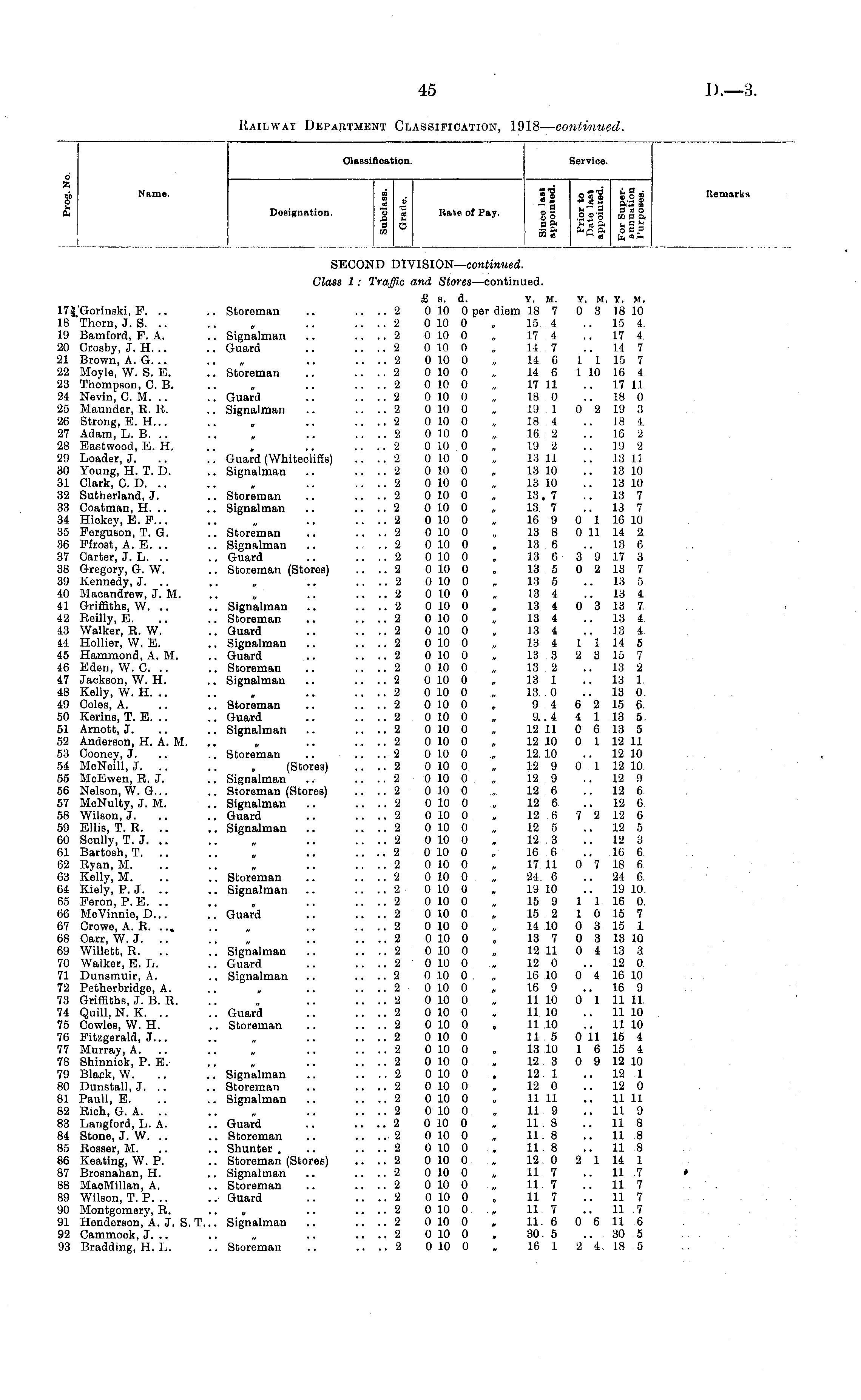 ClaBsification. Service. A Name. » . «| ft Designation. o a Rate of Pay. co - t? i So. o or o v. a Designation. 1 9 S £ 5 8 Kate of Pay. " a si ■SB co as si! sis „ fa ft*, to fa ,3 3 si o SS o to 3 a -fa d 2 fa *~ 3 2 S'S fa d ft tit a** tn D * O co 0 a u e h in »fc Ken Remarks DIM LTl ■ks BO a g K S3 fa d ft fa 3 fa ft Q ft O 3 fa fa* d (n bm SECOND DIVISION— continued. Class 1 : Traffic and Stores —continued. £ s. d. Y. M. 17|'Gorinski, F. .. .. Storeman .. .... 2 0 10 0 per diem 18 7 18 Thorn, J. S. .. .. „ .. .... 2 0 10 0 „ 151 19 Bamford, F. A. .. Signalman .. .... 2 0 10 0 „ 174 20 Crosby, J. H. .. .. Guard .. .... 2 0100 „ 14 7 21 Brown, A. G... .. „ .. .... 2 0 10 0 „ 14 6 22 Moyle, W. S. E. .. Storeman .. .... 2 0 10 0 „ 14 6 23 Thompson, C B. .. „ .. .... 2 0 10 0 „ 17 11 24 Nevin, CM... .. Guard .. .... 2 0 10 0 „ 18 0 25 Maunder, R. R. .. Signalman .. .... 2 0 1.0 0 „ 191. 26 Strong, E. H... .. „ .. .... 2 0 .10 0 „ 18 4 27 Adam, L. B. .. .. „ .. .... 2 0 10 0 „. 16 2 28 Eastwood, E. H. .. . .. .... 2 0 10 0 „ 19 2 29 Loader, J. .. .. Guard (WhitoclifEs) .. ..2 0 30 0 „ 13.11 30 Young, H. T. D. .. Signalman .. .... 2 0 10 0 „ 13 10 31 Clark, CD... .. , .. .... 2 0 10 0 „ 13 10 32 Sutherland, J. .. Storeman .. .... 2 0 10 0 „ 13. 7 33 Coatman, H. .. .. Signalman .. .... 2 0 10 0 „ 13 7 34 Hiokey, E. F... .. „ .. .... 2 0 10 0 „ 16 9 35 Ferguson, T. G. .. Storeman .. .... 2 0 10 0 „ 13 8 36 Ffrost, A. E. .. .. Signalman .. .... 2 0 10 0 „ 13 6 37 Carter, J. L. .. .. Guard .. .... 2 0 10 0 „ 13 6 38 Gregory, G. W. .. Storeman (Stores) .... 2 0 10 0 „ 13 5 39 Kennedy, J. .. .. „ .. .... 2 0 10 0 „ 13 5 40 Macandrew, J. M. .. „ .. .... 2 0 10 0 „ 13 4 41 Griffiths, W. .. .. Signalman .. .... 2 0 10 0 „ 134 42 Reilly, E. .. .. Storeman .. .... 2 0 10 0 „ 13 4 43 Walker, R. W. .. Guard .. .... 2 0 10 0 „ 33 4 44 Hollier, W. E. .. Signalman .. .... 2 0 10 0 „ 13 4 45 Hammond, A.M. .. Guard .. .... 2 0 10 0 „ 13 3 46 Eden, W. C. .. .. Storeman .. .... 2 0 10 0 „ 13 2 47 Jackson, W. H. .. Signalman .. .... 2 0 10 0 „ 13 1 48 Kelly, W. H. .. .. . .. .... 2 0 10 0 „ 13. 0 49 Coles, A. .. .. Storeman .. .... 9 0 10 0 » 94 50 Kerins, T. E. .. .. Guard .. .... 2 0 10 0 „ 9.. 4 51 Arnott, J. .. .. Signalman .. .... 2 0 10 0 „ 12 11 52 Anderson, H. A. M. .. , .. .... 2 0 10 0 „ 12 .1.0 53 Cooney, J. .. .. Storeman .. .... 2 0 10 0 „ 12 10 54 McNeill, J. .. .. , (Stores) .... 2 0 10 0 „ 12 9 55 MoEwen, R. J. .. Signalman .. .... 2 0 10 0 „ 12 9 56 Nelson, W. G... .. Storeman (Stores) .... 2 0 1.0 0 „ 12 6 57 MoNulty, J. M. .. Signalman .. .... 2 0 10 0 „ 12 6 58 Wilson, J. .. .. Guard .. .... 2 0 10 0 „ 12 6 59 Ellis, T. R. .. .. Signalman .. .... 2 0 10 0 „ 12 5 60 Scully, T. J. .. .. „ .. .... 2 0 10 0 „ 12 3 61 Bartosh, T. .. .. , .. .... 2 0 10 0 ,/ 16 .6 62 Ryan, M. .. .. „ .. .... 2 0 10 0 „ 17 11 63 Kelly, M. .. .. Storeman .. .... 2 0 10 0 , 24. 6 64 Kiely, P. J. .. .. Signalman .. .... 2 0 10 0 „ 19 10 65 Feron, P. E. .. .. „ .. .... 2 0 10 0 „ 159 66 McVinnie, D... .. Guard .. .... 2 0 10 0 „ 15 2 67 Crowe, A. R „ .. .... 2 0 10 0 „ 14 10 68 Carr, W. J. .. .. , .. .... 2 0 10 0 „ 13 7 69 Willett, R. .. Signalman .. .... 2 0 10 0 „ 12 11 70 Walker, E. L. .. Guard .. .... 2 0 10 0 „ 12 0 71 Dunsmuir, A. .. Signalman .. .... 2 0 10 0 „ 16 10 72 Petherbridge, A. .. , .. .... 2 0 10 0 „ 16 9 73 Griffiths, J. B. R. .. „ .. .... 2 0 10 0 „ 11 10 74 Quill, N. K. .. .. Guard .. .... 2 0 10 0 „ 11 10 75 Cowles, W. H. .. Storeman .. .... 2 0 10 0 „ 11 .10 76 Fitzgerald, J... .. „ .. .... 2 0 10 0 11 5 77 Murray, A. .. .. „ .. .... 2 0 10 0 „ 13 10 78 Shinnick, P. E. .. „ .. .... 2 0 10 0 „ 12 3 79 Black, W. .. .. Signalman .. .... 2 0 10 0 „ 12.1 80 Dunstall, J. .. .. Storeman .. .... 2 0 10 0 , 12 0 81 Paull, E. .. .. Signalman .. .... 2 0 10 0 „ 11 11 82 Rich, G. A. .. .. „ .. .... 2 0 10 0 „ 11 9 83 Langford, L. A. .. Guard 2 0 1.0 0 „ 118 84 Stone, J. W. .. .. Storeman .. ..... 2 0 10 0 „ 11 8 85 Rosser, M. .. .. Shunter . .. .... 2 0 10 0 , 11.8 86 Keating, W. P. .. Storeman (Stores) .... 2 0 10 0 „ 12 0 87 Brosnahan, H. .. Signalman .. .... 2 0 10 0 „ 11 7 88 MacMillan, A. .. Storeman .. .... 2 0 10 0 „ 117 89 Wilson, T. P. .. .. Guard .. .... 2 0 10 0 „ 117 90 Montgomery, R. .. „ .. .... 2 0100 „ 11.7 91 Henderson, A. J. S.T... Signalman .. .. ..2 0 10 0 . 11. 6 92 Cammock, J. .. .. „ .. .... 2 0 10 0 „ 30 5 93 Bradding, H. L. .. Storeman .. .... 2 0 10 0 „ 16 1 Y. M. Y. M. 0 3 18 10 15 4 17 4 14 7 1 1 1.5 7 1 10 16 4 .. 17 1.1 18 0 0 2 1.9 3 18 4 16 2 19 2 13 11 13 10 .. 13 10 .. 13 7 .. 13 7 0 1 16 10 0 11 14 2 13 6 3 9 17 3 0 2 13 7 13 5 .. 13 4 0 3 13 7 13 4. 13 4 1 1 14 5 2 3 15 7 13 2 13 1. 13 0 6 2 15 6 4 1 13 5 0 6 13 5 0 1 12 11 1.2 10 0 1 12 10. 12 9 12 6 12 6. 7 2 12 6 12 5 12 3 16 6 0 7 18 6 24 6 19 10 1 1 16 0. 1 0 15 7 0 3 15 1 0 3 13 10 0 4 13 3 12 0 0 4 16 10 16 9 0 1 11 11 .. 11 10 11 10 0 11 15 4 1 6 15 4 0 9 12 10 .. 12 1 12 0 .. 11 11 .. 11 9 .. 11 8 .. 11 8 11 8 2 1 14 1 .. 11 7 .. 11. 7 11 7 .. 11 7 0 6 11 6 .. 30 5 2 4 18 5 I
