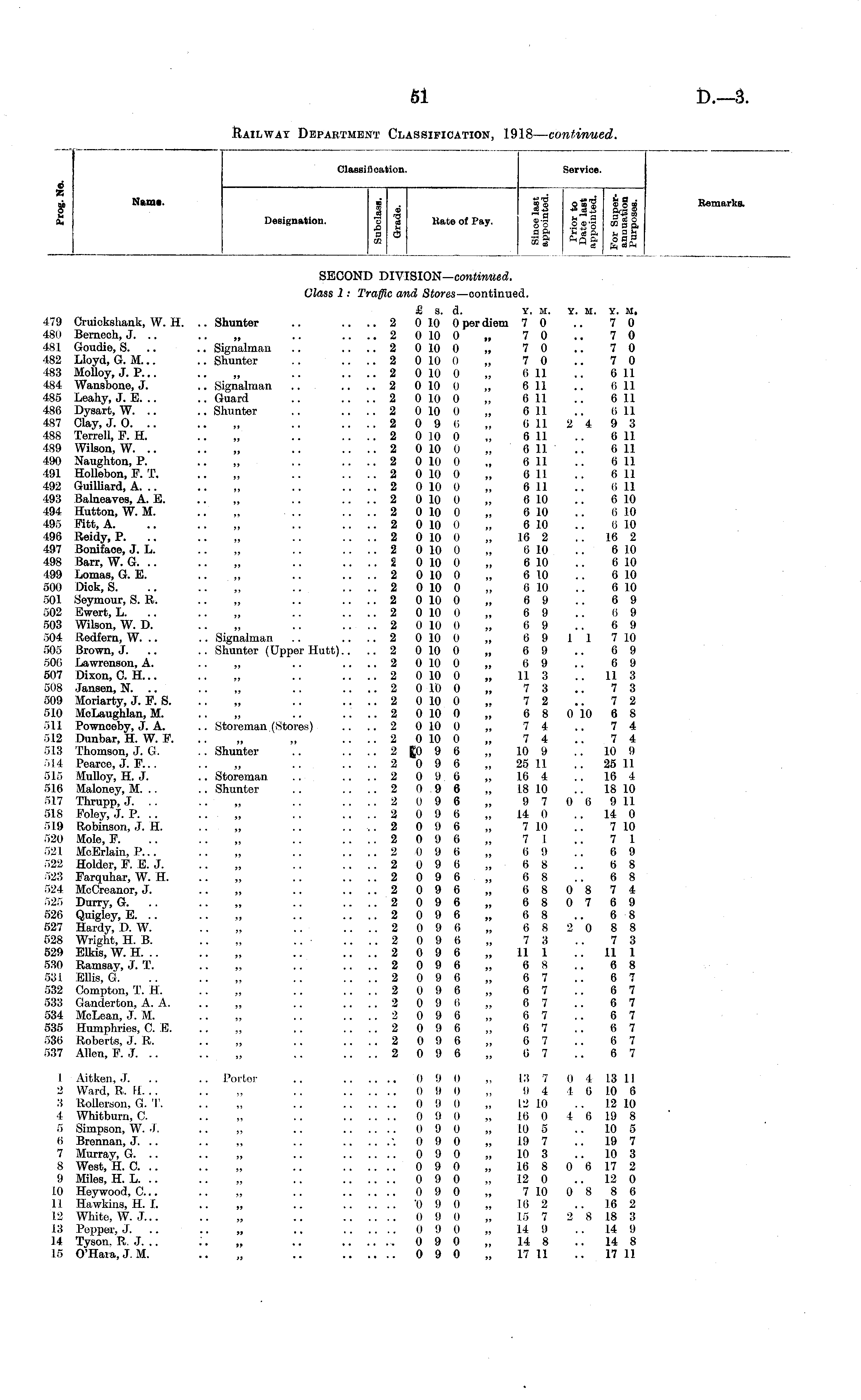 Classification. Service. 6 to S CH Name. Designation. ■ CO el Is SS a to Kate of Pay. |i all co-S fa".g 9 9 .22 5 a to fa S ft 33 g u a . £.2 3 "1& obb Ecdft Remarks. 9 •3 9 fa 8 SECOND DIVISION— continued. Class 1: Traffic and Stores —continued. 479 Cruiokshank, W. H. 480 Berneoh, J. .. 481 Goudie, S. .. 482 Lloyd, G. M... 483 Molloy, J. P... 484 Wansbone, J. 485 Leahy, J. E. .. 486 Dysart, W. .. 487 Clay, J. 0. .. 488 Terrell, F. H. 489 Wilson, W. .. 490 Naughton, P. 491 Hollebon, F. T. 492 Guilliard, A. .. 493 Balneaves, A. E. 494 Hutton, W. M. 495 Fitt, A. 496 Reidy, P. 497 Bonifaoe, J. L. 498 Barr, W. G. 499 Lomas, G. E. 500 Diok, S. 501 Seymour, S. R. 502 Ewert, L. .. 503 Wilson, W. D. 504 Rediern, W. .. 505 Brown, J. 506 Lawrenson, A. 507 Dixon, C. H... 508 Jansen, N. .. 509 Moriarty, J. F. S. 510 McLaughlan, M. 511 Pownceby, J. A. 512 Dunbar, H. W. F. 513 Thomson, J. G. 514 Pearce, J. F... 515 Mulloy, H. J. 516 Maloney, M. .. 517 Thrupp, J. .. 518 Foley, J. P. .. 519 Robinson, J. H. 520 Mole, F. 521 MoErlain, P... 522 Holder, F. E. J. 523 Farquhar, W. H. 524 McCreanor, J. 525 Durry, G. 526 Quigley, E. .. 527 Hardy, D. W. 528 Wright, H. B. 529 Elkis, W. H. .. 530 Ramsay, J. T. 531 Ellis, G. 532 Gompton, T. H. 533 Ganderton, A. A. 534 McLean, J. M. 535 Humphries, C. E. 536 Roberts, J. R. 537 Allen, F. J. £ s. d. Y. M. .. Shunter .. .... 2 0 10 Operdiem 7 0 .... 2 0 10 0 „ 7 0 .. Signalman .. .... 2 0 10 0 „ 70 .. Shunter .. .... 2 0 10 0 „ 70 .... 2 0 10 0 „ 6 11 .. Signalman .. .... 2 0 10 0 „ 6 11 .. Guard .. .... 2 0 10 0 „ 6 11 .. Shunter .. .... 2 0 10 0 „ 6 11 ....2090 „ 6 11 .... 2 0 10 0 „ 6 11 .... 2 0 10 0 6 11 .... 2 0 10 0 „ 6 11 .... 2 0 10 0 „ 6 11 .... 2 0 10 0 „ 6 II .... 2 0 10 0 „ 6 10 .... 2 0 10 0 „ 6 10 .... 2 0 10 0 „ 6 10 .... 2 0 10 0 „ 16 2 .... 2 0 10 0 „ 6 10 .... 2 0 10 0 „ 6 10 .... 2 0 10 0 „ 6 10 .... 2 0 10 0 „ 6 10 .... 2 0 10 0 „ 6 9 .... 2 0 10 0 „ 6 9 .... 2 0 10 0 „ 6 9 .. Signalman .. .... 2 0 10 0 „ 69 .. Shunter (Upper Hutt).. .. 2 0 10 0 „ 6 9 .... 2 0 10 0 „ 6 9 .... 2 0 10 0 „ II 3 .... 2 0 10 0 „ 7 3 .... 2 0 10 0 „ 7 2 .... 2 0 10 0 „ 6 8 .. Storeman (Stores) .... 2 0 10 0 „ 74 .... 2 0 10 0 „ 7 4 .. Shunter .. .... 2 |0 9 6 „ 10 9 .... 2 0 9 6 „ 25 11 .. Storeman .. .. .. 2 0 9 6 „ 16 4 .. Shunter .. .... 2 0 9 6 „ 1.8 10 .. „ .. .... 2 0 9 6 „ 9 7 .. „ .. .... 2 0 9 6 „ 14 0 .. „ .. .... 2 0 9 6 „ 7 10 .... 2 0 9 6 „ 7 1 .... 2 0 9 6 „ 6 9 .... 2 0 9 6 „ 6 8 ....2096,, 68 .... 2 0 9 6 „ 6 8 .... 2 0 9 6 „ 68 .... 2 0 9 6 „ 6 8 .... 2 0 9 6 „ 68 .. • .... 2 0 9 6 „ 73 .... 2 0 9 6 „ 11 1 .... 2 0 9 6 „ 6 8 .... 2 0 9 6 „ 6 7 .... 2 0 9 6 „ 6 7 .... 2 0 9 6 „ 6 7 .... 2 0 9 6 „ 6 7 .... 2 0 9 6 „ 6 7 .... 2 0 9 6 „ 6 7 .... 2 0 9 6 „ 6 7 Y. M. Y. M. 7 0 7 0 7 0 7 0 6 11 6 11 6 11 6 11 2 4 9 3 6 11 6 11 6 11 6 11 6 11 6 10 6 10 6 10 16 2 6 10 6 10 6 10 6 10 6 9 6 9 6 9 11 7 10 6 9 6 9 .. 11 3 7 3 7 2 0 10 6 8 7 4 7 4 10 9 .. 25 11 16 4 18 10 0 6 9 11 .. 14 0 7 10 7 1 6 9 6 8 6 8 0 8 7 4 0 7 6 9 6 8 2 0 8 8 7 3 11 1 6 8 6 7 6 7 6 7 6 7 6 7 6 7 6 7 1 Aitken, J. 2 Ward, R. H. .. 3 Rollerson, G. T. 1 Whitburn, C. 5 Simpson, W. J. 6 Brennan, J. .. 7 Murray, G. .. 8 West, H. C. 9 Miles, H. L. 10 Heywood, C... 11 Hawkins, H. I. 12 White, W.J... 13 Popper, J. 14 Tyson. R.J. .. 15 O'Hara.J. M. .. Porter .. 0 9 0 „ 13 7 0 9 0 „ 9 4 (19 0 „ 12 10 0 9 0 „ 16 0 0 9 0 „ 10 5 '.090 „ 19 7 0 9 0 „ 10 3 0 9 0 „ 16 8 0 9 0 „ 12 0 0 9 0 „ 7 10 '0 9 0 „ 16 2 0 9 0 „ 15 7 0 9 0 „ 14 9 :. „ .. .090 „ 14 8 0 9 0 „ 17 11 0 4 13 11 1 6 10 6 .. 12 10 4 6 19 8 10 5 19 7 10 3 0 6 17 2 12 0 0 8 8 6 16 2 2 8 18 3 14 9 14 8 17 11