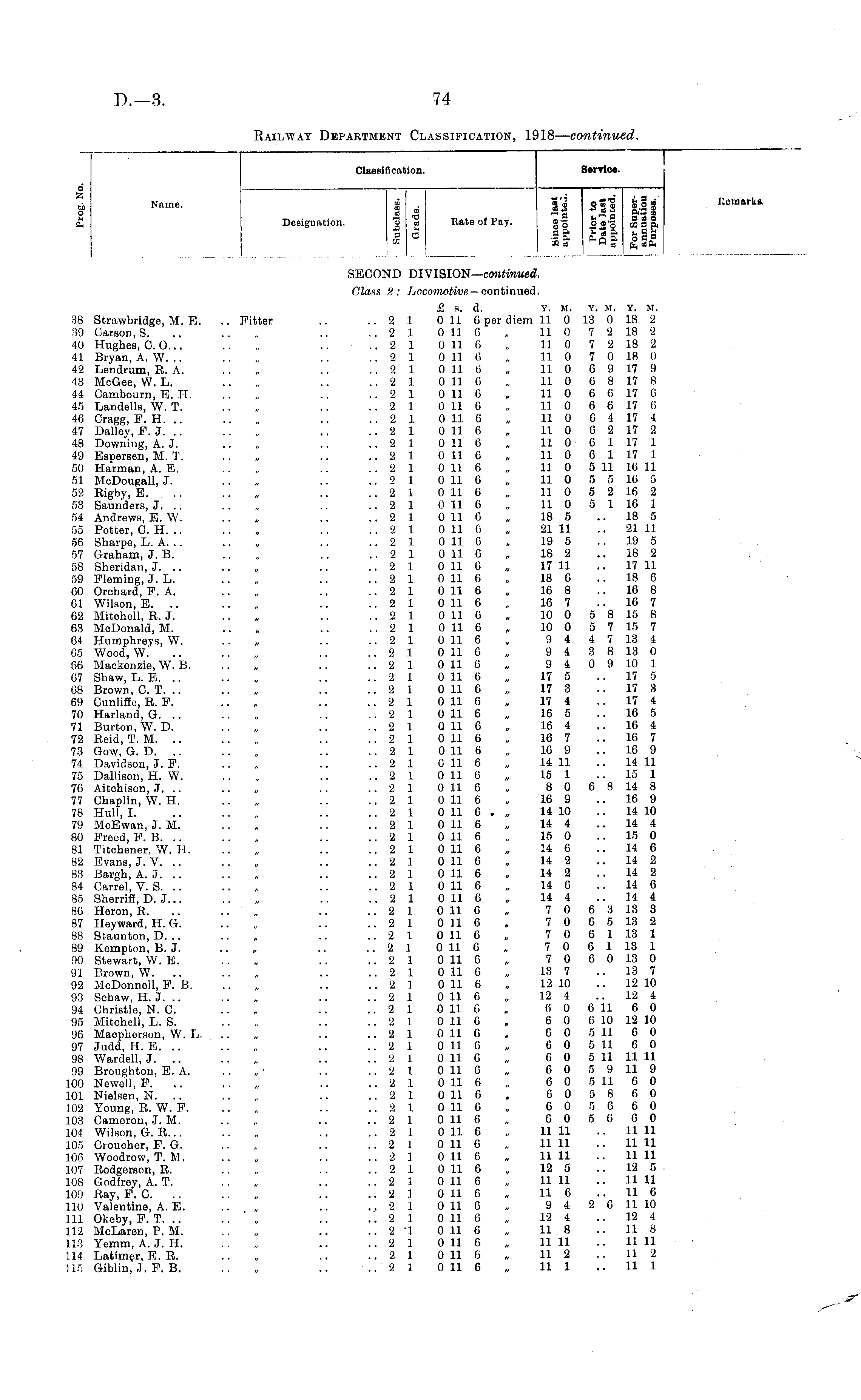 Classification. Service. to A Name. o fa ft d A, A o fa fi i I 4 \ H s jl tit Designation. o d Rate of Pay. ] o eo-g x 3 ft i <§ ,s| jig gi§ B ta d to as fn dft I'.omarka. SECOND DIVISION— continued. Class 2: Locomotive— continued. 38 Strawbridgo, M. E. 39 Carson, S. 40 Hughes, CO... 41 Bryan, A. W. .. 42 Lendrum, R. A. 43 McGee, W. L. 44 Cambourn, E. H. 45 Landells, W. T. 46 Cragg, F. H. .. 47 Dalley, F. J. 48 Downing, A. J. 49 Espersen, M. T. 50 Harman, A. E. 51 McDougall, J. 52 Rigby, E. , .. 53 Saunders, J. .. 54 Andrews, E. W. 55 Potter, 0. H. .. 56 Sharpe, L. A. .. 57 Graham, J. B. 58 Sheridan, J. .. 59 Fleming, J. L. 60 Orchard, F. A. 61 Wilson, E. .. 62 Mitchell, R. J. 63 MoDonald, M. 64 Humphreys, W. 65 Wood, W.' 66 Mackenzie, W. B. 67 Shaw, L. E. 68 Brown, 0. T. .. 69 CunliSe, R. F. 70 Harland, G. .. 71 Burton, W. D. 72 Reid, T. M. .. 73 Gow, G. D. 74 Davidson, J. F. 75 Dallison, H. W. 76 Aitchison, J. .. 77 Chaplin, W. H. 78 Hull, I. 79 MoEwan, J. M. 80 Freed, F. B. .. 81 Titchener, W. H. 82 Evans, J. V. .. 83 Bargh, A. J. .. 84 Carrel, V. S. 85 Sherrifi, D. J... 86 Heron, R. 87 Heyward, H. G. 88 Staunton,D. .. 89 Kempton, B. J. 90 Stewart, W. E. 91 Brown, W. 92 McDonnell, F. B. 93 Schaw, H.J. .. 94 Christie, N. G. 95 Mitchell, L. S. 96 Macpherson, W. L. 97 Judd, H. E. .. 98 Wardell, J. .. 99 Broughton, E. A. LOO Newell, F. L01 Nielsen, N. .. L02 Young, R. W. F. L03 Cameron, J. M. .04 Wilson, G. R... L05 Croueher, F. G. L06 Woodrow, T. M. .07 Rodgerson, R. .08 Godfrey, A. T. .09 Ray, F. C .10 Valentine, A. E. .11 Okeby, F. T. .. .12 McLaren, P. M. .13 Yemm, A. J. H. 14 Latimer, E. R. 15 Giblin, J. F. B. .. Fitter £ s. d. Y. M. Y. m. Y. M, ..2 1 0 11 6 per diem 11 0 1.3 0 18 2 ..2 1 0 11 0 „ 11 0 7 2 18 2 ..2 1 0 11 6 „ 11 0 7 2 18 2 ..2 1 0 11 6 „ 11 0 7 0 18 0 ..2 1 0 11 6 „ 11 0 6 9 17 9 ..2 1 0 11 0 „ 11 0 0 8 17 8 ..2 1 0 11 6 , 11 0 6 6 17 6 ..21 0 11 6 „ 11 0 6 6 17 6 ..2 1 0 11 6 „ 11 0 6 4 17 4 ..2 1 0 11 6 „ 11 0 0 2 17 2 ..2 1 0 11 6 „ 11 0 6 1 17 1 ..2 1 0 11 6 „ 11 0 0 1 17 1 ..2 1 0 11 6 „ 11 0 5 11 16 11 ..2 1 0 11 0 „ 11 0 5 5 16 5 ..2 1 0 11 6 „ 11 0 5 2 16 2 ..2 1 0 11 6 „ 11 0 5 1 16 1 ..2 1 0 11 6 „ 18 5 .. 18 5 ..21 0 11 6 „ 21 11 21 11 ..2 1 0 11 6 „ 19 5 19 5 ..2 1 0 11 6 „ 18 2 18 2 ..2 1 0 11 6 „ 17 11 .. 17 11 ..2 1 0 11 6 „ 18 6 18 6 ..2 1 0 11 6 „ 16 8 16 8 ..21 0 11 6 „ 16 7 .. 16 7 ..2 1 0 11 6 „ 10 0 5 8 15 8 ..21 0 11 6 „ 10 0 5 7 15 7 ..2 1 0 11 6 „ 9 4 4 7 13 4 ..2 1 0 11 6 „ 9 4 3 8 13 0 ..21 0 11 6 „ 9 4 0 9 10 1 ..21 0 11 6 „ 17 5 17 5 ..2 1 0 11 6 „ 17 3 .. 17 3 ..2 1 0 11 6 „ 17 4 17 4 ..2 1 0 11 6 „ 16 5 16 5 ..2 1 0 11 6 „ 16 4 .. 16 4 ..2 1 0 11 6 „ 16 7 .. 16 7 ..21 0116 „ 16 9 16 9 ..2 1 0 11 6 „ 14 11 .. 14 11 ..2 1 0 11 6 „ 15 1 .. 15 1 ..2 1 0 11 6 „ 8 0 6 8 14 8 ..21 0 11 6 „ 16 9 .. 16 9 ..21 0 11 6 . „ 14 10 .. 14 10 ..21 0 11 6 „ 14 4 14 4 ..2 1 0 11 6 „ 15 0 .. 15 0 ..2 1 0 11 0 „ 14 6 14 6 ..21 0 11 6 „ 14 2 .. 14 2 ..2 1 0 11 6 „ 14 2 .. 14 2 ..21 0 11 6 „ 14 6 .. 14 6 ..2 1 0 11 0 „ 14 4 14 4 ..2 1 0 11 6 „ 7 0 6 3 13 3 ..21 0110 „ 70 05 13 2 ..21 0 11 6 „ 7 0 6 1 13 1 ..2 1 0 11 0 „ 7 0 6 1 13 1 ..21 0 11 6 „ 7 0 6 0 13 0 ..21 0 11 6 „ 13 7 13 7 ..21 0 11 6 „ 12 10 .. 12 1.0 ..21 0 11 6 „ 12 4 12 4 ..21 0 11 6 . 60 6 11 6 0 2 1 0 11 6 „ 6 0 6 10 12 10 ..2 1 0 11 0 . 6 0 5 11 6 0 ..2 1 0 11 6 „ 6 0 5 11 6 0 ..21 0 11 6 „ 6 0 5 11 11 11 ..2 1 0 11 0 „ 6 0 5 9 11 9 ..2 1 0 11 6 „ 6 0 5 11 6 0 ..21 0 11 6 . 605860 ..21 0 11 6 „ 605660 ..2 1 0 11 6 „ 6 0 5 6 6 0 ..21 0 11 6 „ 11 11 .. H H ..21 0 11 6 „ H H ■ ■ H H ..2 1 0 11 6 „ 11 11 .. 11 11 ..21 0 11 6 „ 12 5 .. 3.2 5 ..2 1 0 11 6 „ 11 11 .. 11 11 ..2 1 0 11 0 „ 11 6 .. 11 6 ..21 0 11 6 „ 9 4 2 6 11 10 ..2 1 0 11 6 „ 12 4 12 4 ..2 1 0 11 6 „ 11 8 .. 11 8 ..2 1 0 11 6 „ 11 11 .. 11 H ..2 1 0 11 6 „ 11 2 .. 11 2 ..2 1 0 11 6 „ 11 1 .. H 1