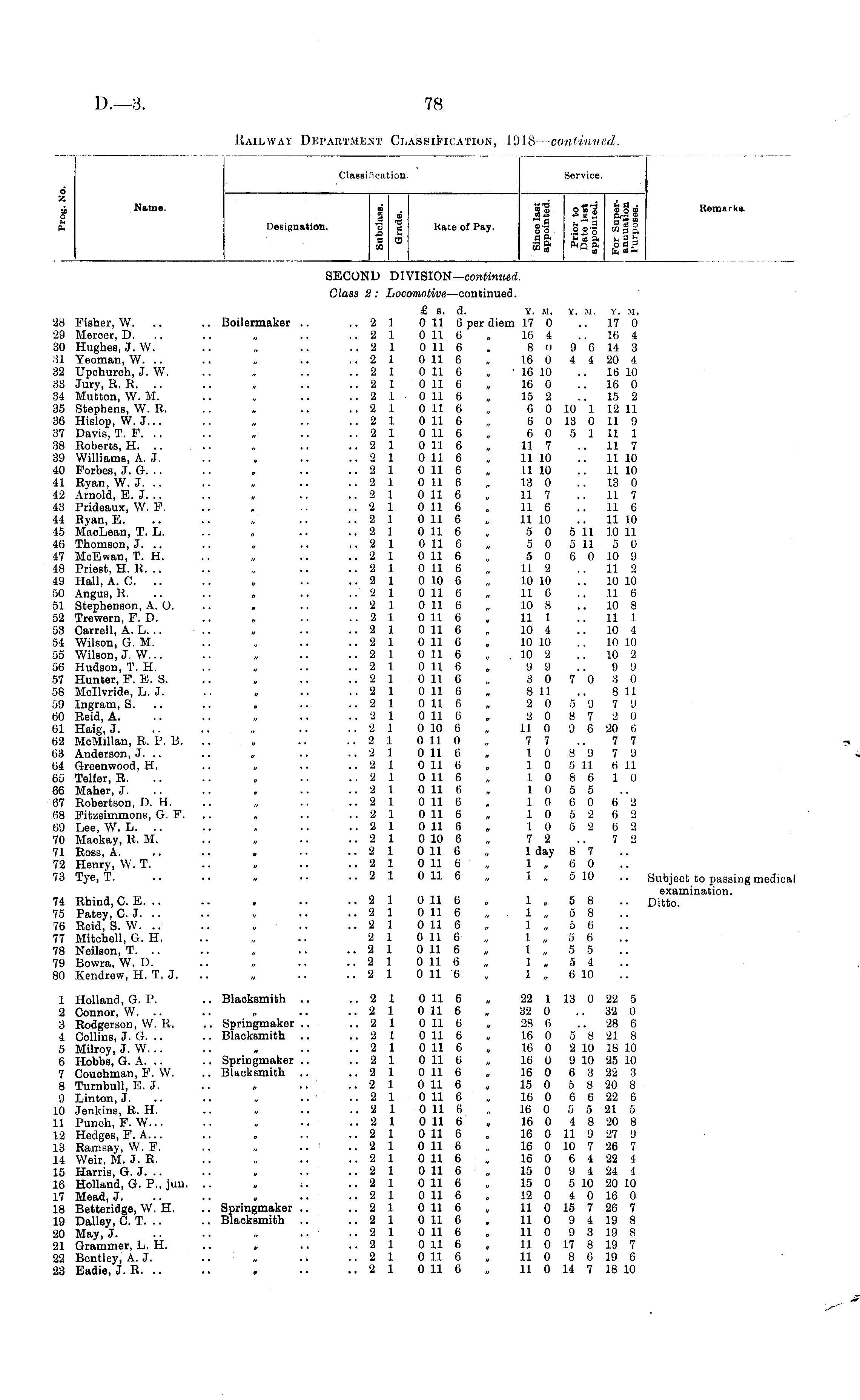 6 z; A o j. ft Name. Classification, £ 4 9 9 Ss fa 3 O X Rate of Pay. *»r-J 3 1 5 So d -t> *» d :S « B n- a So. oo-s a g, fa d ft S3 *Q S Service. fa B . to o d g..sZ CO tr-*» co rn d ° X jj p, Sb = ft dft j Remarks. Designation, SECOND DIVISION— continued. Class 2: Itocomotive —continued. 28 Fisher, W. .. 29 Mercer, D. 30 Hughes, J. W. 31 Yeoman, W. .. 32 Upohurch, J. W. 33 Jury, R. R. 34 Mutton, W. M. 35 Stephens, W. R. 36 Hislop, W. J... 37 Davis, T. F. 38 Roberts, H. ., 39 Williams, A. J. 40 Forbes, J. G. .. 41 Ryan, W. J. .. 42 Arnold, E.J... 43 Prideaux, W. F. 44 Ryan, E. 45 MacLean, T. L. 46 Thomson, J. 47 MoEwan, T. H. 48 Priest, H. R. .. 49 Hall, A. C. 50 Angus, R. 51 StephenBon, A. O. 52 Trewern, F. D. 53 Carrell, A. L. .. 54 Wilson, G. M. 55 Wilson, J. W... 56 Hudson, T. H. 57 Hunter, F. E. S. 58 Mollvride, L. J. 59 Ingram, S. 60 Reid, A. 61 Haig, J. 62 McMillan, R. P. B. 63 Anderson, J. .. 64 Greenwood, H. 65 Teller, R. 66 Maher, J. 67 Robertson, D. H. 68 Fitzsimmons, G. F. 69 Lee, W. L. 70 Mackay, R. M. 71 Ross, A. 72 Henry, W. T. 73 Tye, T. 74 Rhind, 0. E. .. 75 Patey, C.J. 76 Reid, S. W. .. 77 Mitchell, G. H. 78 Neilson, T. .. 79 Bowra, W. D. 80 Kendrew, H. T. J. .. Boilermaker .. £ S. d. Y. M. Y. M. Y. M. ..21. 0 11 6 per diem 17 0 .. 170 ..2 1 0 11 6 „ 16 4 10 4 ..2 1 0 11 6 . 8 (I 9 6 14 3 ..21 0 11 6 „ 16 0 4 4 20 4 ..2 1 0 11 6 „ ' 16 10 .. 16 10 ..2 1 0 11 6 „ 16 0 .. 16 0 ..21 0 11 6 „ 15 2 .. 15 2 ..2 1 0 11 6 „ 6 0 10 1 12 11 ..2 1 0 11 6 „ 6 0 13 0 1.1 9 ..2 1 0 11 6 „ 6 0 5 1 1.1 1 ..2 1 0 11 6 „ 11 7 .. 11 7 ..2 1 0 11 6 „ 11 10 .. 11 10 ..2 1 0 11 6 „ 11 10 .. 11 10 ..2 1 0 11 6 „ 13 0 .. 13 0 ..2 1 0 11 6 „ 11 7 .. 11 7 ..2 1 0 11 6 „ 11 6 .. 11 6 ..2 1 0 11 6 „ 11 10 .. 11 10 ..2 1 0 11 6 „ 5 0 5 11 10 11 ..2 1 0 11 6 „ 5 0 5 11 5 0 ..2 1 0 11 6 „ 5 0 6 0 10 9 ..2 1 0 11 6 „ 11 2 .. 11 2 ..21 0 10 0 „ 10 10 .. 1(3 10 ..2 1 0 11 6 „ 11 6 .. 11 6 ..2 1 0 11 6 „ 10 8 .. 10 8 ..2 1 0 11 6 „ 11 1 .. 11 1 ..2 1 0 11 6 „ 10 4 .. 10 4 ..21 0 11 6 „ 10 10 .. 10 10 ..2 1 0 11 6 „ . 10 2 .. 10 2 ..2 1 0 11 6 „ 9 9 .. 9 9 ..21 0116 „ 307030 ..2 1 0 11 6 „ 8 11 .. 8 11 ..2 1 0 11 6 „ 2 0 5 9 7 9 ..2 1 0 11 6 „ 2 0 8 7 2 0 ..21 0 10 6 „ 11 0 9 6 20 6 ..2 1 0 11 0 „ 7 7 .. 7 7 ..2 1 0 11 6 „ 10 8 9 7 9 ..21 0 11 6 „ 1 0 5 11 6 11 ..21 0 116 „ 10 86 10 ..21 0116 „ 10 55 ..21 0116 , 106062 ..21 0 11 6 „ 105262 ..21 0 11 6 „ 1 0 5 2 6 2 ..21 0 10 6 „ 72 .. 72 ..21 0116 „ 1 day 8 7 ..2 1 0 11 6 . 1 „ 6 0 ..2 1 0 11 6 „ 1 „ 5 .10 ..21 0116 „ 1 „ 58 ..2 1 0 11 6 „ 1 „ 5 8 ..2 1 0 11 6 „ 1 „ 5 6 2 1 0 11 6 „ 1 „ 5 6 ..2 1 0 11 6 „ 1 „ 5 5 ..2 1 0 11 6 „ 1 „ 5 4 ..2 1 0 11 6 „ 1 „ 6 10 Subject to passing modical examination. Ditto. 1 Holland, G. P. 2 Connor, W. .. 3 Rodgerson, W. R. 4 Collins, J. G. .. 5 Milroy, J. W. .. 6 Hobbs, G. A. 7 Couchman, F. W. 8 Turnbull, E. J. 9 Linton, J. 10 Jenkins, R. H. 11 Punch, F. W... 12 Hedges, F. A... 13 Ramsay, W. F. 14 Weir, M. J. R. 15 Harris, G. J. 16 Holland, G. P., jun. 17 Mead, J. 18 Betteridge, W. H. 19 Dalley, 0. T. 20 May, J. 21 Grammer, L. H. 22 Bentley, A. J. 23 Eadie, J. R. .. .. Blaoksmith .. .. Springmaker .. .. Blacksmith .. Springmaker .. .. Blacksmith I .. Springmaker .. .. Blaoksmith ■. 0 .. .. 0 .. ..2 1 0 11 6 „ 22 1 13 0 22 5 ..21 0116 „ 32 0 .. 32 0 ..2 1 0 11 6 „ 28 6 .. 28 6 ..2 1 0 11 6 „ 16 0 5 8 21 8 ..2 1 0 11 6 „ 16 0 2 10 18 10 ..2 1 0 11 6 „ 16 0 9 10 25 10 ..2 1 0 11 6 „ 16 0 6 3 22 3 ..2 1 0 11 6 „ 15 0 5 8 20 8 ..2 1 0 11 6 „ 16 0 6 6 22 6 ..2 1 0 11 6 „ 16 0 5 5 21 5 ..2 1 0 11 6 „ 16 0 4 8 20 8 ..21 0 11 6 „ 16 0 11 9 27 9 ..2 1 0 11 6 „ 16 0 10 7 26 7 ..21 0 11 6 „ 16 0 6 4 22 4 ..21 0 11 6 „ 15 0 9 4 24 4 ..21 0 11 6 „ 15 0 5 10 20 10 ..2 1 0 11 6 „ 12 0 4 0 16 0 ..2 1 0 11 6 „ 11 0 15 7 26 7 ..2 1 0 11 6 „ 11 0 9 4 19 8 ..2 1 0 11 6 „ 11 0 9 3 19 8 ..2 1 0 11 6 „ 11 0 17 8 19 7 ..2 1 0 11 0 „ 11 0 8 6 19 6 ..2 1 0 11 6 „ 11 0 14 7 18 10