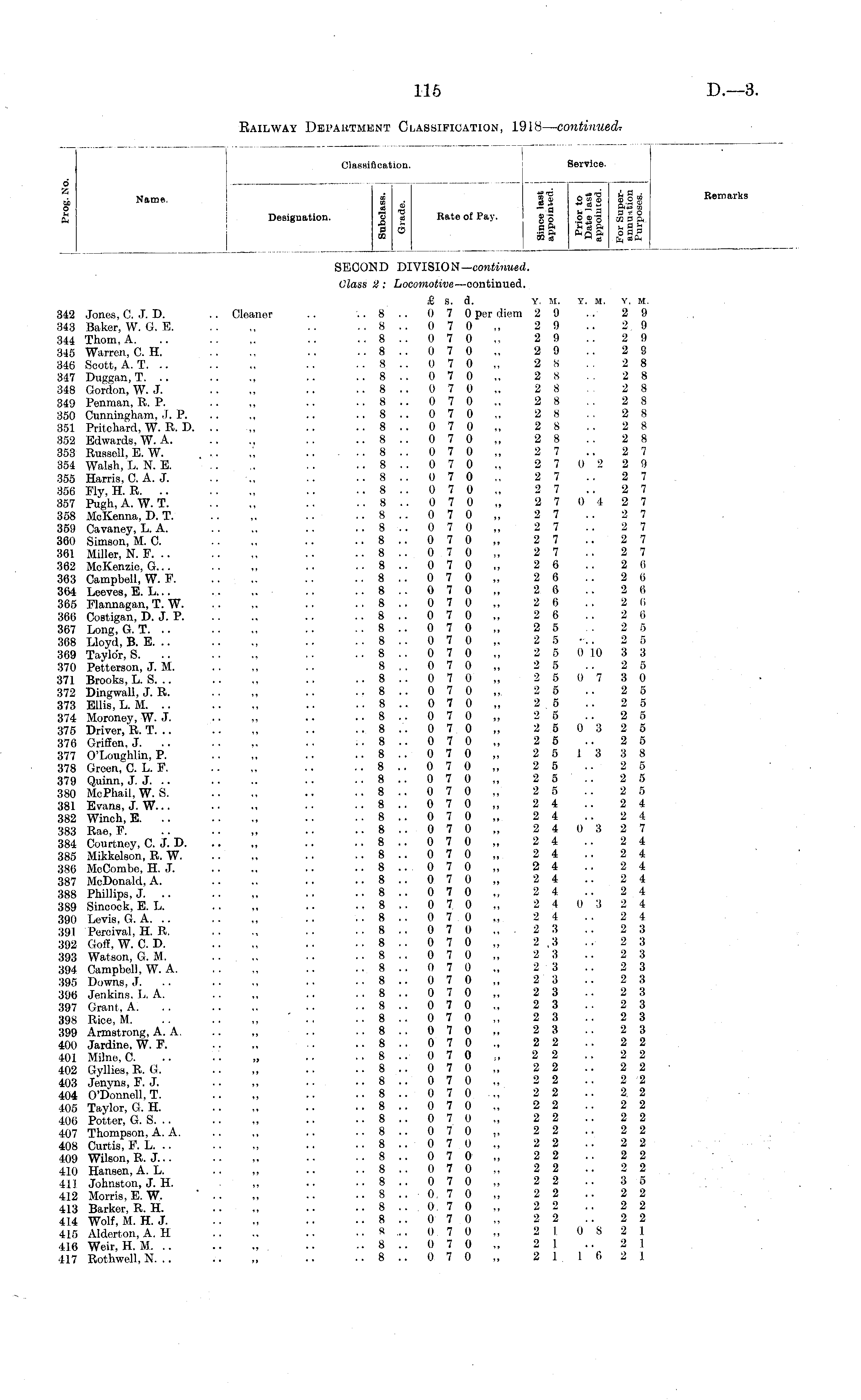 Classification. Service. 6 - u Name. § o; 11 Sfl o >o ~ a • ~ ~* £ Designation. o d Rate of Pay. •; org o a a a fa d a o to o" a Service. 11 S P ||| go .2 £ '3 »sa oft A *seft u gg "-ft PhA-3 Ofl-p 33 S3 W s! fn «&H tit a« as 3 d O at a a fa a fa o a 3 ft 9to R Remarks itei imi lar rki is SECOND DIVISION— continued. Class 2 : Locomotive —continued. £ s. d. y. m. y. at. 342 Jones, C. J. D. .. Cleaner .. .. 8 .. 0 7 0 per diem 2 9 343 Baker, W. G. E .. .. 8 .. 0 7 0 2 9 344 Thom.A. .. .. ,. .. .. 8 .. 0 7 0 „ 2 9 345 Warren, C. H. .. ., .. .. 8 .. 0 7 0 „ 2 9 346 Scott, A. T. .. .. „ .. • ■ 8 .. 0 7 0 „ 2 8 347 Duggan, T. .. .. ,, .. .. 8 .. 0 7 0 ,, 2 8 348 Gordon, W.J. ... ,, •■ .. 8 .. 0 7 0 „ 2 8 349 Penman, R. P. .. „ .. . . 8 .. 0 7 0 „ 2 8 350 Cunningham. J. P .. .. 8 .. 0 7 0 2 8 351 Pritchard, W. R. D. .. .„ .. .. 8 .. 0 7 0 „ 2 8 352 Edwards, W. A .. .. 8 .. 0 7 0 2 8 353 Russell, E. W. .. ,', 8 .. 0 7 0 „ 2 7 354 Walsh, L. N. E . . .. 8 . . 0 7 0 ., 2 7 0 2 355 Harris, C. A. J. .. ., .. .. 8 .. 0 7 0 ., 2 7 356 Fly, H. R .. .. 8 .. 0 7 0 ., 2 7 357 Pugh.A. W. T. .. ,, .. ... 8 ... 0 7. 0 .„ 2 7 0 4 358 McKenna, D. T. .. ,, ...: .. 8 .. 0 7 0 „ 2 7 359 Cavaney, L. A. .. 8 .. 0 7 0 „ 2 7 360 Simson, M. C. ... ., .. .. 8 .. 0 7 0 ,, 2 7 361 Miller, N. F. .. .. „ .. .. 8 ... 0.7 0 „ 2 7 362 McKenzie, G... .. ,, .. .. 8 .. 0 7 0 „ 2 6 363 Campbell, W. F .. .. 8 .. 0 7 0 „ 2 6 364 Loeves, E. L... .. ., .. .. 8 .. 0 7 0 „ 2 6 365 Flannagan, T. W ■• .. 8 .. 0 7 0 ,, 2 6 366 Costigan, D. J. P .. .. 8 .. 0 7 0 „ 2 6 367 Long, G. T. .. ... ., .. .. 8 .. 0 7 0 „ 2 5 368 Lloyd, B. E. .. .. ., •• . . 8 .. 0 7 0 ,. 2 5'.. 369 Taylor, S , ,. .. 8 .. 0 7 0 ,, 2 5 0 10 370 Potterson, J. M .. 8 .. 0 7.0 „ 2 5 371 Brooks, L. S •• .. 8 .. 0 7 0 „ 2 5 0 7 372 Dingwall, J. R. . . „ .. .. 8 .. 0 7 0 „, 2 5 373 Ellis, L. M. .. .. „ •• .. 8 ... 0 7.0 „ 2 5 374 Moroney, W. J. .. „ •• .. 8 .. 0 7 0 „ 2 5 375 Driver, R. T. .. .. „ ■• .. 8 .. 0 7 0 „ 2 5 0 3 376 Griffon, J. .. .. ,. •• .. 8 .. 0 7 0 „ 2 5 377 O'Loughlin, P. .. „ ■ ■ .. 8 .. 0 7 0 „ 2 5 13 378 Green, C. L. F. .'. „ ■■ .,. 8 ... Q 7.0 „ 2 5 379 Quinn, J. J. .. .. .. ■. .. 8 .. 0 7 0 „ 2 5 380 McPhail.W. S. .. „ .. .. 8 .. 0 7 0 „ 2 5 381 Evans, J. W... ■• „ •• .. 8 .. 0 7 0 „ 2 4 382 Winch, E •• .. 8 .. 0 7 0 „ 2 4 383 Rae, F •• .. 8 .. 0 7 0 „ 2 4 0 3 384 Courtney, C. J. D .. .. 8 .. 0 7 0 „ 2 4 385 Mikkelson, R. W ■■ .. 8 .. 0 7 0 „ 2 4 386 McCombe, H. J •• .. 8 ... 0 7 0 „ 2 4 387 McDonald, A. .. .. .. .. 8 .. 0 7 0 „ 2 4 388 Phillips, J. .. .. ,. •• .. 8 .. 0 7 0 „ 2 4 389 Sincock, E. L. .. „ .. .. 8 .. 0 7 0 „ 2 4 0 3 390 Levis, G. A. .. .. „ .. . . 8 .. 0 7 0 „ 2 4 39.1 Percival, H. R. .. ., ■■ .. 8 .. 0 7 0 „ 2 3 392 Goff, W. C. D. .. „ ■■ • ■ 8 .. 0 7 0 „ 2 ,3 393 Watson, G. M. .. ,. ■. .. 8 .. 0 7 0 ,, 2 3 394 Campbell, W. A. .. ., .. .. 8 .. 0 7 0 ., 2 3 395 Downs, J. .. ■■ ., •■ .. 8 .. 0 7 0 „ 2 3 396 Jenkins. L. A. .. „ . ■ .. 8 .. 0 7 0 „ 2 3 397 Grant, A. .. .. .. .. .. 8 .. 0 7 0 ., 2 3 398 Rice, M. .. .. „ ■■ .. 8 .. 0 7 0 „ 2 3 399 Armstrong, A. A. .. „ .. .. 8 .. 0 7 0 „ 2 3 400 Jardine, W. F. .. „ .. .. 8 .. 0 7 0 „ 2 2 401 Milne, C. .. .'. „ ■■ .. 8 .. 0 7 0 „ 2 2 402 Gyllies, R. G. .. „ ■■ .. 8 .. 0 7.0 „ 2 2 403 Jenyns, F. J. .. „ ■■ .. 8 .. 0 7 0 „ 2 2 404 O'Donnell, T. .. „ .. .. 8 .. 0 7 0 „ 2 2 405 Taylor, G. H. .. „ ■■ .. 8 .. 0 7 0 ., 2 2 406 Potter, G. S. .. .. ., ■■ .. 8 .. 0 7 (3 „ 2 2 407 Thompson, A. A. .. ,, .. .. 8 .. 0 7 0 2 2 408 Curtis, F. L. .. .-. „ ■■ .. 8... 0 7.0 „ 2 2 409 Wilson, R.J •• .. 8 .. 0 7 0 „ 2 2 410 Hansen, A. L. .. ,., ..' .. 8 .. 0 7 0 ., 2 2 411 Johnston, J. H. „ •■ .. 8 .. 0 7 0 „ 2 2 412 Morris, E. W. ' ■■ „ •• .. 8 .. 0, 7 0 „ 2 2 413 Barker, R. H. .. „ ■■ .. 8 .. 0 7 0 „ 2 2 414 Wolf, M.H.J. „ ■■ •• 8 .. 0 7 0 „ 2 2 415 Alderton.A. H .. .. .. ...... 0 7 0 „ 2 1 0 S 416 Weir, H. M. .. .. „ . ■■ .. 8 .. 0. 7. .0: „ 2 1 417 Rothwell, N. .. .. „ ■■ .. 8 .. 0 7 0 „ 2 116 Y. M. 2 9 2 9 2 9 2 9 2 8 2 8 2 8 2 8 2 8 2 8 2 8 2 7 2 9 2 7 2 7 2 7 2 7 2 7 2 7 2 7 2 6 2 6 2 6 2 (i 2 6 2 5 2 5 3 3 2 5 3 0 2 5 2 5 2 5 2 5 2 5 3 8 2 5 2 5 2 5 2 4 2 4 2 7 2 4 2 4 2 4 2 4 2 4 2 4 2 4 2 3 2 3 2 3 2 3 2 3 2 3 2 3 2 3 2 3 2 2 2 2 2 2 2 2 2 2 2 2 2 2 2 2 2 2 2 2 2 2 3 5 2 2 2 2 2 2 2 I 2 1 2 J.