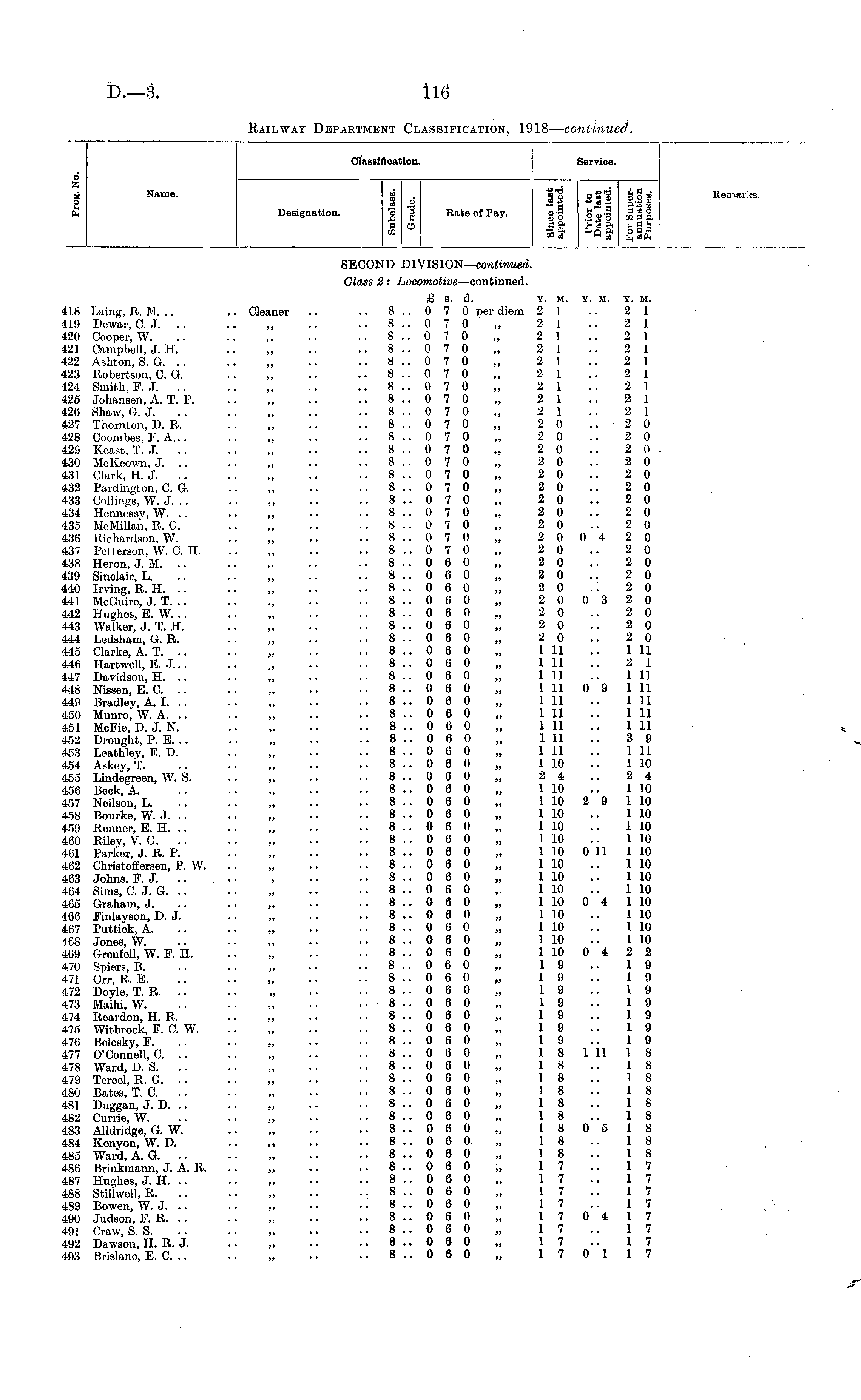 Classification. Service. to A Name. o ft Designation. o* to $ s Name. as S"0 J 4 H , o d Rate of Pay. o-3 Ss fa J 9 o o a aft m S3 ii sit "IB fa"a go ,SJo a g> fa d a S3 -2S2 fa— a .2 So fad ft ftng, tit a« ca o t o x s a fa a fa o a 3 ft *to ill a« co o u o m s a fa a fa o a 3 ft *to Remailra. Ren mailra. SECOND DIVISION— continued. Class 2: Locomotive —continued. 418 Laing, R. M. .. .. Cleaner 419 Dewar, O.J. .. 420 Cooper, W. 421 Campbell, J. H. 422 Ashton, S. G. .. 423 Robertson, C. G. 424 Smith, F. J. .. 425 Johansen, A. T. P. 426 Shaw, G. J. 427 Thornton, D. R. 428 Coombes, F. A... 425 Keast, T. J. .. 430 McKeown, J. .. 431 Clark, H. J. .. 432 Pardington, C G. 433 Collings, W. J. .. 434 Hennessy, W. .. • • ,, 435 McMillan, R. G. 436 Richardson, W. •• ,. 437 Pelterson, W. C. H 438 Heron, J. M. .. 439 Sinclair, L. .. .. „ 440 Irving, R. H. .. 441 McGuire, J. T. .. 442 Hughes, E. W. . . 443 Walker, J. T. H. 444 Ledsham, G. R. .. ,, 445 Clarke, A. T. .. 446 Hartwell, E. J... 447 Davidson, H. .. .. „ 448 Nissen, E. C. .. 449 Bradley, A. I. .. 450 Munro, W. A. .. 451 McFie, D. J. N. 452 Drought, P. E. .. 453 Leathley, E. D. 454 Askey, T. 455 Lindegreen, W. S. .. ,, 456 Beck, A. .. 457 Neilson, L. .. .. ,, 458 Bourke, W. J. .. 459 Rennor, E. H. .. 460 Riley, V. G. .. 461 Parker, J. R. P. 462 Christofforsen, P. W. 463 Johns, F. J. .. ... 464 Sims, C. J. G. .. 465 Graham, J. .. .. „ 466 Finlayson, D. J. 467 Puttick, A. 468 Jones, W. 469 Greniell, W. F. H. 470 Spiers, B. 471 Orr, R. E. .. 472 Doyle, T. R. .. 473 Maihi, W. 474 Reardon, H. R. 475 Witbrock, F. C. W. 476 Belesky, F. .. 477 O'Connell, C. .. 478 Ward, D. S. .. 479 Tercel, R. G. .. 480 Bates, T. C. .. 481 Duggan, J. D. .. 482 Currie, W. 483 Alldridge, G. W. 484 Kenyon, W. D. 485 Ward, A. G. .. 486 Brinkmann, J. A. R. .. ,, 487 Hughes, J. H. .. 488 Stillwell, R. 489 Bowen, W. J. -. 490 Judson, F. R. .. 491 Craw, S. S. 492 Dawson, H. R. J. 493 Brislano, E. C. .. £ s. d. Y. M. 8 .. 0 7 0 per diem 2 I .. 8 .. 0 7 0 „ 2 1 8 .. 0 7 0 „ 2 1 8 .. 0 7 0 „ 2 1 .. 8 .. 0 7 0 ,, 2 1 .. 8 .. 0 7 0 „ 2 1 8 .. 0 7 0 „ 2 1 8 .. 0 7 0 „ 2 1. .. 8 .. 0 7 0 ,, 2 1 .. 8 .. 0 7 0 ,, 2 0 .. 8 .. 0 7 0 „ 2 0 8 .. 0 7 0 „ 2 0 8 .. 0 7 0 „ 2 0 .. 8 .. 0 7 0 „ 2 0 8 .. 0 7 0 „ 2 0 8 .. 0 7 0 „ 2 0 8 .. 0 7 0 „ 2 0 8 .. 0 7 0 „ 2 0 8 .. 0 7 0 „ 2 0 8 .. 0 7 0 „ 2 0 8 .. 0 6 0 „ 2 0 .. 8 .. 0 6 0 „ 2 0 .. 8 .. 0 6 0 „ 2 0 8 .. 0 6 0 „ 2 0 8 .. 0 6 0 ., 2 0 .. 8 .. 0 6 0 „ 2 0 .. 8 .. 0 6 0 „ 2 0 8 .. 0 6 0 „ 1 11 8 .. 0 6 0 „ I 11 8 .. 0 6 0 „ 1 11 8 .. 0 6 0 „ 1 11 8 .. 0 6 0 „ 1 11 .. 8 .. 0 6 0 „ 1 11 8 .. 0 6 0 „ 1 11 .. 8 .. 0 6 0 „ 1 11 .. 8 .. 0 6 0 „ 1 11 8 .. 0 6 0 „ 1 10 .. 8 .. 0 6 0 „ 2 4 8 .. 0 6 0 „ 1 10 8 .. 0 6 0 „ 1 10 8 .. 0 6 0 „ 1 10 .. 8 .. 0 6 0 „ 1 10 8 .. 0 6 0 „ 1 10 8 .. 0 6 0 „ 1 10 .. 8 .. 0 6 0 „ 1 10 .. 8 .. 0 6 0 „ 1 10 .. 8 .. 0 6 0 ,. 1 10 .. 8 .. 0 6 0 „ 1 10 .. 8 .. 0 6 0 „ 1 10 .. 8 .. 0 6 0 „ 1 10 .. 8 .. 0 6 0 „ 1 10 .. 8 .. 0 6 0 „ 1 10 8 .. 0 6 0 „ 19 8 .. 0 6 0 „ 19 .. 8 .. 0 6 0 „ 19 .. ■ 8 .. 0 6 0 „ 19 8 .. 0 6 0 „ 19 .. 8 .. 0 6 0 „ 19 8 .. 0 6 0 „ 19 .. 8 .. 0 6 0 „ 18 .. 8 .. 0 6 0 „ 18 8 .. 0 6 0 „ 18 8 .. 0 6 0 „ 18 8 .. 0 6 0 „ 18 .. 8 .. 0 6 0 „ 18 8 .. 0 6 0 „ 18 .. 8 .. 0 6 0 „ 18 .. 8 .. 0 6 0 „ 18 .. 8 .. 0 6 0 „ 17 .. 8 .. 0 6 0 „ 17 8 .. 0 6 0 „ 17 8 .. 0 6 0 „ 17 8 .. 0 6 0 „ 17 8 .. 0 6 0 „ 17 8 .. 0 6 0 „ 17 .. 8 .. 0 6 0 „ 17 Y. M. 0 4 0 3 0"9 2 9 oil 0 4 0 4 1 11 0"5 0"4 0 1 Y. M. 2 1 2 I 2 I 2 1 2 1 2 1 2 1 2 1 2 1 2 0 2 0 2 0 . 2 0 2 0 2 0 2 0 2 0 2 0 2 0 2 0 2 0 2 0 2 0 2 0 2 0 2 0 2 0 1 11 2 1 1 11 1 11 1 11 I 11 1 11 3 9 1 11 1 10 2 4 1 10 1 10 1 10 1 10 1 10 1 10 1 10 1 10 1 10 1 10 1 10 1 10 1 10 2 2 1 9 1 9 1 9 1 9 1 9 1 9 1 9 1 8 1 8 1 8 1 8 1 8 1 8 1 8 1 8 1 8 1 7 1 7 1 7 1 7 1 7 1 7 1 7 1 7