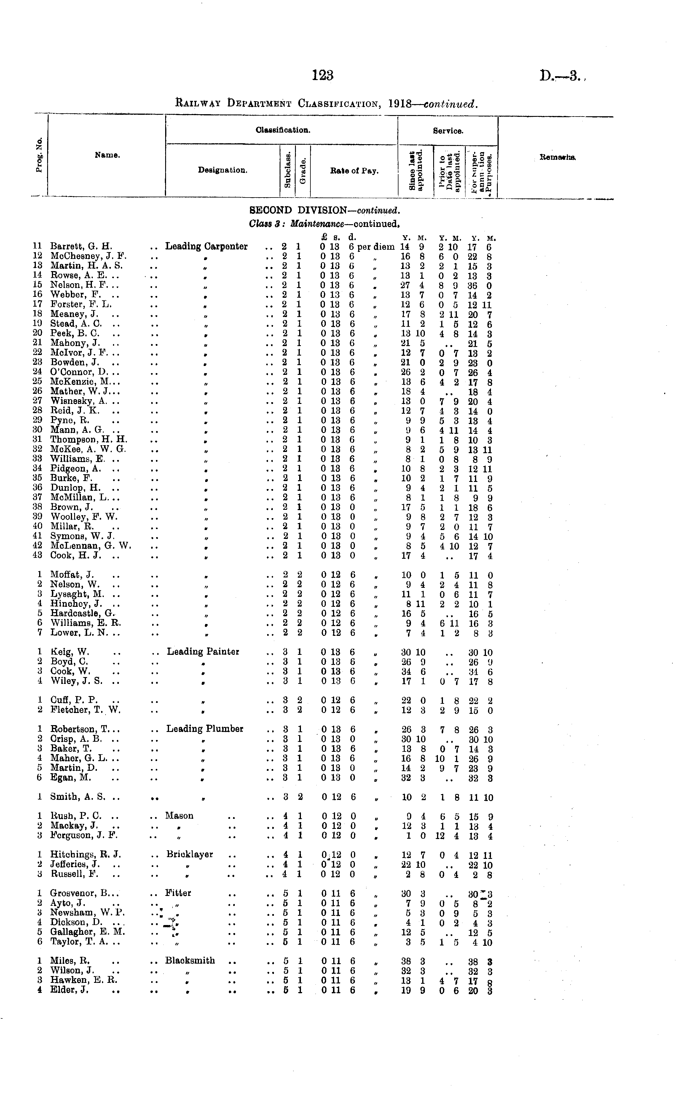 Classification. Service. 6 X ft Name. to to 4 "o fi 0 oS Bate of Fay. ■gtti SS " a 11 11 sf! i.- 3 .2 So t S -a 5 ill = ■ G ifafa525 | Reramrlia Desiguation. •P 5 SECOND DIVISION— continued. Class 31 Maintenance —continued. 11 Barrett, G. H. 12 McChesney, J. F. 13 Martin, H. A. S. 14 Rowse, A. E. 15 Nelson, H. F. .. 16 Webber, F. .. 17 Forster, F. L. 18 Meaney, J. 19 Stead, A. C 20 Peek, B.C. .. 21 Mahony, J. .. 22 Molvor, J. F. .. 23 Bowden, J. 24 O'Connor, D. .. 25 McKenzio, M... 26 Mather, W.J... 27 Wisnesky, A. .. 28 Reid, J. K. .. 29 Pync, R. 30 Mann, A, G. 31 Thompson, H. H. 32 McKee, A. W. G. 33 Williams, E. .. 34 Pidgeon, A. .. 35 Burke, F. 36 Dunlop, H. .. 37 McMillan, L. .. 38 Brown, J. 39 Woolley, F. W. 40 Millar, R. 41 Symons, W. J. 42 MoLennan, G. W. 43 Cook, H. J. .. Leading Carpenter • • 0 • • 0 • • a • • a 0 • • a • • 0 • • 0 • • a • • a £ 8. d. Y. M. Y. M. Y. M. : ..21 0 13 6 per diem 14 9 2 10 17 6 ..2 1 0 13 6 „ 16 8 6 0 22 8 ..2 1 0 13 6 „ 13 2 2 1 15 3 ..21 0 13 6 „ 13 1 0 2 13 3 ..2 1 0 13 6 , 27 4 8 9 36 0 ..2 1 0 13 6 „ 13 7 0 7 14 2 ..2 1 0 13 6 „ 12 6 0 5 12 11 ..2 1 0 13 6 „ 17 8 2 11 20 7 ..2 1 0 13 6 „ 11 2 1 5 12 6 ..2 1 0 13 6 „ 13 10 4 8 14 3 ..2 1 0 13 6 „ 21 5 .. 21 5 ..2 1 0 13 6 , 12 7 0 7 13 2 ..21 0 13 6 „ 21 0 2 9 23 0 ..2 1 0 13 6 , 26 2 0 7 26 4 ..21 0 13 6 „ 13 6 4 2 17 8 ..2 1 0 13 6 , 18 4 .. 18 4 ..2 1 0 13 6 „ 13 0 7 9 20 4 ..2 1 0 13 6 „ 12 7 4 3 14 0 ..21 0 13 6 „ 9 9 5 3 13 4 ..2 1 0 13 6 „ 9 6 4 11 14 4 ..2 1 0 13 6 „ 9 1 1 8 10 3 ..2 1 0 13 6 „ 8 2 5 9 13 11 ..21 0 13 6 „ 8108 89 ..2 1 0 13 6 „ 10 8 2 3 12 11 ..21 0 13 6 „ 10 2 1 7 11 9 ..2 1 0 13 6 „ 9 4 2 1 11 5 ..21 0 13 6 „ 8118 99 ..2 1 0 13 0 „ 17 5 1 1 18 6 ..21 0 13 0 „ 9 8 2 7 12 3 • •2 1 0 13 0 „ 9 7 2 0 11 7 ..2 1 0 13 0 „ 9 4 5 6 14 10 ..2 1 0 13 0 „ 8 5 4 10 12 7 ..2 1 0 13 0 „ 17 4 .. 17 4 1 Moffat, J. 2 Nelson, W. .. 3 Lysaght, M. .. 4 Hinohoy, J. .. 5 Hardcastle, (3. 6 Williams, E. R. 7 Lower, L. N. • • 0 ..2 2 0 12 6 , 10 0 1 5 11 0 ..2 2 0 12 6 „ 9 4 2 4 11 8 ..22 0 12 6 „ 11 1 0 6 11 7 -.2 2 0 12 6 „ 8 11 2 2 10 1 ..22 0 12 6 „ 16 5 .. 16 5 ..2 2 0 12 6 „ 9 4 6 11 16 3 ..22 0 12 6 . 74 12 83 1 Keig, W. 2 Boyd, C 3 Cook, W. 1 Wiley, J. S. .. Leading Painter • • 0 ..3 1 0 13 6 „ 30 10 .. 30 10 ..3 1 0 13 6 „ 26 9 .. 26 9 ..3 1 0 13 6 „ 34 6 .. 34 6 ..3 1 0 13 6 , 17 1 0 7 17 8 1 Guff, P. P. 2 Fletoher, T. W. .. 0 ..32 0 12 6 „ 22 0 1 8 22 2 ..3 2 0 12 6 „ 12 3 2 9 15 0 1 Robertson, T... 2 Crisp, A. B. 3 Baker, T. 4 Maher, G. L. .. 5 Martin, D. 6 Egan, M. .. Leading Plumber .. . • ■ . ..31 0 13 6 „ 26 3 7 8 26 3 ..31 0 13 0 „ 30 10 .. 30 10 ..3 1 0 13 6 „ 13 8 0 7 14 3 ..3 1 0 13 6 „ 16 8 10 1 26 9 ..3 1 0 13 0 „ 14 2 9 7 23 9 ..3 1 0 13 0 „ 32 3 .. 32 3 1 Smith, A. S. .. • • » ..3 2 0 12 6 „ 10 2 I 8 11 10 1 Rush, P. 0. 2 Maokay, J. 3 Forguson, J. F. .. Mason ... .. ..4 1 0 12 0 „ 9 4 6 5 15 9 ..4 1 0 12 0 . 12 3 1 1 13 4 ..4 1 0 12 0 . 1 0 12 4 13 4 1 Hitchings, R. J. 2 Jefieries, J. 3 Russell, F. .. .. Bricklayer •. 0 • • ..4 1 0.12 0 „ 12 7 0 1 12 11 ..4 1 0 12 0 „ 22 10 .. 22 10 ..41 0 12 0 „ 28 012 8 1 Groavenor, B... 2 Ayto, J. 3 Nowaham, W. P. 4 Diokson, D. ... 5 Gallagher, E. M. 6 Taylor, T. A. .. Fitter W * * — ■ " • * ..5 1 0 11 6 „ 30 3 .. 30 "3 ..5 1 0 11 6 „ 7 9 0 5 8~2 ..51 0116 „ 53 09 53 ..51 0 110 . 4102 43 ..51 0 11 6 „ 12 5 .. 12 5 ..51 0 11 6 „ 3 5 1 5 4 10 1 Miles, R. 2 Wilson, J. 3 Hawken, E. R. 4 Elder, J. .. Blacksmith ..5 1 0 11 6 , 38 3 .. 38 3 ..5 1 0 11 6 „ 32 3 .. 32 3 ..5 1 0 11 6 „ 13 1 4 7 17 8 ..5 1 0 11 6 . 19 9 0 6 20 3