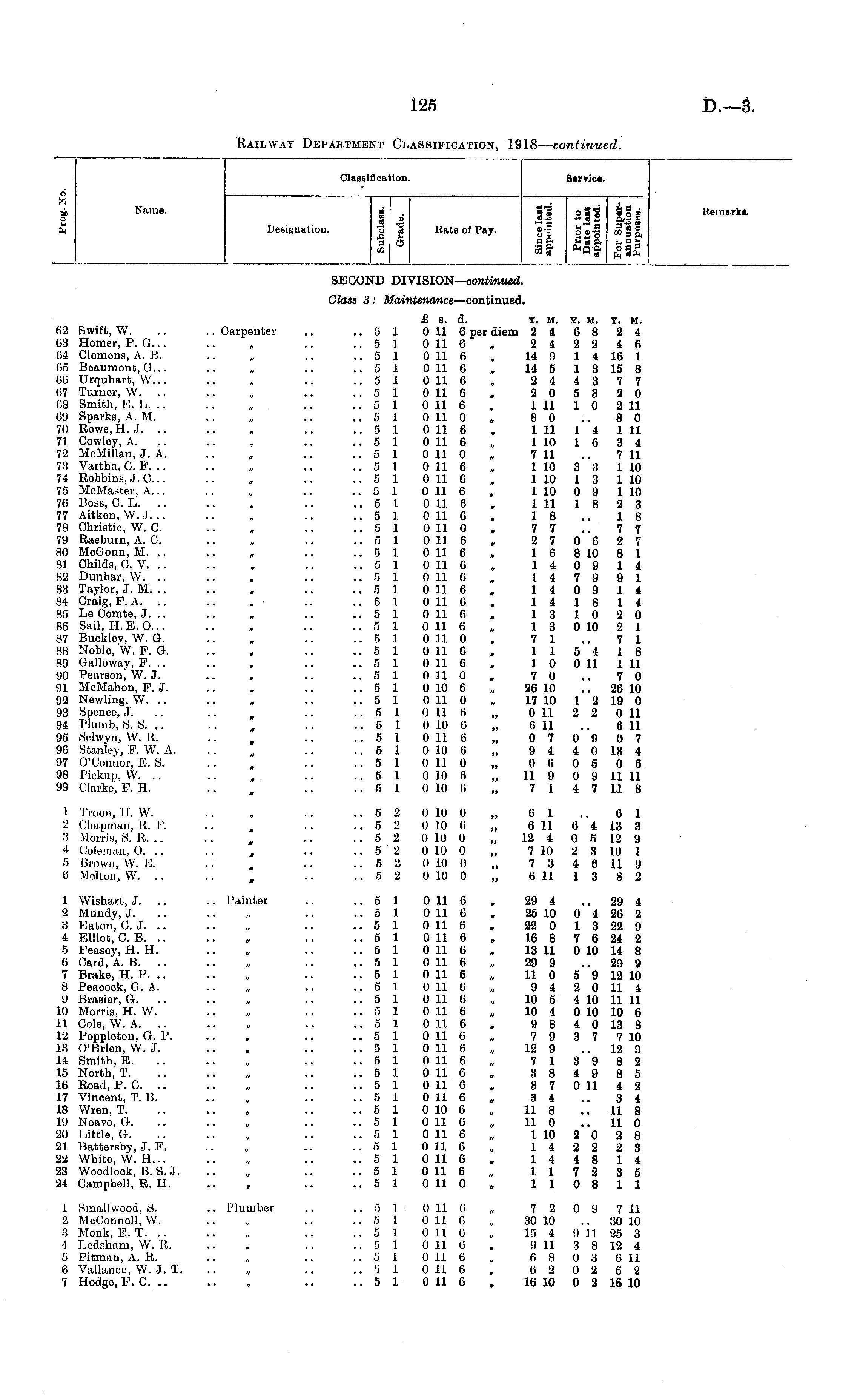 Classification. Service. o to A o fa ft Name. Designation. 1 9 £ -o 9 d ■o £ 3 0 CD Rate of Pay. S2 ••s u 2 a a S 3 aft isi fa"-a 3-gg .2 S'3 "sS fa d a fa a fa Sfi-S oaf Keinarki. SECOND DIVISION— continued. Class 3: Maintenance —continued. 62 Swift, W. 63 Homer, P. G... 64 Clemens, A. B. 65 Beaumont, G... 66 Urquhart, W... 67 Turner, W. .. 68 Smith, E. L. 69 Sparks, A. M. 70 Rowe, H. J. 71 Cowley, A. 72 McMillan, J. A. 73 Vartha, C.F... 74 Robbins.J. 0... 75 McMaster, A... 76 Boss, 0. L. 77 Aitken, W. J. .. 78 Christie, W, C 79 Raeburn, A. 0. 80 MoGoun, M. .. 81 Childs, 0. V. 82 Dunbar, W. .. 83 Taylor, J. M. .. 84 Craig, F. A. .. 85 Le Oomte, J. .. 86 Sail, H. E.O... 87 Buckley, W. G. 88 Noblo, W. F. G. 89 Galloway, F. .. 90 Pearson, W. J. 91 McMahon, F. J. 92 Newling, W. .. 93 Sponce, J. 94 Plumb, S. S. 95 Selwyn, W. R. 96 Stanley, F. W. A. 97 O'Connor, E. S. 98 Pickup, W. .. 99 Clarke, F. H. .. Carpenter • • a • • 0 • • ii m m m n ' ' it M «y £ B. d. Y. M. Y. M. Y. M. ..51 0 11 6 per diem 24 68 24 ..51 0 116 , 24 22 46 ..5 1 0 11 6 . 14 9 1 4 16 1 ..51 0 11 6 . 14 5 1 3 15 8 ..51 0 116 „ 24 43 77 ..51 0 116 „ 20 53 20 ..5 1 0 11 6 . 1 11 1 0 2 11 ..5 1 0 11 0 „ 8 0 .. 8 0 ..5 1 0 11 6 , 1 11 1 4 1 11 ..5 1 0 11 6 „ 1 10 1 6 3 4 ..5 1 0 11 0 , 7 11 .. 7 11 ..51 0 11 6 . 1 10 3 3 1 10 ..5 1 0 11 6 , 1 10 1 3 1 10 ..5 1 0 11 6 , 1 10 0 9 1 10 ..51 011 6 . 11118 23 ..51 0 116 . 18 .. 18 ..51 0 110 . 77 .. 77 ..51 0 116 . 27 06 27 ..51 0 116 . 16 8 10 81 ..51 0 116 „ 14 09 14 ..51 0 116 . 14 79 91 ..51 0 116 . 14 09 14 ..51 0 116 . 14 18 14 ..51 0 116 . 13 10 20 ..51 0 11 6 , 1 3 0 10 2 1 ..51 0 110 . 71 .. 71 ..51 0 116 , 1154 18 ..5 1 0 11 6 . 1 0 0 11 1 11 ..51 0 110 . 70 .. 70 ..51 0 10 6 „ 26 10 .. 26 10 ..5 1 0 11 0 „ 17 10 1 2 19 0 ..5 1 0 II 6 „ 0 11 2 2 0 11 ..5 1 0 10 6 „ 6 11 .. 6 11 ..5 1 0 116 „ 07 09 07 ..5 1 0 10 6 „ 9 4 4 0 13 4 ..51 0 110 „ 06 05 06 ..5 1 0 10 6 „ II 9 0 9 11 11 ..5 1 0 10 6 „ 7 I 4 7 11 8 1 Troon, H. W. 2 Chapman, R. F. 3 Morris, S. R. .. 4 Coleman, 0. .. 5 Brown, W. E. 6 Melton, W. .. 0 ' *. * m ..52 0 10 0 „ 61 .. 61 ..5 2 0 10 0 „ 6 11 6 4 13 3 ..5 2 0 10 0 „ 12 4 0 5 12 9 ..52 0 10 0 „ 7 10 2 3 10 1 ..5 2 0 10 0 „ 7 3 4 6 11 9 ..52 0 10 0 „ 611 13 82 1 Wishart, J. .. 2 Mundy, J. 3 Eaton, 0. J. 4 Elliot, B.B. .. 5 Feasey, H. H. 6 Card, A. B. 7 Brake, H. P. 8 Peaoock, G. A. 9 Brasier, G. 10 Morris, H. W. 11 Cole, W. A. 12 Poppleton, G. P. 13 O'Brien, W. J. 14 Smith, E. 15 North, T. 16 Read, P. C. 17 Vincent, T. B. 18 Wren, T. 19 Neave, G. 20 Little, G. 21 Battersby, J. F. 22 White, W. H... 23 Woodlock, B. S, J, 24 Campbell, R. H. .. Painter ..51 0 II 6 . 29 4 .. 29 4 ..5 1 0 11 6 . 26 10 0 4 26 2 ..5 1 0 11 6 „ 22 0 1 3 22 9 ..5 1 0 11 6 „ 16 8 7 6 24 2 ..5 1 0 11 6 „ 13 11 0 10 14 8 ..5 1 0 11 6 „ 29 9 .. 29 9 ..51 0 11 6 „ 11 0 5 9 12 10 ..5 1 0 11 6 „ 9 4 2 0 11 4 ..51 0 11 6 „ 10 5 4 10 11 11 ..5 1 0 11 6 . 10 4 0 10 10 6 ..51 0 116 . 98 40 13 8 ..5 1 0 11 6 „ 7 9 3 7 7 10 ..51 0 11 6 „ 12 9 .. 12 9 ..51 0 116 „ 7139 82 ..51 0 116 „ 38 49 85 ..51 0 116 . 37 Oil 42 ..51 0 116 „ 34 .. 34 ..5 1 0 10 6 „ 11 8 .. 11 8 ..5 1 0 11 6 „ 11 0 .. 11 0 ..5 1 0 11 6 „ 1 10 2 0 2 8 ..51 0 116 „ 14 22 23 ..51 0 116 , 14 48 14 ..51 0 11 6 „ 117235 ..51 0 110 . 1108 11 1 Smallwood, S. 2 McConnell, W. 3 Monk, E. T. 4 Ledsham, W. R. 5 Pitman, A. R. 6 Vallance, W. J. T. 7 Hodge, F. C. .. .. Plumber .. 5 1 0 11 6 „ 7 2 0 9 7 11 ..51 0 11 6 „ 30 10 .. 30 10 ..5 1 0 11 6 15 4 9 11 25 3 ..51 0 11 6 . 9 11 3 8 12 4 ..51 0 11 6 „ 6 8 0 3 6 11 ..51 0 116 . 62 02 62 ..51 0 11 6 . 16 10 0 2 16 10