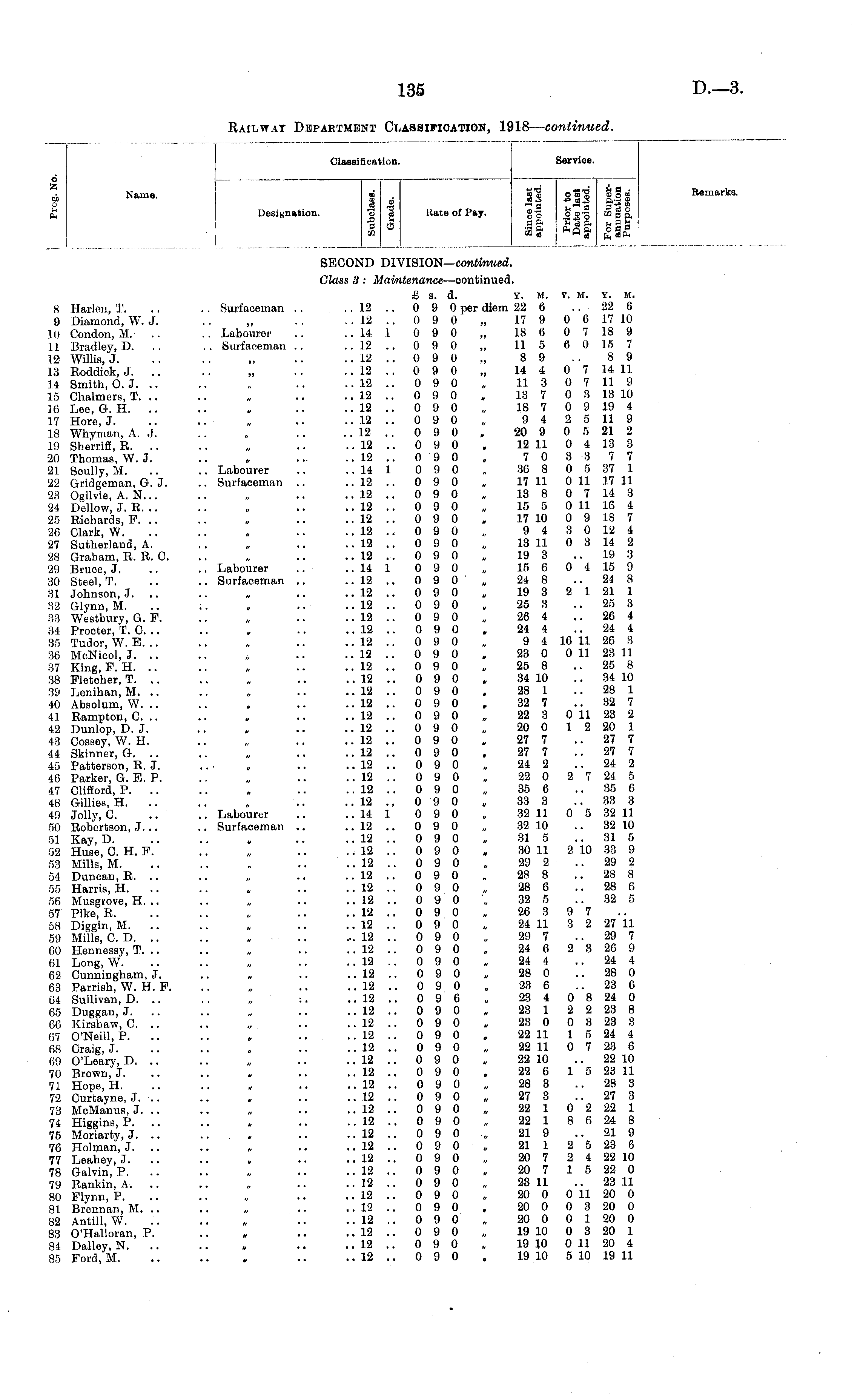 Classification. Service. o — A Name. g || o|| || | £ Designation. "3 3 Kate of Pay. g-g o o-g to § §, 3 3 aS , ?"Sa-fa2S Classification. Service. Remarks. SECOND DIVISION— continued. Class 3 : Maintenance —continued. £ s. d. Y. M. Y. M. Y. M. 8 Harlen, T. .. . . Surfaceman . . .. 12 .. 0 9 0 per diem 22 6 .. 22 6 9 Diamond, W. J. . . „ .. .. 12 .. 0 9 0 „ 17 9 0 6 17 10 10 Condon, M. .. .. Labourer .. ..14 1 0 9 0 „ 18 6 0 7 18 9 11 Bradley, D. .. .. Surfaceman .. .. 12 .. 0 9 0 „ 11 5 6 0 15 7 12 Willis, J , .. ..12 .. 0 9 0 „ 8 9 .. 8 9 13 Roddick, J „ .. .. 12 .. 0 9 0 „ 14 4 0 7 14 11 14 Smith, 0. J .. .. 12 .. 0 9 0 „ 11 3 0 7 11 9 15 Chalmers, T. .. .. „ .. .. 12 .. 0 9 0 , 13 7 0 3 13 10 16 Lee, G. H . .. .. 12 .. 0 9 0 „ 18 7 0 9 19 4 17 Hore, J. .. .. „ .. .. 12 .. 0 9 0 „ 9 4 2 5 11 9 18 Whyman, A. J. .. „ .. .. 12 .. 0 9 0 20 9 0 5 21 2 19 Sherriff, R „ .. .. 12 .. 0 9 0 , 12 11 0 4 13 3 20 Thomas, W.J. .. » 12 .. 0 9 0 , 7 0 3 3 7 7 21 Scully, M. .. .. Labourer .. .. 14 1 0 9 0 „ 36 8 0 5 37 1 22 Gridgeman, G.J. .. Surfaceman .. .. 12 .. 0 9 0 . 17 11 0 11 17 11 23 Ogilvie, A. N... .. „ .. .. 12 .. 0 9 0 „ 13 8 0 7 14 3 24 Dellow, J. R. .. .. „ .. .. 12 .. 0 9 0 „ 15 5 0 11 16 4 25 Richards, F .. .. 12 .. 0 9 0 , 17 10 0 9 18 7 26 Clark, W „ .. .. 12 .. 0 9 0 „ 9 4 3 0 12 4 27 Sutherland, A. ,. „ .. .. 12 .. 0 9 0 „ 13 11 0 3 14 2 28 Graham, R. R. 0. .. „ .. .. 12 .. 0 9 0 . 19 3 .. 19 3 29 Bruce, J. .. .. Labourer .. .. 14 1 0 9 0 „ 15 6 0 4 15 9 30 Steel, T. .. .. Surfaceman .. .. 12 .. 0 9 0', 24 8 .. 24 8 81 Johnson, J „ .. .. 12 .. 0 9 0 , 19 3 2 1 21 1 32 Glynn, M .. .. 12 .. 0 9 0 , 25 3 .. 25 3 88 Westbury, G. F. .. „ .. .. 12 .. 0 9 0 „ 26 4 .. 26 4 34 Procter, T. C .. .. . .. .. 12 .. 0 9 0 . 24 4 24 4 35 Tudor, W. E. .. .. „ .. .. 12 .. 0 9 0 „ 9 4 16 11 26 3 36 McNicol, J. .. .. „ .. ..12 .. 0 9 0 . 23 0 0 11 23 11 37 King, F. H. .. .. , .. .. 12 .. 0 9 0 » 25 8 .. 25 8 38 Fletcher, T. .. .. „ .. .. 12 .. 0 9 0 . 34 10 .. 34 10 89 Lenihan, M. .. .. „ .. .. 12 .. 0 9 0 . 28 1 .. 28 1 40 Absolum, W .. .. 12 .. 0 9 0 , 32 7 .. 32 7 41 Rampton, 0. .. .. . .. .. 12 .. 0 9 0 „ 22 3 0 11 23 2 42 Dunlop, D. J. .. , .. .. 12 .. 0 9 0 „ 20 0 1 2 20 1 43 Cossey, W. H. .. „ .. ..12 .. 0 9 0 . 27 7 .. 27 7 44 Skinner, G .. .. 12 .. 0 9 0 , 27 7 .. 27 7 45 Patterson, R. J. .. • „ .. .. 12 .. 0 9 0 „ 24 2 .. 24 2 46 Parker, G. E. P. .. „ .. .. 12 .. 0 9 0 „ 22 0 2 7 24 5 47 Clifford, P. .. .. „ .. .. 12 .. 0 9 0 „ 35 6 .. 35 6 48 Gillies, H „ .. .. 12 ., 0 9 0 „ 38 3 .. 33 3 49 Jolly, 0. .. .. Labourer .. ..14 1 0 9 0 „ 32 11 0 5 32 11 50 Robertson,,!... .. Surfaceman .. .. 12 .. 0 9 0 „ 32 10 .. 32 10 51 Kay, D , .. .. 12 .. 0 9 0 „ 31 5 .. 31 5 52 Huse, C H. F. .. „ .. .. 12 .. 0 9 0 . 30 11 2 10 33 9 53 Mills, M .. ..12 ..090 „ 29 2 .. 29 2 54 Duncan, R .. .. 12 .. 0 9 0 „ 28 8 .. 28 8 55 Harris, H. .. .. , .. .. 12 .. 0 9 0 „ 28 6 .. 28 6 56 Musgrove, H. .. .. „ 12 .. 0 9 0 '„ 32 5 ..32 5 57 Pike, R .. .. 12 .. 0 9 0 , 26 3 9 7 58 Diggin, M „ .. .. 12 .. 0 9 0 „ 24 11 3 2 27 11 59 Mills, CD » 12 .. 0 9 0 „ 29 7 .. 29 7 60 Hennessy, T .. .. 12 .. 0 9 0 „ 24 0 2 3 26 9 61 Long, W „ .. .. 12 .. 0 9 0 . 24 4 .. 24 4 62 Cunningham, J. .. „ .. .. 12 .. 0 9 0 „ 28 0 .. 28 0 63 Parrish, W. H. F. .. „ .. .. 12 .. 0 9 0 „ 23 6 .. 23 6 64 Sullivan, D. .. .. „ :. ..12 .. 0 9 6 „ 23 4 0 8 24 0 65 Duggan, J. .. .. „ .. .. 12 .. 0 9 0 „ 23 1 2 2 23 8 66 Kirsbaw, C .. .. 12 .. 0 9 0 , 23 0 0 3 23 3 67 O'Neill, P .. ..12 .. 0 9 0 . 22 11 1 5 24 4 68 Craig, J. .. .. , .. .. 12 .. 0 9 0 „ 22 11 0 7 23 6 69 O'Leary, D. .. .. „ .. .. 12 .. 0 9 0 „ 22 10 .. 22 10 70 Brown, J. .. .. , .. .. 12 .. 0 9 0 . 22 6 1 5 23 11 71 Hope, H , .. .. 12 .. 0 9 0 „ 28 3 .. 28 3 72 Curtayne, J. .. .. „ .. .,12 „ 0 9 0 „ 27 3 .. 27 3 73 McManus, J. .. .. „ .. .. 12 .. 0 9 0 „ 22 1 0 2 22 1 74 HigginB, P. .. .. „ .. .. 12 .. 0 9 0 „ 22 1 8 6 24 8 75 Moriarty, J. .. .... .. .. 12 .. 0 9 0 „ 21 9 .. 21 9 76 Holman, J „ .. .. 12 .. 0 9 0 „ 21 1 2 5 23 6 77 Leahey, J. .. .. . .. .. 12 .. 0 9 0 „ 20 7 2 4 22 10 78 Galvin, P. .. .. „ .. .. 12 .. 0 9 0 , 20 7 1 5 22 0 79 Rankin, A .. ..12 .. 0 9 0 „ 23 11 ..23 11 80 Flynn, P. .. .. „ .. .. 12 .. 0 9 0 „ 20 0 0 3.1 20 0 81 Brennan, M „ .. .. 12 .. 0 9 0 . 20 0 0 3 20 0 82 Antill, W. .. .. „ •• .. 12 .. 0 9 0 „ 20 0 0 1 20 0 83 O'Halloran, P. .. . .. .. 12 .. 0 9 0 „ 19 10 0 3 20 1 84 Dalley, N .. .. 12 .. 0 9 0 „ 19 10 0 11 20 4 85 Ford, M .. ..12 .. 0 9 0 , 19 10 5 10 19 11