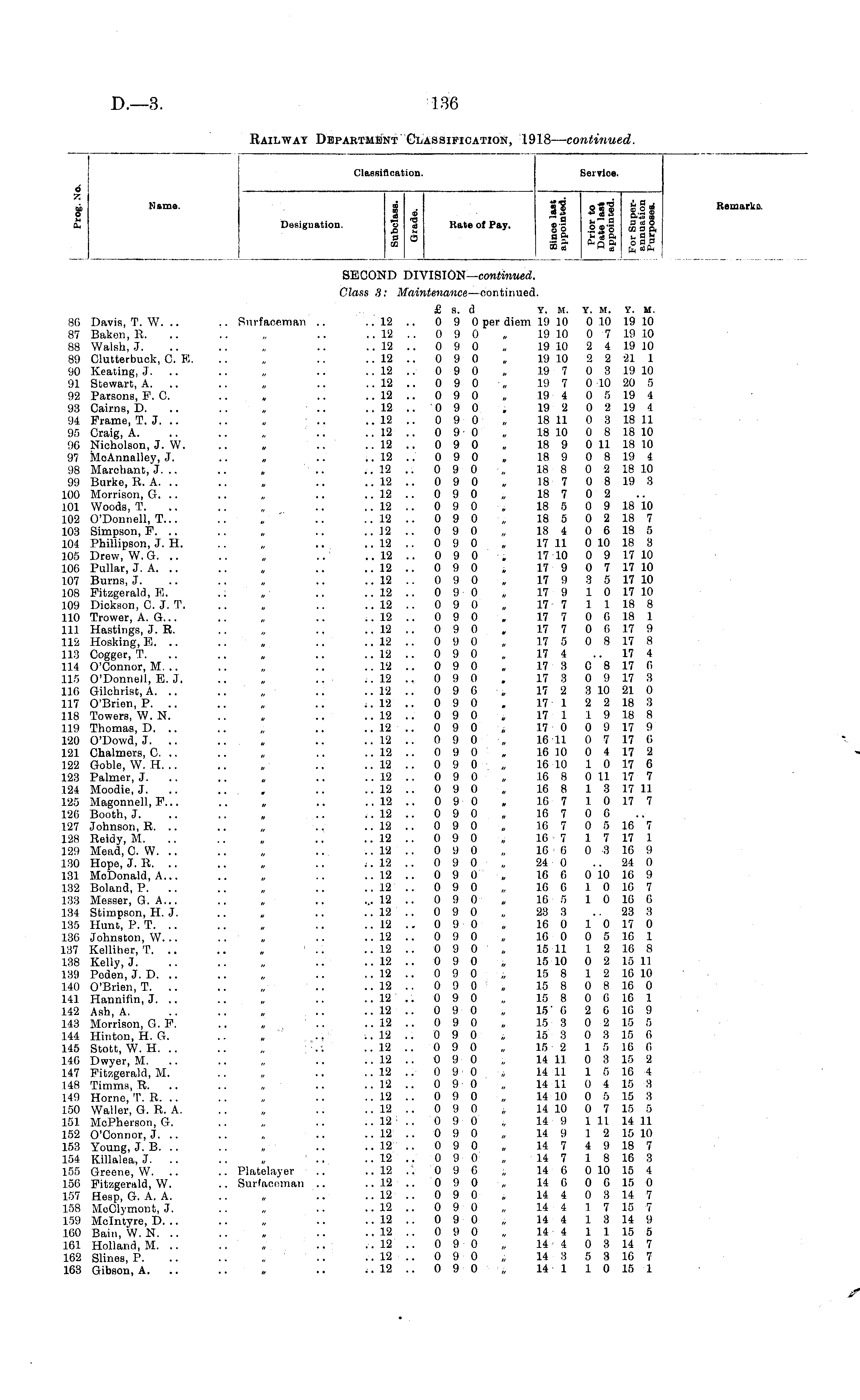 Claesiflcal -ton. Service. A Name, o fa a. d 35 u o M £ Name. DeKigiiatioi Designation. j * it £ co a in. 9 9 Rate of Pay. g-g s s oo. M 53 5" m 9 d 73 ss a to 32 S 5 9 S. — d fa fa" a So o«o a to >■ d a 55 5" •'OS >!, a ■ £t\ as as fa .2 3 d o .2 2 o cd 3 a fa d a fa a fa ton O, O a 3 H d tn °*to Remarks. ® tox a Rate of Pay. SECOND DIVISION—conMnwad. Class 3: Maintenance —continued. 86 Davis, T. W. .. 87 Baken, R. 88 Walsh, J. 89 Clutterbuck, C. E. 90 Keating, J. .. 91 Stewart, A. .. 92 Parsons, F. 0, 93 Cairns, D. 94 Frame, T. J. .. 95 Craig, A. 96 Nicholson, J. W. 97 MoAnnalley, J. 98 Marohant, J. .. 99 Burke, R. A. 100 Morrison, G. .. 101 Woods, T. 102 O'Donnell, T... 103 Simpson, F. .. 104 Phillipson, J. H. 105 Drew, W. G. 106 Pullar, J. A. 107 Burns, J. 108 Fitzgerald, E. 109 Dickson, 0. J. T. 110 Trower, A. G... 111 Hastings, J. R. 112 Hosking, E. .. 113 Cogger, T. 114 O'Connor, M. .. 115 O'Donnell, E. J. 116 Gilchrist, A. .. 117 O'Brien, P. .. 118 TowerB, W. N. 119 Thomas, D. .. 120 O'Dowd, J. .. 121 Chalmers, O. .. 122 Goble, W. H. .. 123 Palmer, J. 124 Moodie, J. 125 Magonnell, F... 126 Booth, J. 127 Johnson, R. .. 128 Reidy, M. 129 Mead, C. W. 130 Hope, J. R. .. 131 MoDona3d, A... 132 Boland, P. .. 133 Messer, G. A... 134 Stimpson, H. J. 135 Hunt, P. T. 136 Johnston, W. .. 137 Kelliher, T. .. 138 Kelly, J. 139 Peden, J. D. 140 O'Brien, T. .. 141 Hannifin, J. .. 142 Ash, A. 143 Morrison, G. F. 144 Hinton, H. G. 145 Stott, W. H. 146 Dwyer, M. 147 Fitzgerald, M. 348 Timms, R. 149 Home, T. R. .. 150 Waller, G. R. A. 151 McPherson, G. 152 O'Connor, J. .. 153 Young, J. B. 154 Killalea, J. .. 155 Greene, W. .. 156 Fitzgerald, W. 157 Hesp, G. A. A. 158 McOlymont, J. 159 Mclntyre, D. .. 160 Bain, W. N. .. 161 Holland, M. .. 162 Slines, P. 163 Gibson, A. .. .. Surfaceman .. .. Platelayer .. Surfaceman .. . • 0 •. £ s. d Y. M. .. 12 .. 0 9 0 per diem 19 10 .. 12 .. 0 9 0 „ 19 1.0 .. 12 .. 0 9 0 „ 19 10 .. 12 .. 0 9 0 „ 19 10 .. 12 .. 0 9 0 „ 19 7 .. 12 .. 0 9 0 „ 19 7 .. 12 .. 0 9 0 „ 19 4 .. 12 .. 0 9 0 . 19 2 .. 12 .. 0 9 0 „ 18 11 .. 12 .. 0 9 0 „ 18 10 .. 12 .. 0 9 0 „ 18 9 .. .32 .. 0 9 0 „ 18 9 .. 12 .. 0 9 0 i 18 8 .. 12 .. 0 9 0 „ 18 7 .. 12 .. 0 9 0 „ 18 7 .. 12 .. 0 9 0 „ 18 5 .. 12 .. 0 9 0 „ 18 5 .. 12 .. 0 9 0 „ 18 4 .. 12 .. 0 9 0 „ 17 11 .. 12 .. 0 9 0. 17 10 .. 12 .. 0 9 0 „ 17 9 .. 12 .. 0 9 0 „ 17 9 .. 12 .. 0 9 0 „ 17 9 .. 12 .. 0 9 0 „ 17 7 .. 12 .. 0 9 0 , 17 7 .. 12 .. 0 9 0 0 17 7 .. 12 .. 0 9 0 „ 17 5 .. 12 .. 0 9 0 „ 17 4 .. 12 .. 0 9 0 „ 17 3 .. 12 .. 0 9 0 „ 17 3 .. 12 .. 0 9 6 „ 17 2 .. 12 .. 0 9 0 , 17 1 .. 12 .. 0 9 0 , 17 1 .. 12 .. 0 9 0 0 17 0 .. 12 .. 0 9 0 „ 16 11 .. 12 .. 0 9 0, 16 10 .. 12 .. 0 9 0,, 16 1.0 .. 12 .. 0 9 0 „ 16 8 .. 12 .. 0 9 0 „ 16 8 .. 12 .. 0 9 0 , 16 7 .. 12 .. 0 9 0 „ 36 7 .. 12 .. 0 9 0 „ 10 7 .. 12 .. 0 9 (3 „ 16 7 .. 12 .. 0 9 0 „ 16 6 <. 12 ,. 0 9 0 „ 24 0 .. 12 .. 0 9 0 „ 16 6 .. 12 .. 0 9 0 „ 16 6 .. 12 .. 0 9 0 „ 16 5 .. 12 .. 0 9 0 „ 23 3 .. 12 .. 0 9 0 „ 16 0 .. 12"-.. 0 9 0 „ 16 0 .. 12 .. 0 9 0 0 15-11 .. 12 .. 0 9 0 „ 15 10 .. 12 .. 0 9 0 „ 15 8 .. 12 .. 0 9 0, 15 8 .. 12 .. 0 9 0 „ 15 8 .. 12 .. 0 9 0 „ 15' 6 ,. 12 .. 0 9 0 „ 15 3 .. 12 .. 0 9 0 „ 15 3 .. 12 .. 0 9 0 „ 15- 2 .. 12 .. 0 9 0 „ 14 11 .. 1.2 .:■ 0 9 0 ,i 14 11 .. 12 .. 0 9 0 „ 14 11 .. 12 .. 0 9 0 „ 14 10 .. 12 .. 0 9 0 „ 14 10 .. 12 ; .. 0 9 0 „ 14 9 .. 12 .. 0 9 0 „ 14 9 .. 12 .. 0 9 0 „ 14 7 .. 12 .. 0 9 0 „ 14 7 .. 12 .: 0 9 6 ;, 34 6 .. 12 .. 0 9 0 i 14 6 .. 12 .. 0 9 0 „ 14 4 .. 12 .. 0 9 0 „ 14 4 .. 12 .. 0 9 0 „ 14 4 .. 12 .. 0 9 0 „ 14 4 .. 12 .. 0 9 0 „ 14 4 .. 12 .. 0 9 0 „ 14 3 .. 12 .. 0 9 0 „ 14 1 Y. M. Y. M. 0 10 19 10 0 7 19 .1.0 2 4 19 10 2 2 21 1 0 8 19 10 0 10 20 5 0 5 19 4 0 2 19 4 0 3 18 1.1 0 8 18 10 0 11 18 10 0 8 19 4 0 2 18 10 0 8 19 3 0 2 0 9 18 10 0 2 18 7 0 6 18 5 0 10 18 3 0 9 17 10 0 7 17 10 3 5 17 10 1 0 17 10 1 1 18 8 0 6 18 1 0 6 17 9 0 8 17 8 17 4 0 8 17 6 0 9 17 3 3 10 21 0 2 2 18 3 1 9 18 8 0 9 17 9 0 7 17 0 0 4 17 2 1 0 17 6 0 11 17 7 1 8 17 11 1 0 17 7 0 6 0 5 16 7 1 7 17 1 0 3 16 9 .. 24 0 0 10 16 9 1 0 16 7 1 0 16 6 .. 23 3 1 0 17 0 0 5 16 1 1 2 16 8 0 2 15 11 1 2 16 10 0 8 16 0 0 6 16 1 2 6 16 9 0 2 15 5 0 8 15 0 1 5 16 6 0 8 15 2 1 5 16 4 0 4 15 8 0 5 15 8 0 7 15 5 1 11 14 11 1 2 15 10 4 9 18 7 1 8 16 3 0 10 15 4 0 6 15 0 0 3 14 7 1 7 15 7 1 3 14 9 1 1 15 5 0 3 14 7 5 3 16 7 1 0 15 1