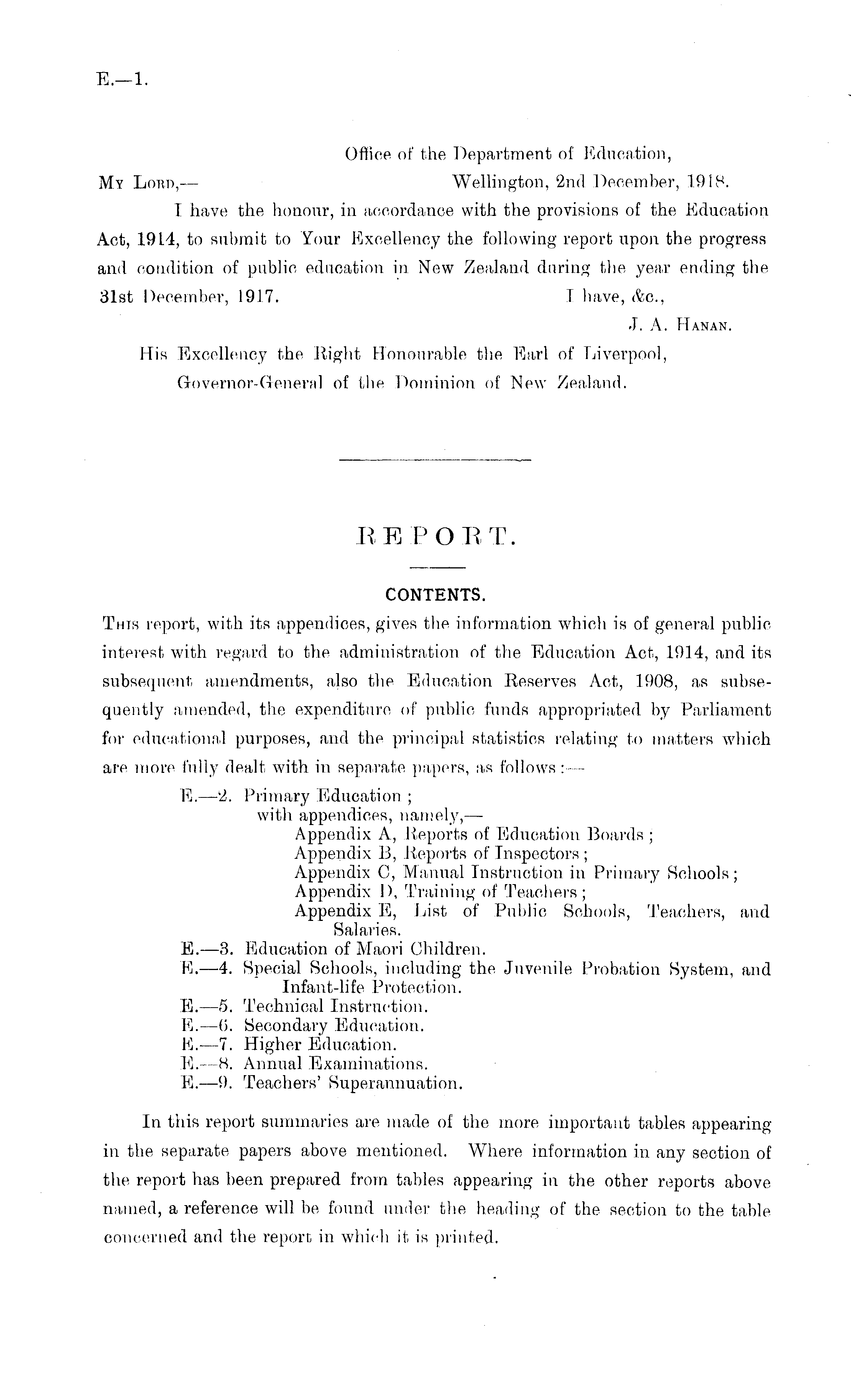 Office of the Department of Education, My Lord, — Wellington, 2nd December, 1918. I have the honour, in accordance with the provisions of the Education Act, 1914, to submit to Your Excellency the following report upon the progress and condition of public education in New Zealand during the year ending the 31st December, 1917. T have, &0., J. A. Hanan. His Excellency the Right Honourable the Earl of Liverpool, Governor-General of the Dominion of New Zealand.