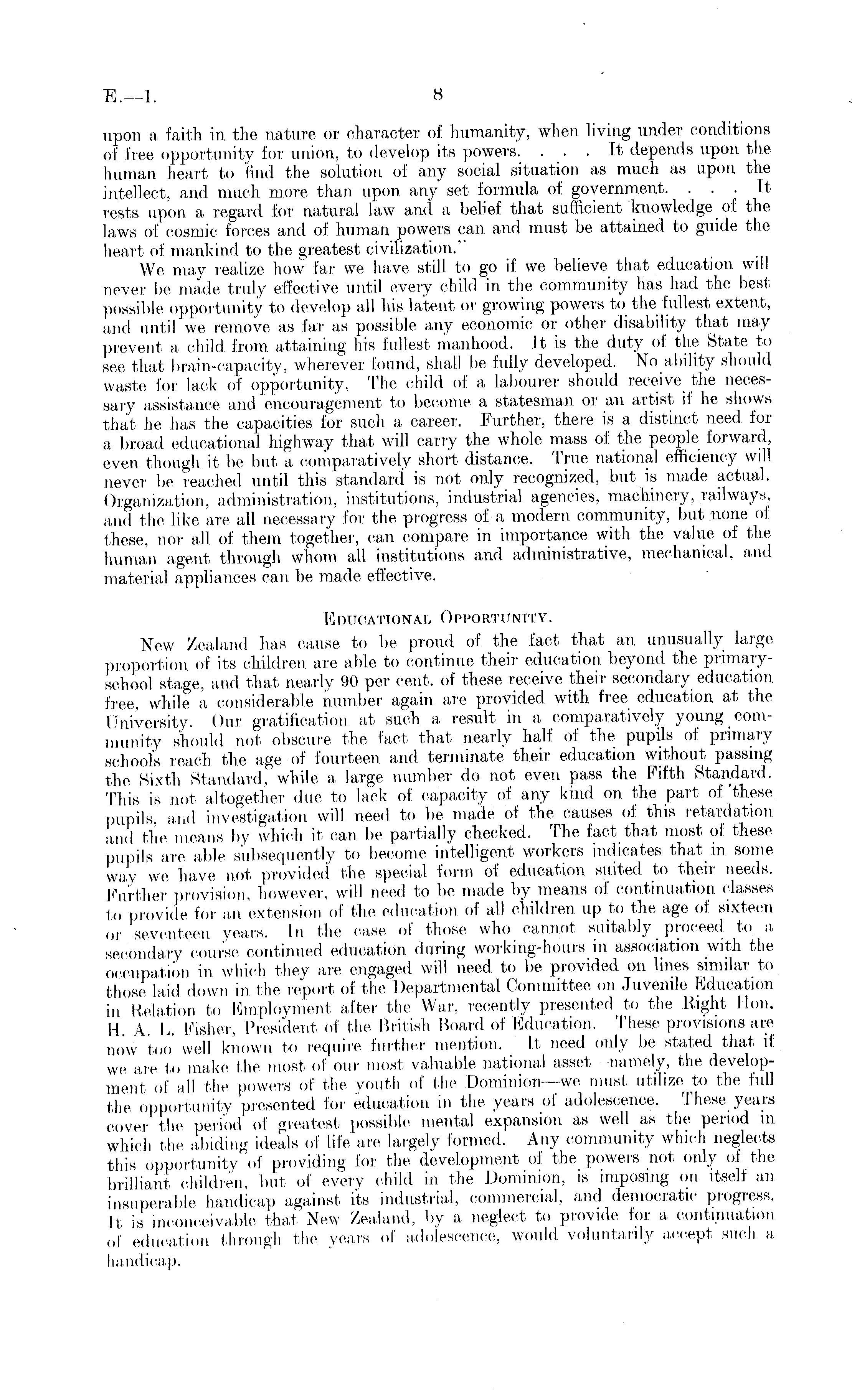 upon a faith in the nature or character of humanity, when living under conditions of free opportunity for union, to develop its powers. ... Ft depends upon the human heart to find the solution of any social situation as much as upon the intellect, and much more than upon any set formula of government. . . . It rests upon a regard for natural law and a belief that sufficient knowledge of the laws of cosmic forces and of human powers can and must be attained to guide the heart of mankind to the greatest civilization.'' We may realize how far we have still to go if we believe that education will never be made truly effective until every child in the community has had the best possible opportunity to develop all his latent or growing powers to the fullest extent, and until we remove as far as possible any economic or other disability that may prevent a, child from attaining his fullest manhood. It is the duty of the State to see that brain-capacity, wherever found, shall be fully developed. No ability should waste for lack of opportunity. The child of a, labourer should receive the necessary assistance and encouragement to become a statesman or an artist if he shows that he has the capacities for such a career. Further, there is a distinct need for a broad educational highway that will carry the whole mass of the people forward, even though it be but a comparatively short distance. True national efficiency will never be reached until this standard is not only recognized, but is made actual. Organization, administration, institutions, industrial agencies, machinery, railways, and the like are all necessary for the, progress of a modern community, but none ol these, nor all of them together, can compare in importance with the value of the human agent through whom all institutions and administrative, mechanical, and material appliances can be made effective. Educational Opportunity-. New Zealand has cause to be proud, of the fact that an. unusually large proportion, of its children are able to continue their education beyond the primaryschool stage, and that nearly 90 per cent, of these receive their secondary education free, while a considerable number again are provided with free education at the University. Our gratification at such a result in a, comparatively young community should not obscure the fact that nearly half of the pupils of primary schools reach the age of fourteen and terminate their education without passing the Sixth Standard, while a large number do not even pass the Fifth Standard. This is not altogether due to lack of capacity of any kind on the part of these. pupils and investigation will need to be made of the causes of this retardation and the means by which it can be partially checked. The fact that most of these pupils are able subsequently to become intelligent workers indicates that in some way we have not provided the special form of education suited to their needs. Further provision, however, will need to be made by means ol continuation classes to provide for an extension of the education of all children up to the age of sixteen or seventeen years. In the case of those, who cannot suitably proceed to a secondary course continued education during working-hours in association with the occupation in which they are engaged will need to be provided on lines similar lo those laid down in the report of the Departmental Committee on Juvenile Education in Relation to Employment after the War, recently presented to the Right Hon. H A L. Fisher. President of the British Hoard of Education. These provisions are now too well known to require further mention. It need only be stated that if we are to make the most of our most valuable national asset namely, the development of all the powers of the youth of the Dominion—we must utilize to the lull the opportunity presented for education in the years of adolescence. These years cover the period of greatest possible mental expansion as well as the period in which the abiding ideals of life are largely formed. Any community which neglects this opportunity of providing for the development of the powers not only of the brilliant children, but of every child in the Dominion, is imposing on itself an insuperable handicap against its industrial, commercial, and democratic progress. ||, is inconceivable that New Zealand, by a neglect to provide lor a continuation of education through the years of adolescence, would voluntarily accept such a handicap.