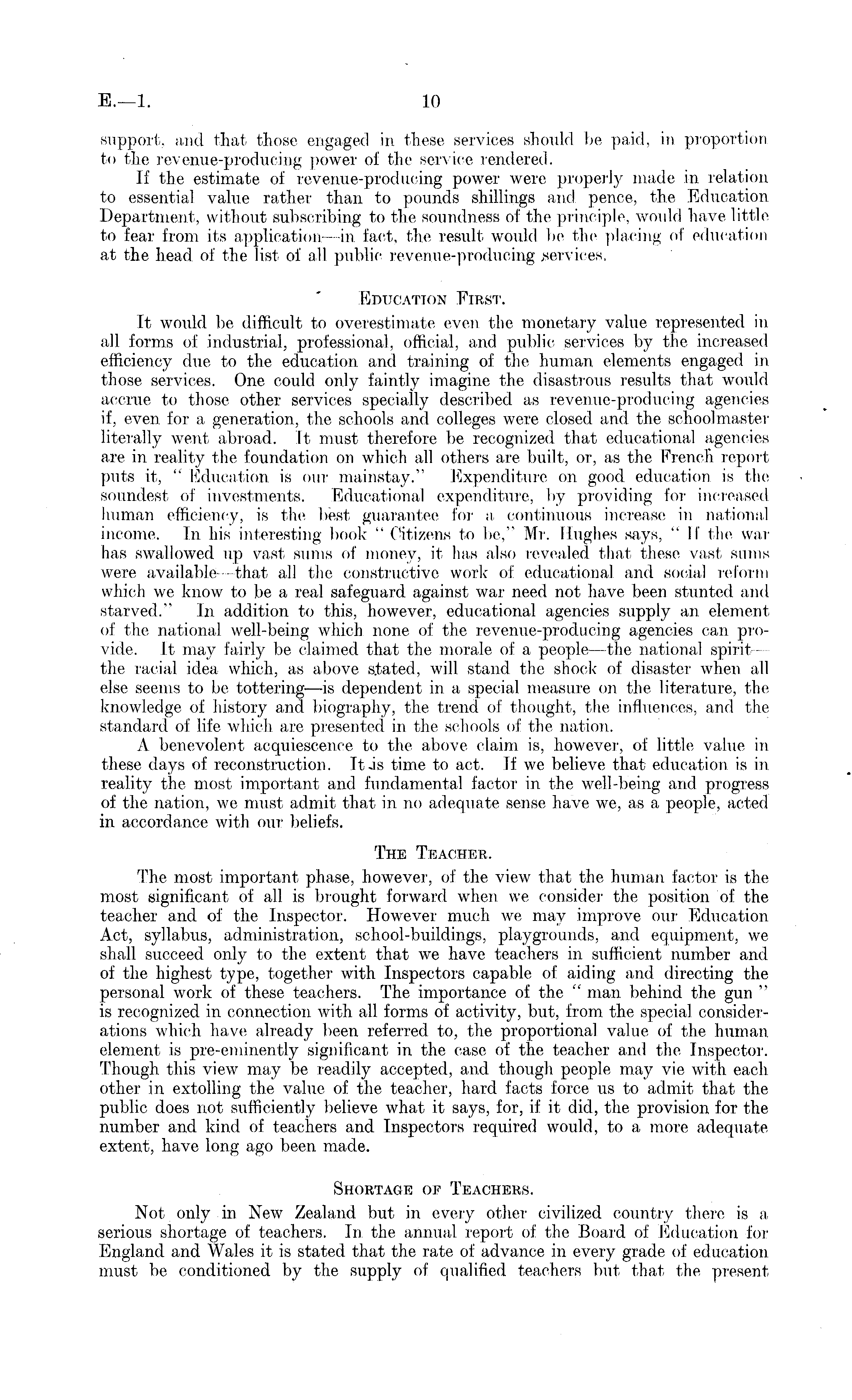 support, and that those, engaged in these services should be paid, in proportion to the revenue-producing power of the service rendered. If the estimate of revenue-producing power were properly made in relation to essential value rather than to pounds shillings and pence, the Education. Department, without subscribing to the soundness of the principle, would have little to fear from its application—in fact, the result would be the placing of education at the head of the list ol all public revenue-producing services. Education First. It would be difficult to overestimate even the monetary value represented in all forms of industrial, professional, official, and public services by the increased efficiency due to the education and training of the human elements engaged in those services. One could only faintly imagine the disastrous results that would accrue to those other services specially described as revenue-producing agencies if, even, for a generation, the schools and colleges were closed and the schoolmaster literally went abroad. It must therefore be recognized that educational agencies are in reality the foundation on which all others are built, or, as the French report puts it, " Education is our mainstay." Expenditure on good education is the soundest of investments. Educational expenditure, by providing for increased human efficiency, is the best guarantee for a continuous increase in national income. In his interesting book " Citizens to lie," Mr. Hughes says, "If the war has swallowed up vast sums of money, it has also revealed that these vast sums were available---that all the constructive work of educational, and social reform which we know to be a real safeguard against war need not have been stunted and starved." In addition to this, however, educational agencies supply an element of the national well-being which none of the revenue-producing agencies can provide. It may fairly be claimed that the morale of a people—the national spirit the racial idea which, as above stated, will stand the shock of disaster when all else seems to be tottering—is dependent in a special measure on the literature, the knowledge of history and biography, the trend of thought, the influences, and the standard of life which are presented in the schools of the nation. A benevolent acquiescence to the above claim is, however, of little value in these days of reconstruction. It Js time to act. If we believe that education is in reality the most important and fundamental factor in the well-being and progress of the nation, we must admit that in no adequate sense have we, as a people, acted in accordance with our beliefs. The Teacher. The most important phase, however, of the view that the human factor is the most significant of all is brought forward when we consider the position of the teacher and of the Inspector. However much Ave may improve our Education Act, syllabus, administration, school-buildings, playgrounds, and equipment, we. shall succeed only to the extent that we have teachers in sufficient number and of the highest type, together with Inspectors capable of aiding and directing the personal work of these teachers. The importance of the " man behind the gun " is recognized in connection with all forms of activity, but, from the special considerations which have already been referred to, the proportional value of the human, element is pre-eminently significant in the case of the teacher and the Inspector. Though this view may be readily accepted, and though people may vie with each other in extolling the value of the teacher, hard facts force us to admit that the public does not sufficiently believe what it says, for, if it did, the provision for the number and kind of teachers and Inspectors required would, to a more adequate extent, have long ago been made. Shortage of Teachers. Not only in New Zealand but in every other civilized country there, is a, serious shortage of teachers. In the annual report of the Board of Education for England and Wales it is stated that the rate of advance in every grade of education must be conditioned by the supply of qualified teachers but that the present