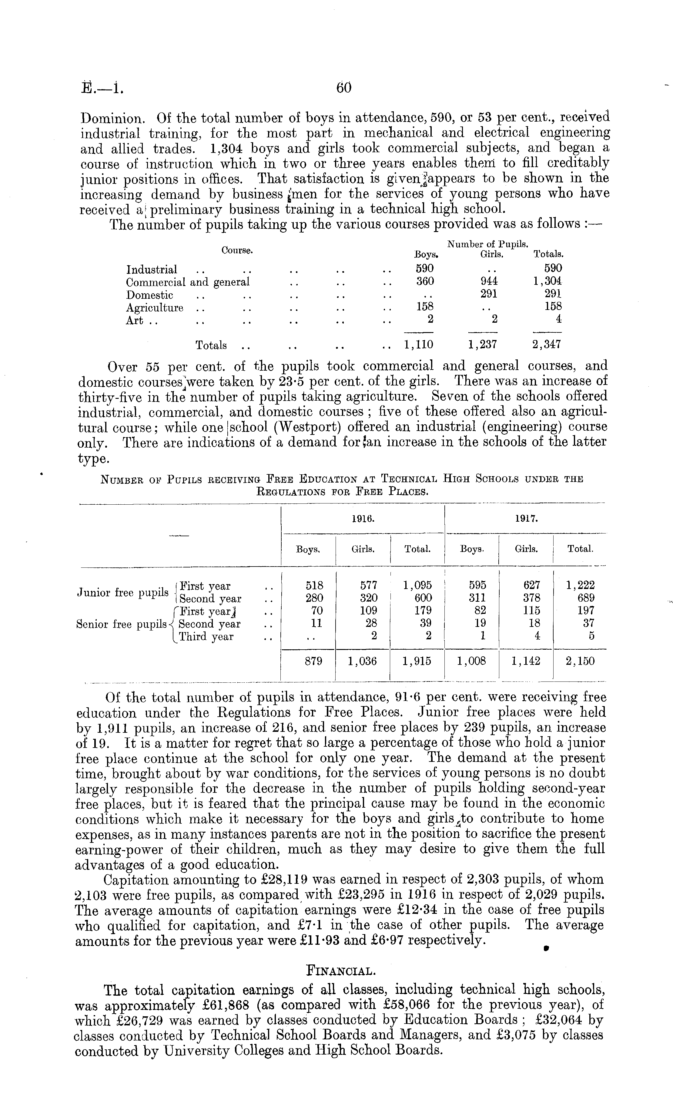 Of the total number of pupils in attendance, 91-6 per cent, were receiving free education under the Regulations for Free Places. Junior free places were held by 1,911 pupils, an increase of 216, and senior free places by 239 pupils, an increase of 19. It is a matter for regret that so large a percentage of those who hold a junior free place continue at the school for only one year. The demand at the present time, brought about by war conditions, for the services of young persons is no doubt largely responsible for the decrease in the number of pupils holding second-year free places, but it is feared that the principal cause may be found in the economic conditions which make it necessary for the boys and girls s to contribute to home expenses, as in many instances parents are not in the position to sacrifice the present earning-power of their children, much as they may desire to give them the full advantages of a good education. Capitation amounting to £28,119 was earned in respect of 2,303 pupils, of whom 2,103 were free pupils, as compared with £23,295 in 1916 in respect of 2,029 pupils. The average amounts of capitation earnings were £12-34 in the case of free pupils who qualified for capitation, and £7-1 in the case of other pupils. The average amounts for the previous year were £1T93 and £6*97 respectively. Financial. The total capitation earnings of all classes, including technical high schools, was approximately £61,868 (as compared with £58,066 for the previous year), of which £26,729 was earned by classes conducted by Education Boards ; £32,064 by classes conducted by Technical School Boards and Managers, and £3,075 by classes conducted by University Colleges and High School Boards.