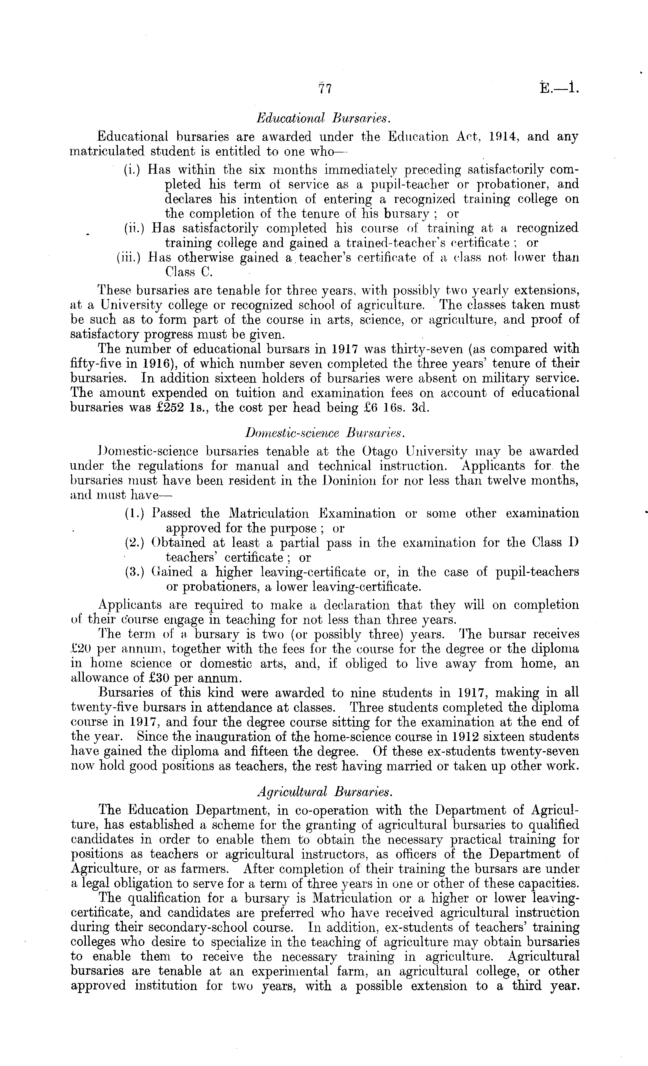 Educational Bursaries. Educational bursaries are awarded under the Education Act, 1914, and any matriculated student is entitled to one who — (i.) Has within the six months immediately preceding satisfactorily completed his term of service as a pupil-teacher or probationer, and declares his intention of entering a recognized training college on the completion of the tenure of his bursary ; or (ii.) Has satisfactorily completed his course of training at a recognized training college and gained a trained-teacher's certificate ; or (iii.) Has otherwise gained a teacher's certificate of a class not lower than Class C. These, bursaries are tenable for three years, with possibly two yearly extensions, at a University college or recognized school of agriculture. The classes taken must be such as to form part of the course in arts, se;ience, or agriculture, and proof of satisfactory progress must be given. The number of educational bursars in 1917 was thirty-seven (as compared with fifty-five in 1916), of which number seven completed the three years' tenure of their bursaries. In addition sixteen holders of bursaries were absent on military service. The amount expended on tuition and examination fees on account of educational bursaries was £252 Is., the cost per head being £6 16s. 3d. Domestic-science Bursaries. Domestic-science bursaries tenable at the Otago University may be awarded under the regulations for manual and technical instruction. Applicants for the bursaries must have been resident in the Doninion for nor less than twelve months, and must have— (1.) Passed the Matriculation Examination or some other examination approved for the purpose ; or (2.) Obtained at least a partial pass in the examination for the Class I) teachers' certificate ; or (3.) Gained a higher leaving-certificate or, in the case of pupil-teachers or probationers, a lower leaving-certificate. Applicants are required to make a eleclaration that they will on completion of their c'ourse engage in teaching for not less than three years. The term of a, bursary is two (or possibly three) years. The bursar receives £20 per annum, together with the fees for the course for the degree or the diploma in home science or domestic arts, and, if obliged to live away from home, an allowance of £30 per annum. Bursaries of this kind were awarded to nine students in 1917, making in all twenty-five bursars in attendance at classes. Three students completed the diploma course in 1917, anel four the degree course sitting for the examination at the end of the year. Since the inauguration of the home-science course in 1912 sixteen students have gained the diploma and fifteen the degree. Of these ex-students twenty-seven now hold good positions as teachers, the rest having married or taken up other work. Agricultural Bursaries. The Education Department, in co-operation with the Department of Agriculture, has established a scheme for the granting of agricultural bursaries to qualifieel candidates in order to enable them to obtain the necessary practical training for positions as teachers or agricultural instructors, as officers of the Department of Agriculture, or as farmers. After completion of their training the bursars are under a iegal obligation to serve for a term of three years in one or other of these capacities. The qualification for a bursary is Matriculation or a higher or lower leavingcertificate, and candidates are preferred who have received agricultural instruction during their secondary-school course. In addition, ex-students of teachers' training colleges who desire to specialize in the teaching of agriculture may obtain bursaries to enable them to receive the necessary training in agriculture. Agricultural bursaries are tenable at an experimental farm, an agricultural college, or other approved institution for two years, with a possible extension to a third year.