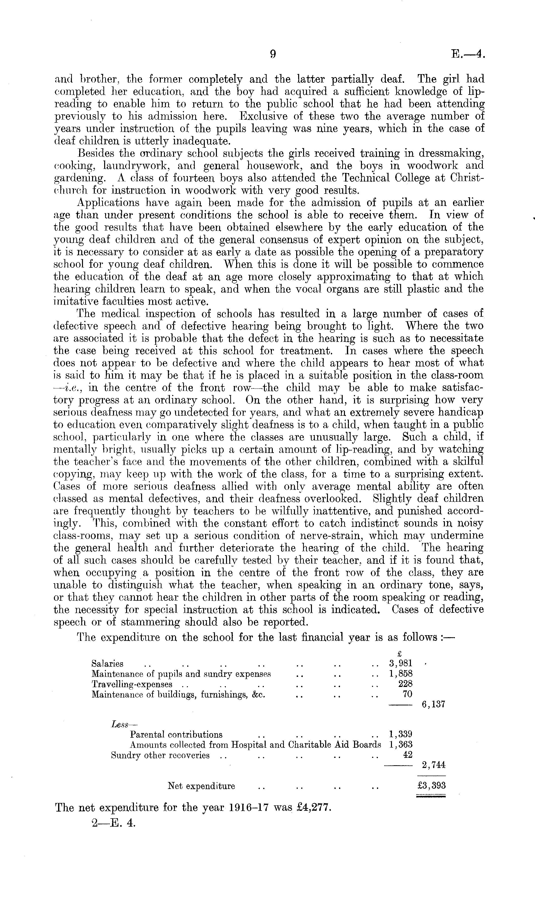 and brother, the former completely and the latter partially deaf. The girl had completed her education, and the boy had acquired a sufficient knowledge of lipreading to enable him to return to the public school that he had been attending previously to his admission here. Exclusive of these two the average number of years under instruction of the pupils leaving was nine years, which in the case of deaf children is utterly inadequate. Besides the ordinary school, subjects the girls received training in dressmaking, cooking, laundrywork, and general housework, and the boys in woodwork and gardening. A class of fourteen boys also attended the Technical College at Christchurch for instruction in woodwork with very good results. Applications have again been made for the admission of pupils at an earlier age than under present conditions the school is able to receive them. In view of the good results that have been obtained elsewhere by the early education of the young deaf children and of the general consensus of expert opinion on the subject, it is necessary to consider at as early a date as possible the opening of a preparatory school for young deaf children. When this is done it will be possible to commence the education of the deaf at an age more closely approximating to that at which hearing children learn to speak, and when the vocal organs are still plastic and the imitative faculties most active. The medical inspection of schools has resulted in a large number of cases of defective speech and of defective hearing being brought to light. Where the two are associated it is probable that the defect in the hearing is such as to necessitate the case being received at this school for treatment. In cases where the speech does not appear to be defective and where the child appears to hear most of what is said to him it may be that if he is placed in a suitable position in the class-room — i.e., in the centre of the front row—the child may be able to make satisfactory progress at an ordinary school. On the other hand, it is surprising how very serious deafness may go undetected for years, and what an extremely severe handicap to education even comparatively slight deafness is to a child, when taught in a public school, particularly in one where the classes are unusually large. Such a child, if mentally bright, usually picks up a certain amount of lip-reading, and by watching the teacher's face and the movements of the other children, combined with a skilful, copying, may keep up with the work of the class, for a time to a surprising extent. of more serious deafness allied with only average mental ability are often classed as mental defectives, and their deafness overlooked. Slightly deaf children are frequently thought by teachers to be wilfully inattentive, and punished accordingly. This, combined with the constant effort to catch indistinct sounds in noisy class-rooms, may set up a serious condition of nerve-strain, which may undermine the general health and further deteriorate the hearing of the child. The hearing of all such cases should be carefully tested by their teacher, and if it is found that, when occupying a position in the centre of the front row of the class, they are unable to distinguish what the teacher, when speaking in an ordinary tone, says, or that they cannot hear the children in other parts of the room speaking or reading, the necessity for special instruction at this school is indicated. Cases of defective speech or of stammering should also be reported. The expenditure on the school for the last financial year is as follows : — £ Salaries .. .. .. .. .. .. .. 3,981 Maintenance of pupils and sundry expenses .. .. .. 1,858 Travelling-expenses .. .. .. .. .. .. 228 Maintenance of buildings, furnishings, &c. .. .. .. 70 6,137 Less — Parental contributions .. .. .. 1,339 Amounts collected from Hospital and Charitable Aid Boards 1,363 Sundry other recoveries .. .. .. .. .. 42 2,744 Net expenditure .. .. .. .. £3,393 The net expenditure for the year 1916-17 was £4,277.