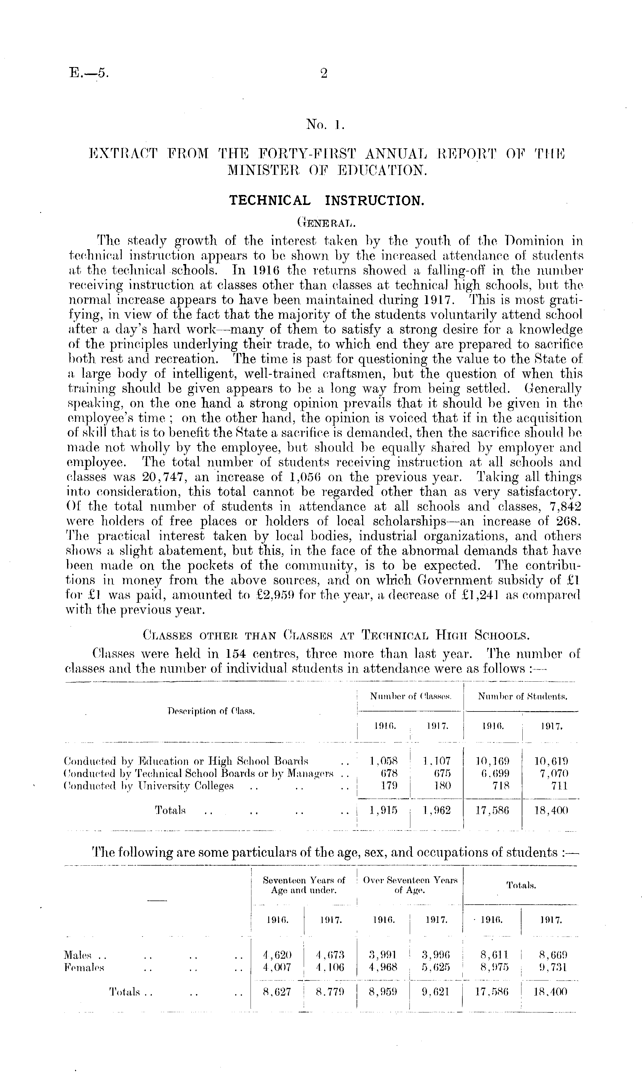No. 1. EXTRACT FROM THE FORTY-FIRST ANNUAL REPORT OF THE MINISTER OF EDUCATION. TECHNICAL INSTRUCTION. General. The steady growth of the interest taken by the youth of the Dominion in technical instruction appears to be shown, by the increased attendance of students at the technical schools. In 1916 the returns showed a falling-off in. the number receiving instruction, at classes other than, classes at technical high schools, but the normal increase appears to have been maintained during 1917. This is most gratifying, in view of the fact that the majority of the students voluntarily attend school after a day's hard work—many of them to satisfy a strong desire for a knowledge of the principles underlying their trade, to which end they are prepared to sacrifice both rest and recreation. The time is past for questioning the value to the State of a- large body of intelligent, well-trained craftsmen, but the question of when this training should be given, appears to be a, long way from being settled. Generally speaking, on the one hand a strong opinion prevails that it should be given in the employee's time ; on the other hand, the opinion, is voiced that if in the acquisition of skill that is to benefit the State a sacrifice is demanded, then the sacrifice should be made not wholly by the employee, but should be equally shared by employer and employee. The total number of students receiving instruction at all schools and classes was 20,747, an increase of 1,056 on the previous year. Taking all things into consideration, this total cannot be regarded other than as very satisfactory. Of the total number of students in. attendance at all schools and classes, 7,842 were holders of free places or holders of local scholarships —an increase of 268. The practical interest taken by local bodies, industrial organizations, and others shows a slight abatement, but this, in the face of the abnormal demands that have been made on the pockets of the community, is to be expected. The contributions in. money from the above sources, and on which Government subsidy of £l for £l was paid, amounted to £2,959 for the year, a, decrease of £1,241 as compared with the previous year. Classes other than Classes at Technical High Schools. Classes were held in 154 centres, three more than last year. The number of classes and the number of individual students in attendance were as follows :—