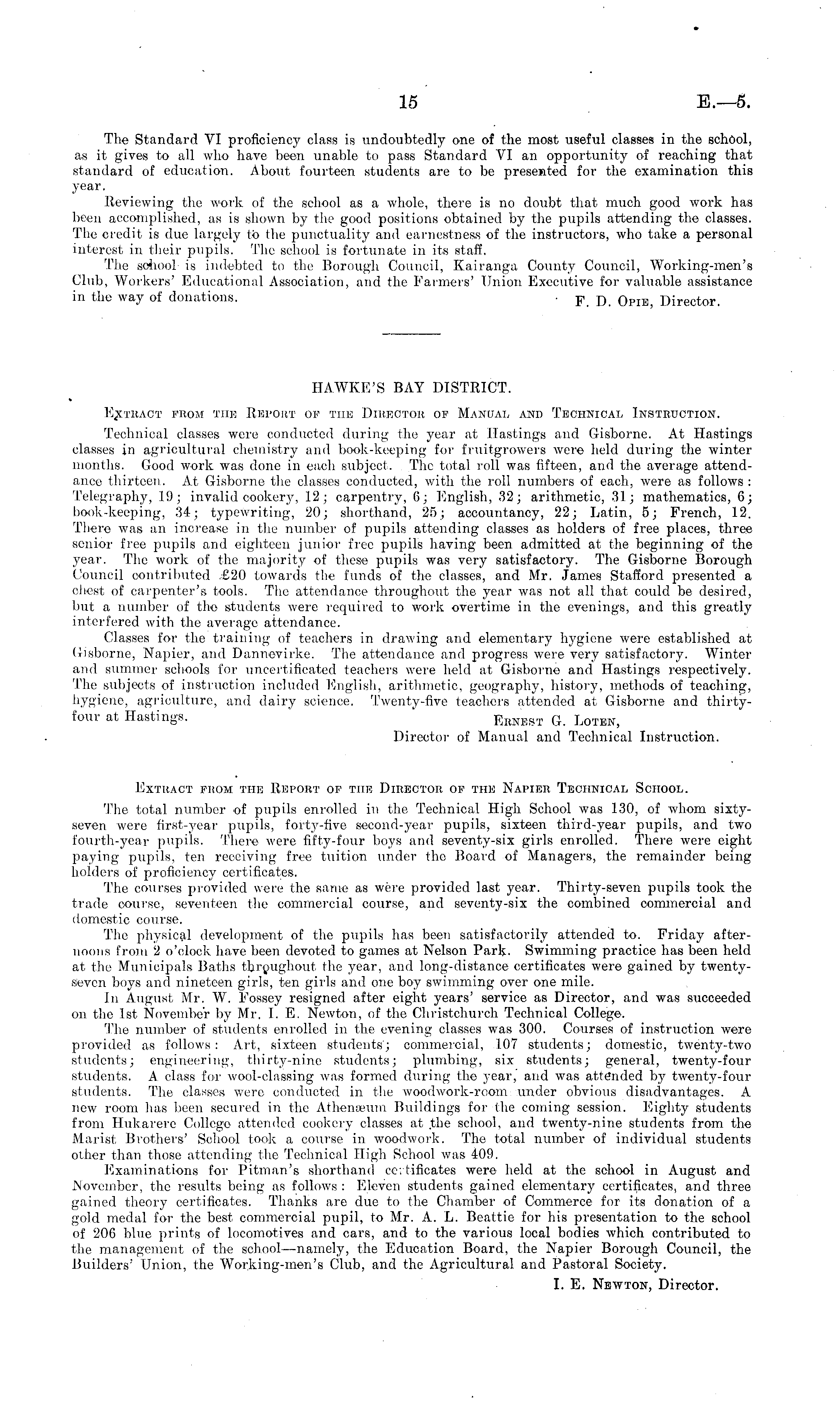 The Standard VI proficiency class is undoubtedly one of the most useful classes in the school, as it gives to all who have been unable to pass Standard VI an opportunity of reaching that standard of education. About fourteen students are to be presented for the examination this year. Reviewing the work of the school as a whole, there is no doubt that much good work has been accomplished, as is shown by the good positions obtained by the pupils attending the classes. The credit is due largely to the punctuality ami earnestness of the instructors, who take a personal interest in their pupils. The school is fortunate in its staff. The school- is indebted to the Borough Council, Kairanga County Council, Working-men's Club, Workers' Educational Association, ami the Farmers' Union Executive for valuable assistance in the way of donations. ■ p jj Opie Director HAWKE'S BAY DISTRICT. Kxtract prom the Report op the Diueotor of Manual and Technical Instruction. Technical classes were conducted during the year at Hastings and Gisborne. At Hastings classes jn agricultural chemistry and book-keeping for fruitgrowers were held during the winter months. Good work was done in each subject. The total roll was fifteen, and the average attendance thirteen. At Gisborne the classes conducted, with the roll numbers of each, were as follows: Telegraphy, 19; invalid cookery, 12; carpentry, 6; English, 32; arithmetic, 31; mathematics, 6; book-keeping, 34; typewriting, 20; shorthand, 25; accountancy, 22; Latin, 5; French, 12. There was an increase in the number of pupils attending classes as holders of free places, three senior free pupils and eighteen junior free pupils having been admitted at the beginning of the year. The work of the majority of these pupils was very satisfactory. The Gisborne Borough Council contributed £20 towards the funds of the classes, and Mr. James Stafford presented a chest of carpenter's tools. The attendance throughout the year was not all that could be desired, but a number of the students were required to work overtime in the evenings, and this greatly interfered with, the average attendance. Classes for the training of teachers in drawing and elementary hygiene were established at Gisborne, Napier, and Dannovirke. The attendance and progress were very satisfactory. Winter and summer schools for uncertificated teachers were held at Gisborne and Hastings respectively. The subjects of instruction included English, arithmetic, geography, history, methods of teaching, hygiene, agriculture, and dairy science. Twenty-five teachers attended at Gisborne and thirtyfour at Hastings. Ernest G. Loten, Director of Manual and Technical Instruction. Extract prom the Report op the Director of the Napier Technical School. The total number of pupils enrolled in the Technical High School was 130, of whom sixtyseven were first-year pupils, forty-five second-year pupils, sixteen third-year pupils, and two fourth-year pupils. There were fifty-four boys ami seventy-six girls enrolled. There were eight paying pupils, ten receiving free tuition under the Board of Managers, the remainder being holders of proficiency certificates. The courses provided were the same as were provided last year. Thirty-seven pupils took the trade course, seventeen the commercial course, and seventy-six the combined commercial and domestic course. The physical development of the pupils has been satisfactorily attended to. Friday afternoons from 2 o'clock have been devoted to games at Nelson Park. Swimming practice has been held at the Municipals Baths throughout the year, and long-distance certificates were gained by twentyseven boys and nineteen girls, ten girls and one boy swimming over one mile. In August; Mr. W. Fossey resigned after eight years' service as Director, and was succeeded on the Ist November by Mr. I. E. Newton, of the Christchurch Technical College. The number of students enrolled in the evening classes was 300. Courses of instruction were provided as follows: Art, sixteen students; commercial, 107 students; domestic, twenty-two students; engineering, thirty-nine students; plumbing, six students; general, twenty-four students. A class for wool-classing was formed during the year, and was attended by twenty-four students. The classes were conducted in the woodwork-room under obvious disadvantages. A new room has been secured in the Athemeuni Buildings for the coming session. Eighty students from Hukarere College attended cookery classes at the school, and twenty-nine students from the Marist Brothers' School took a course in woodwork. The total number of individual students other than those attending the Technical High School was 409. Examinations for Pitman's shorthand certificates were held at the school in August and November, the results being as follows : Eleven students gained elementary certificates, and three gained theory certificates. Thanks are due to the Chamber of Commerce for its donation of a gold medal for the best commercial pupil, to Mr. A. L. Beattie for his presentation to the school of 206 blue prints of locomotives and cars, and to the various local bodies which contributed to the management of the school —namely, the Education Board, the Napier Borough Council, the Builders' Union, the Working-men's Club, and the Agricultural and Pastoral Society. I. E. Newton, Director.