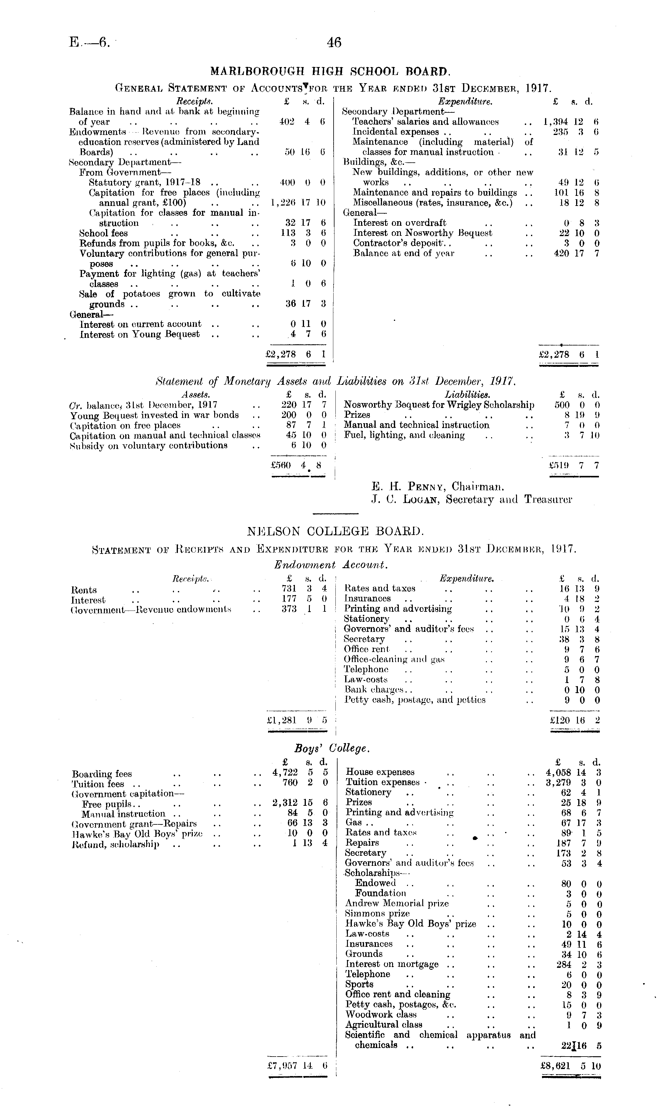 MARLBOROUGH HIGH SCHOOL BOARD. General Statement of the Year ended 31st December, 1917. Receipts. £ s. d. Expenditure. £ s. d. Balance in hand and at bank at beginning Seoondary Department— of year .. .. .. .. 402 4 0 Teachers'salaries and allowances .. 1,394 12 6 Endowments Revenue from secondary- Incidental expenses .. .. .. 235 31 6 education reserves (administered by Land Maintenance (including material) of Boards) .. .. ~ .. 50 Ui 0 classes for manual instruction .. 31 12 5 Secondary Department— Buildings, &o. — From Government — New buildings, additions, or other new Statutory grant, 1917-18 .. .. 400 0 0 works .. .. .. .. 49 12 6 Capitation for free places (including Maintenance and repairs to buildings .. 101 16 8 annual grant, £100) .. .. 1,226 17 10 Miscellaneous (rates, insurance, &c.) .. 18 12 8 Capitation for classes for manual in- General— struction ... .. .. 32 17 6 Interest on overdraft .. .. 083 School fees .. .. .. 113 3 6 Interest on Nosworthy Bequest .. 22 10 0 Refunds from pupils for books, &c. .. 3 0 0 Contractor's deposit.. .. .. 3 0 0 Voluntary contributions for general pur- Balance at end of year .. .. 420 17 7 poses .. .. .. .. 610 0 Payment for lighting (gas) at teachers' classes .. .. .. .. 10 6 Sale of potatoes grown to cultivate grounds .. .. .. .. 36 17 3 General — Interest on current account .. .. 0 11 0 Interest on Young Bequest .. .. 4 7 6 . § £2,278 6 I £2,278 6 1 Statement, of Monetary Assets and Liabilities on 31st December, 1917. Assets. £ s. d. | Liabilities. £ s. d. Cr. balance, 31st December, 1917 .. 220 17 7 j Nosworthy Bequest for Wrigley Scholarship 500 0 0 Young Bequest invested in war bonds .. 200 0 0 Prizes .. .. .. .. 819 9 Capitation on free places . . .. 87 7 I Manual and technical instruction .. 7 0 0 Capitation on manual and technical classes 45 10 0 Fuel, lighting, and cleaning .. .. 3 710 Subsidy on voluntary contributions .. 610 0 £560 4 # 8 £519 7 7 E. H. Penny, Chairman. J. 0. Logan, Secretary and Treasurer NELSON COLLEGE BOARD. Statement of Receipts and Expenditure for the Year hndh:d 31st December, 19T7. Endowment Account. Receipt;: £ s. d. Expenditure. £ s. cl. Rents .. .. .. ■• 731 3 4 Kates and taxes .. .. .. 16 13 9 Interest .. .. .. ■• 177 5 0 Insurances .. .. .. .. 4182 Government —Revenue endowments .. 373 1 I Printing and advertising .. .. 10 9 2 Stationery .. .. . . .. 0 6 4 Governors' and auditor's fees . . .. 15 13 4 Secretary .. .. .. .. 38 3 8 Office rent .. .. . . .. 9 7 6 Office-cleaning and gas . . . . 9 6 7 Telephone . . . . .. . . 5 0 0 Law-costs .. . . . . .. 17 8 Bank charges. . ~ . . .. 0 10 0 Petty cash, postage, and potties .. 9 0 0 £1,281 9 5 j £120 16 2 j —_—. Boys' College. £ s. d. £ s. d. Boarding foes .. .. .. 4,722 5 5 House expenses ~ .. .. 4,058 14 3 Tuition fees .. .. .. ■• 760 2 0 Tuition expenses • .. .. . . 3,279 3 0 Government capitation— Stationery .. ' .. . . . . 62 4 I Free pupils.. .. .. .. 2,312 15 6 Prizes .. .. .. .. 25 18 9 Muniial instruction .. .. .. 84 5 0 Printing and advertising .. .. 68 6 7 Government grant—Repairs .. .. 66 13 3 Gas.. .. .. .. .. 07 17 3 Hawke's Bay Old Boys'prize .. ... 10 0 0 Rates and taxes .. m•• ' ■■ 89 I 5 Refund, scholarship .. .. .. 113 4 Repairs . . . . .. ~ 187 7 9 Secretary .. .. .. .. 173 2 8 Governors' and auditor's fees . . .. 53 3 4 Scholarships Endowed .. .. .. .. 80 0 0 Foundation . . .. .. 3 0 0 Andrew Memorial prize . . .. 5 0 0 Simmons prize .. .. .. 5 0 0 Hawke's Bay Old Boys' prize .. .. 10 0 0 Law-costs .. . . ~ ~ 2 14 4 Insurances .. .. .. .. 49 11 6 Grounds .. .. ~ .. 34 10 6 Interest on mortgage .. .. .. 284 2 3 Telephone .. .. .. .. 6 0 0 Sports .. .. .. .. 20 0 0 Office rent and cleaning .. .. 8 3 9 Petty cash, postages, &c. .. .. 15 0 0 Woodwork class .. .. .. 9 7 3 Agricultural class .. .. .. 10 9 Scientific and chemical apparatus and chemicals .. .. .. .. 22J16 5 £7,957 14 6 £8,621 5 10