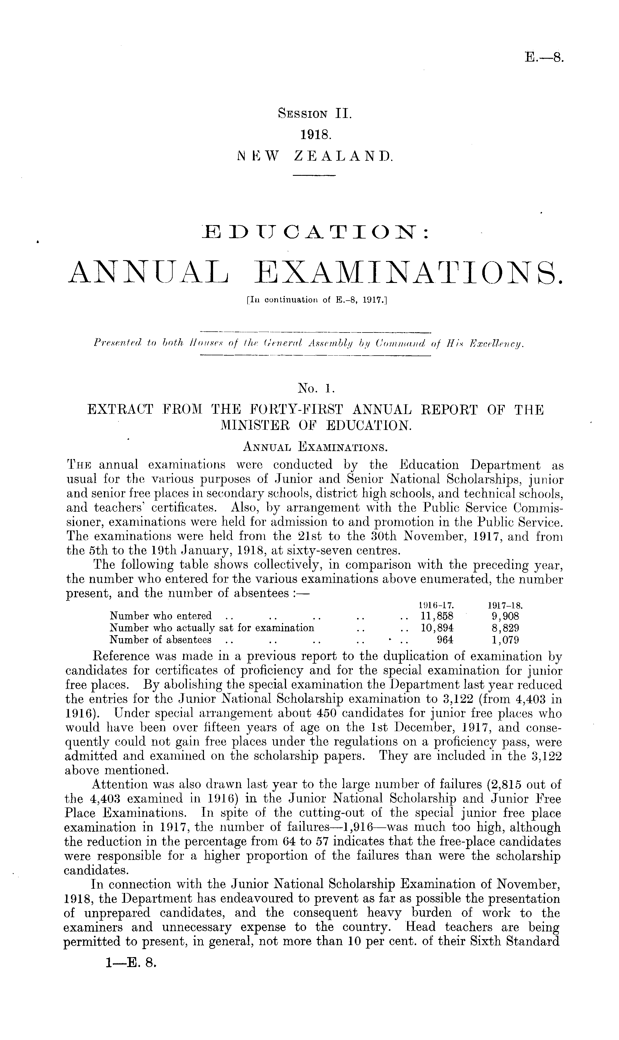 No. 1. EXTRACT FROM THE FORTY-FIRST ANNUAL REPORT OF THE MINISTER OF EDUCATION. Annual Examinations. The annual examinations were conducted by the Education Department as usual for the various purposes of Junior and Senior National Scholarships, junior and senior free places in secondary schools, district high schools, and technical schools, and teachers' certificates. Also, by arrangement with the Public Service Commissioner, examinations were held for admission to and promotion in the Public Service. The examinations were held from the 21st to the 30th November, 1917, and from the sth to the 19th January, 1918, at sixty-seven centres. The following table shows collectively, in comparison with the preceding year, the number who entered for the various examinations above enumerated, the number present, and the number of absentees :— 1916-17. 1917-18. Number who entered .. .. .. .. ..11,858 9,908 Number who actually sat for examination .. .. 10,894 8,829 Number of absentees .. .. .. .. • .. 964 1,079 Reference was made in a previous report to the duplication of examination by candidates for certificates of proficiency and for the special examination for junior free places. By abolishing the special examination the Department last year reduced the entries for the Junior National Scholarship examination to 3,122 (from 4,403 in 1916). Under special arrangement about 450 candidates for junior free places who would have been over fifteen years of age on the Ist December, 1917, and consequently could not gain free places under the regulations on a proficiency pass, were admitted and examined on the scholarship papers. They are included in the 3,122 above mentioned. Attention was also drawn last year to the large number of failures (2,815 out of the 4,403 examined in 1916) in the Junior National Scholarship and Junior Free Place Examinations. In spite of the cutting-out of the special junior free place examination in 1917, the number of failures—l,9l6 —was much too high, although the reduction in the percentage from 64 to 57 indicates that the free-place candidates were responsible for a higher proportion of the failures than were the scholarship candidates. In connection with the Junior National Scholarship Examination of November, 1918, the Department has endeavoured to prevent as far as possible the presentation of unprepared candidates, and the consequent heavy burden of work to the examiners and unnecessary expense to the country. Head teachers are being permitted to present, in general, not more than 10 per cent, of their Sixth Standard