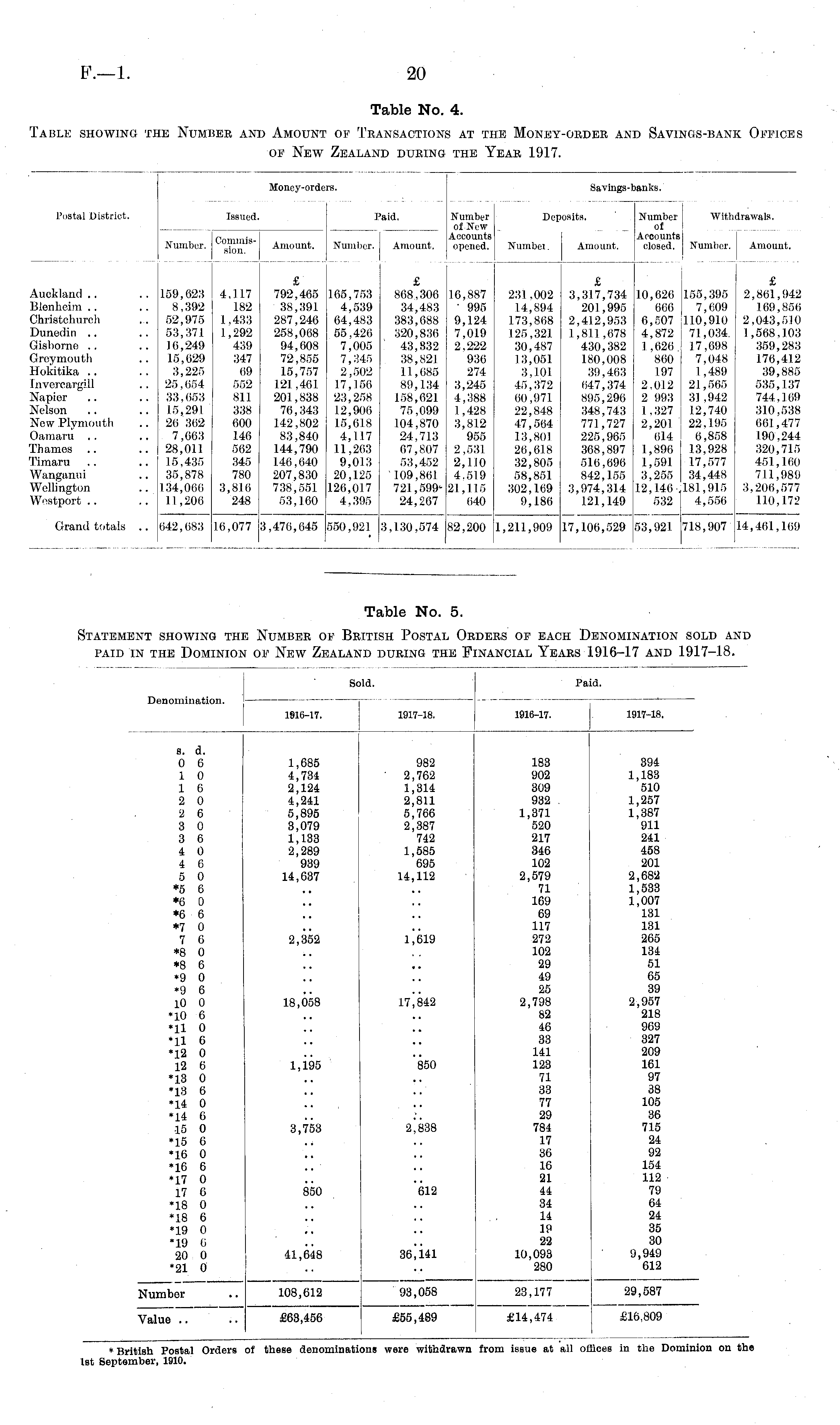 Table No. 4. Table showing the Number and Amount of Transactions at the Money-order and Savings-bank Offices of New Zealand during the Year 1917.