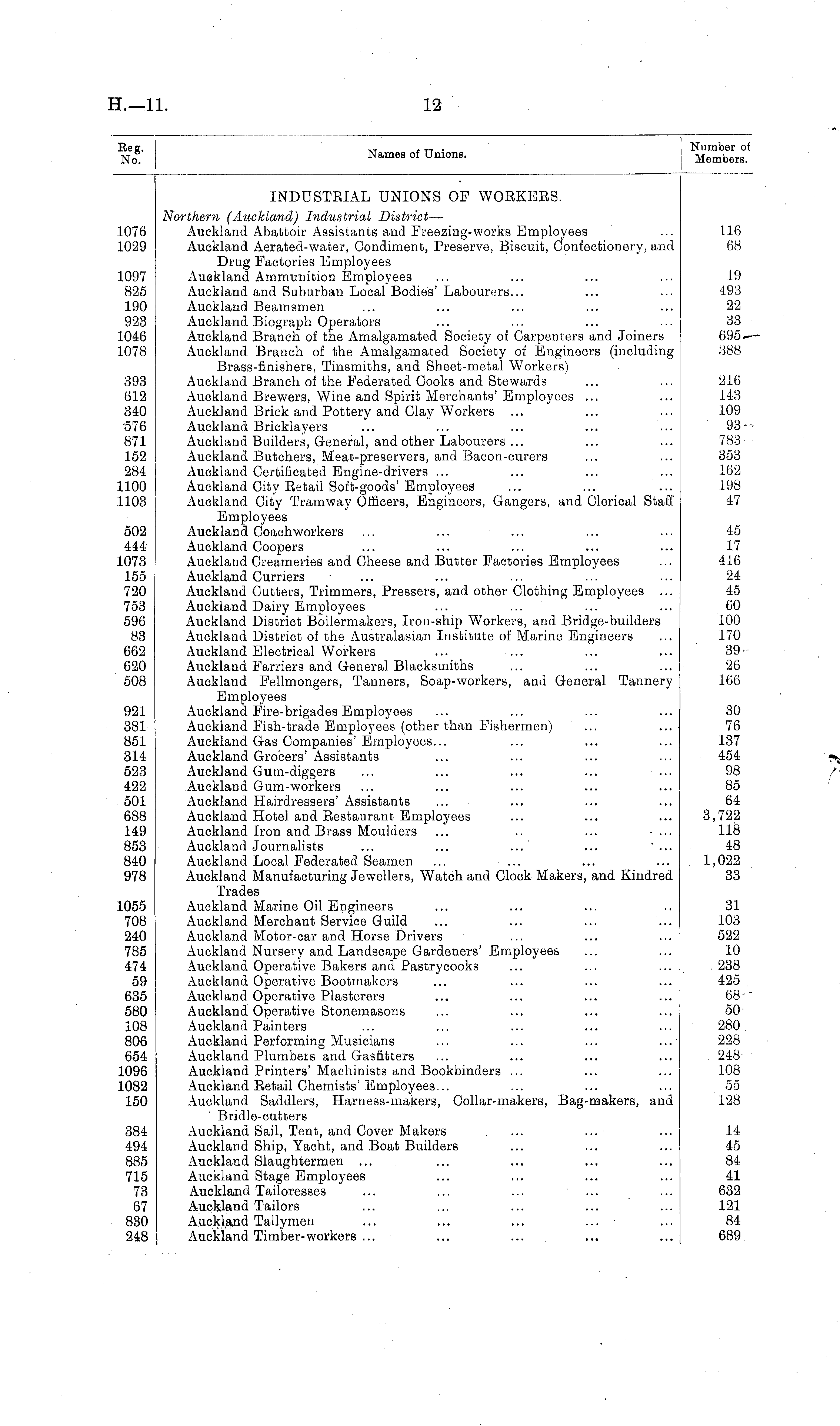 Reg. No. Names of Unions. Number ol Members. INDUSTRIAL UNIONS OF WORKEBS. L076 L029 1097 825 190 923 L046 L078 393 612 340 •576 871 152 284 .100 L103 502 444 .073 155 720 753 596 83 662 620 508 921 381 851 314 523 422 501 688 149 853 840 978 Northern (Auckland) Industrial District — Auckland Abattoir Assistants and Freezing-works Employees Auckland Aerated-water, Condiment, Preserve, Biscuit, Confectionery, and Drug Factories Employees Auckland Ammunition Employees Auckland and Suburban Local Bodies' Labourers... Auckland Beamsmen Auckland Biograph Operators Auckland Branch of the Amalgamated Society of Carpenters and Joiners Auckland Branch of the Amalgamated Society of Engineers (including Brass-finishers, Tinsmiths, and Sheet-metal Workers) Auckland Branch of the Federated Cooks and Stewards Auckland Brewers, Wine and Spirit Merchants' Employees ... Auckland Brick and Pottery and Clay Workers ... Auckland Bricklayers Auckland Builders, General, and other Labourers ... Auckland Butchers, Meat-preservers, and Bacon-curers Auckland Certificated Engine-drivers ... Auckland City Betail Soft-goods' Employees Auckland City Tramway Officers, Engineers, Gangers, and Clerical Staff Employees Auckland Coachworkers Auckland Coopers Auckland Creameries and Cheese and Butter Factories hhnployees Auckland Curriers Auckland Cutters, Trimmers, Pressers, and other Clothing Employees ... Auckland Dairy Employees Auckland District Boilermakers, Iron-ship Workers, and Bridge-builders Auckland District of the Australasian Institute of Marine Engineers Auckland Electrical Workers ... ... Auckland Farriers and General Blacksmiths Auckland Fellmongers, Tanners, Soap-workers, and General Tannery Employees Auckland Fire-brigades Employees Auckland Fish-trade Employees (other than Fishermen) Auckland Gas Companies'Employees... Auckland Grocers' Assistants Auckland Gum-diggers Auckland Gum-workers Auckland Hairdressers' Assistants Auckland Hotel and Restaurant Employees Auckland Iron and Brass Moulders Auckland Journalists ... ... ... ... "... Auckland Local Federated Seamen Auckland Manufacturing Jewellers, Watch and Clock Makers, and Kindred Trades Auckland Marine Oil Engineers Auckland Merchant Service Guild Auckland Motor-car and Horse Drivers Auckland Nursery and Landscape Gardeners' Employees Auckland Operative Bakers and Pastrycooks Auckland Operative Bootmakers Auckland Operative Plasterers Auckland Operative Stonemasons Auckland Painters Auckland Performing Musicians Auckland Plumbers and Gasfitters Auckland Printers' Machinists and Bookbinders ... Auckland Betail Chemists'Employees... Auckland Saddlers, Harness-makers, Collar-makers, Bag-makers, and Bridle-cutters Auckland Sail, Tent, and Cover Makers Auckland Ship, Yacht, and Boat Builders Auckland Slaughtermen ... Auckland Stage Employees Auckland Tailoresses ... ... ... ... Auckland Tailors Auckland Tallymen Auckland Timber-workers ... 116 68 19 493 22 33 695-— 388 216 143 109 93 783 353 162 198 47 45 17 416 24 45 60 100 170 39 26 166 30 76 137 454 98 85 64 3,722 118 48 1,022 33 .055 708 240 785 474 59 635 580 108 806 654 L096 L082 150 31 103 522 10 238 425 68 50 280 228 248 108 55 128 384 494 885 715 73 67 830 248 14 45 84 41 632 121 84 689