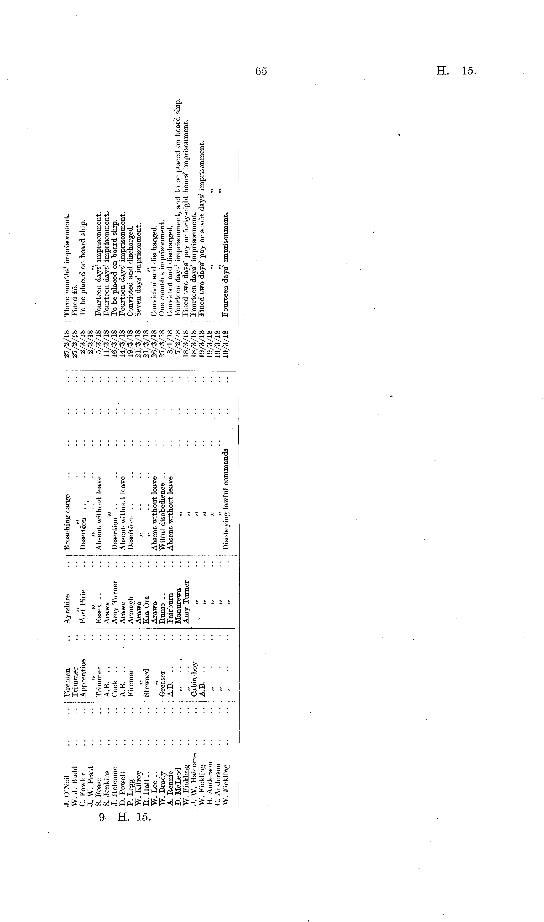 J. O'Neil W. J. Budd C. Fowler Ji W. Pratt S. Fosse S. Jenkins J. Holcome D. Powell P. Legg W. Kilroy R. Hall.. W. Lee .. .. W. Brady A. Rennie D. McLeod W. Fickling J. W. Halcome .. W. Fickling H. Anderson C. .Anderson W. Fickling " " I Fireman Trimmer Apprentice Trimmer A.B. .. Cook .. A.B. .. Fireman Steward Greaser A.B. .. Cabin-boy AB. .. " Ayrshire Port Pirie Essex .. Arawa Amy Turner Arawa Armagh Arawa Kia Ora Arawa Runic .. Fairburn Manurewa Amy Turner .. I Broaching cargo .. | Desertion Absent without leave Desertion Absent without leave Desertion Absent without leave Wilful disobedience Absent without leave 27/2/18 Three months imprisonment. 27/2/18 Fined £5. 2/3/18 To be placed on board ship. 2/3/18 5/3/18 Fourteen days' imprisonment. 11/3/18 Fourteen days' imprisonment. 16/3/18 To be placed on board ship. 14/3/18 Fourteen days' imprisonment. 19/3/18 Convicted and discharged. 21/3/18 Seven davs' imprisonment. 21/3/18 26/3/18 Convicted and discharged. 27/3/18 One month s imprisonment. 8/1/18 Convicted and discharged. 7/2/18 Fourteen days' imprisonment, and to be placed on board ship. 18/3/18 Fined two days' pay or forty-eight hours' imprisonment. 18/3/18 Fourteen days' imprisonment. 19/3/18 Fined two days' pay or seven days' imprisonment. 19/3/18 19/3/18 19/3/18 : Fourteen days' imprisonment. .. Disobeying lawful commands