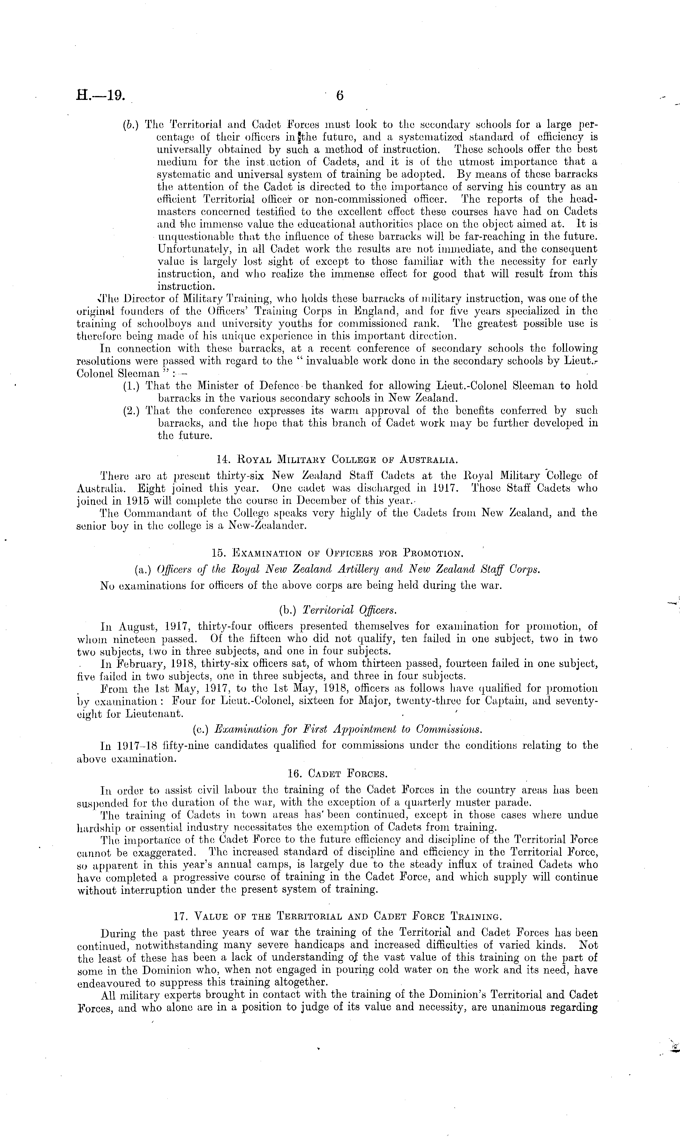 (6.) The Territorial and Cadet Forces must look to the secondary schools for a large percentage of their officers injthe future, and a systematized standard of efficiency is universally obtained by such a method of instruction. These schools offer the best medium for the inst.uction of Cadets, and it is of the utmost importance that a systematic and universal system of training be adopted. By means of these barracks the attention of the Cadet is directed to the importance of serving his country as an efficient Territorial officer or non-commissioned officer. The reports of the headmasters concerned testified to the excellent effect these courses have had on Cadets and the immense value the educational authorities place on the object aimed at. It is unquestionable that the influence of these barracks will be far-reaching in the future. Unfortunately, in all Cadet work the results tire not immediate, and the consequent value is largely lost sight of except to those familiar with the necessity for early instruction, and who realize the immense effect for good that will result from this instruction. ■The Director of Military Training, who holds these barracks of military instruction, was one of the original founders of the Officers' Training Corps in England, and for five years specialized in the, training of schoolboys and university youths for commissioned rank. The greatest possible use is therefore being made of his unique experience in this important direction. In connection with these barracks, at a recent conference of secondary sohools the following resolutions were passed with regard to the " invaluable work done in the secondary schools by Lieut.*Colonel Sleeman " : — (1.) That the Minister of Defence be thanked for allowing Lieut.-Colonel Sleeman to hold barracks in the various secondary sohools in New Zealand. (2.) That the conference expresses its warm approval of the benefits conferred by such barracks, and the hope that this branch of Cadet work may be further developed in the future. 14. Royal Military College of Australia. There are at present thirty-six New Zealand Staff Cadets at the Royal Military College of Australia. Eight joined this year. One cadet was discharged in 1917. Those Staff Cadets who joined in 1915 will complete the course in December of this year. The Commandant of the College speaks very highly of the Cadets from New Zealand, and the senior boy in the college is a Ncw-Zealander. 1.5. Examination of Officers for Promotion. (a.) Officers of the Royal New Zealand Artillery and New Zealand Staff Corps. No examinations for officers of the above corps are being held during the war. (b.) Territorial Officers. In August, 191.7, thirty-four officers presented themselves for examination for promotion, of whom nineteen passed. Of the fifteen who did not qualify, ten failed in one subject, two in two two subjects, two in three subjects, and one in four subjects. In February, 1918, thirty-six officers sat, of whom thirteen passed, fourteen failed in one subject, five failed in two subjects, one in three subjects, and three in four subjects. From the Ist May, 1917, to the Ist May, 1918, officers as follows have qualified for promotion by examination : Four for Lieut.-Colonel, sixteen for Major, twenty-three for Captain, and seventyeight for Lieutenant. (c.) Examination for First Appointment to Commissions. In 1917-18 fifty-nine candidates qualified for commissions under the conditions reiating to the above examination. i 6. Cadet Forces. In order to assist civil labour the training of tho Cadet Forces in the country areas has been suspended for the duration of the war, with the exception of a quarterly muster parade. The training of Cadets in town areas has' been continued, except in those cases where undue hardship or essential industry necessitates the exemption of Cadets from training. The; importance of the Cadet Force to the future efficiency and discipline of the Territorial Force cannot be exaggerated. The increased standard of discipline and efficiency in the Territorial Force, so apparent in this year's annual camps, is largely due to the steady influx of trained Cadets who have completed a progressive course of training in the Cadet Force, and which supply will continue without interruption under the present system of training. 17. Value of the Territorial and Cadet Force Training. During the past three years of war the training of the Territorial and Cadet Forces has been continued, notwithstanding many severe handicaps and increased difficulties of varied kinds. Not the least of these has been a lack of understanding oj the vast value of this training on the part of some in the Dominion who, when not engaged in pouring cold water on the work and its need, have endeavoured to suppress this training altogether. All military experts brought in contact with the training of the Dominion's Territorial and Cadet Forces, and who alone are in a position to judge of its value and necessity, arc unanimous regarding