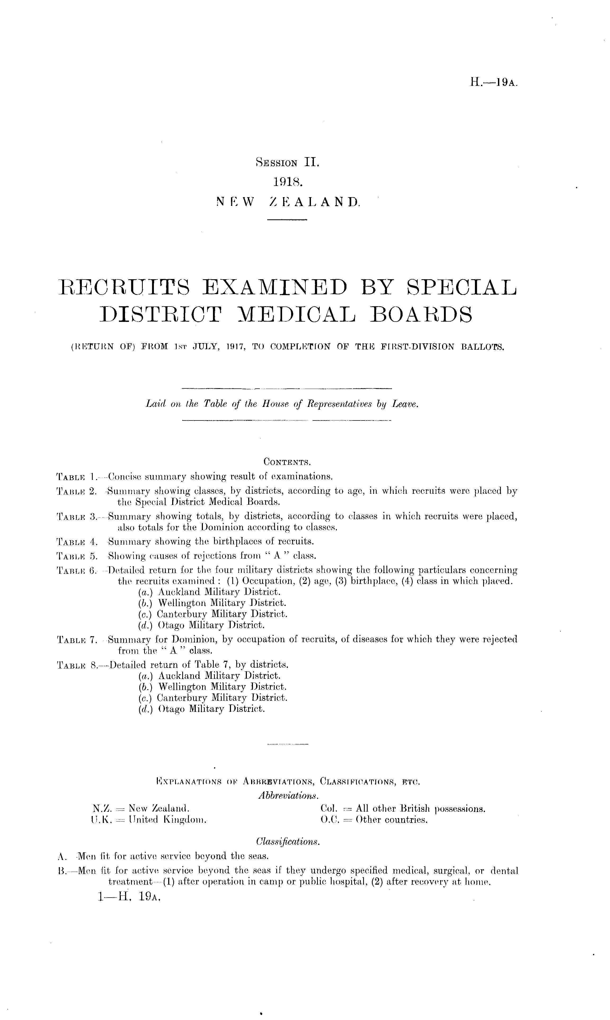 Contents. Table 1. —Concise summary showing result of examinations. Table 2.—Summary showing classes, by districts, according to age, in which recruits were placed by the Special District Medical Boards. Table 3. —Summary showing totals, by districts, according to classes in which recruits were placed, also totals for the Dominion according to classes. Table 4. -Summary showing the birthplaces of recruits. Table 5.- -Showing causes of rejections from " A " class. Table 6. —Detailed return for the four military districts showing the following particulars concerning the recruits examined : (1) Occupation, (2) age, (3) birthplace, (4) class in which placed. (a.) Auckland Military District. (6.) Wellington Military District, (c.) Canterbury Military District. (d.) Otago Military District. Table 7. Summary for Dominion, by occupation of recruits, of diseases for which they were rejected from the " A " class. Table 8. —Detailed return of Table 7, by districts. (a.) Auckland Military District. (b.) Wellington Military District, (c.) Canterbury Military District. (d.) Otago Military District. KXPLANATTONS OF ABBREVIATIONS, CIASRI KTCATIONS, ETfl. Abbreviations. N.Z. = New Zealand. Col. = All other British possessions. U.K. = United Kingdom. O.C. = Other countries. Classifications. A. —Men fit for active service beyond the seas. B. —Men fit for active service beyond the seas if they undergo specified medical, surgical, or dental treatment —(1) after operation in camp or public hospital, (2) after recovery at home.