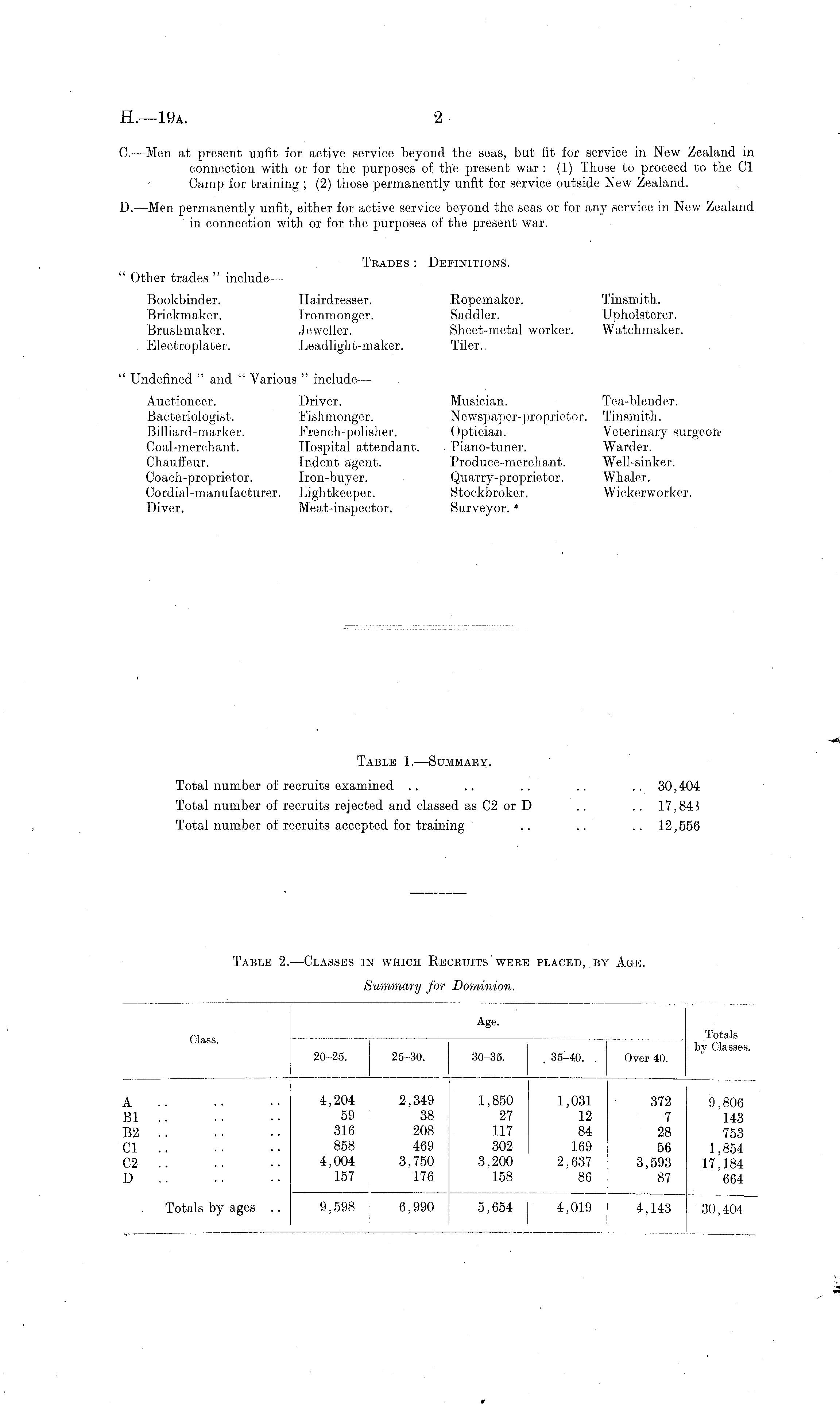 C. —Men at present unfit for active service beyond the seas, but fit for service in New Zealand in connection with or for the purposes of the present war : (1) Those to proceed to the Cl Camp for training ; (2) those permanently unfit for service outside New Zealand. D.—Men permanently unfit, either for active service beyond the seas or for any service in New Zealand in connection with or for the purposes of the present war. Trades : Definitions. " Other trades " include — Bookbinder. Hairdresser. Ropemaker. Tinsmith. Brickmaker. Ironmonger. Saddler. Upholsterer. Brushmaker. Jeweller. Sheet-metal worker. Watchmaker. Electroplater. Leadlight-maker. Tiler., " Undefined " and " Various " include — Auctioneer. Driver. Musician. Tea-blender. Bacteriologist. Fishmonger. Newspaper-proprietor. Tinsmith. Billiard-marker. French-polisher. Optician. Veterinary surgeon-Coal-merchant. Hospital attendant. Piano-tuner. Warder. Chauffeur. Indent agent. Produce-merchant. Well-sinker. Coach-proprietor. Iron-buyer. Quarry-proprietor. Whaler. Cordial-manufacturer. Lightkeeper. Stockbroker. Wickerworker. Diver. Meat-inspector. Surveyor. *