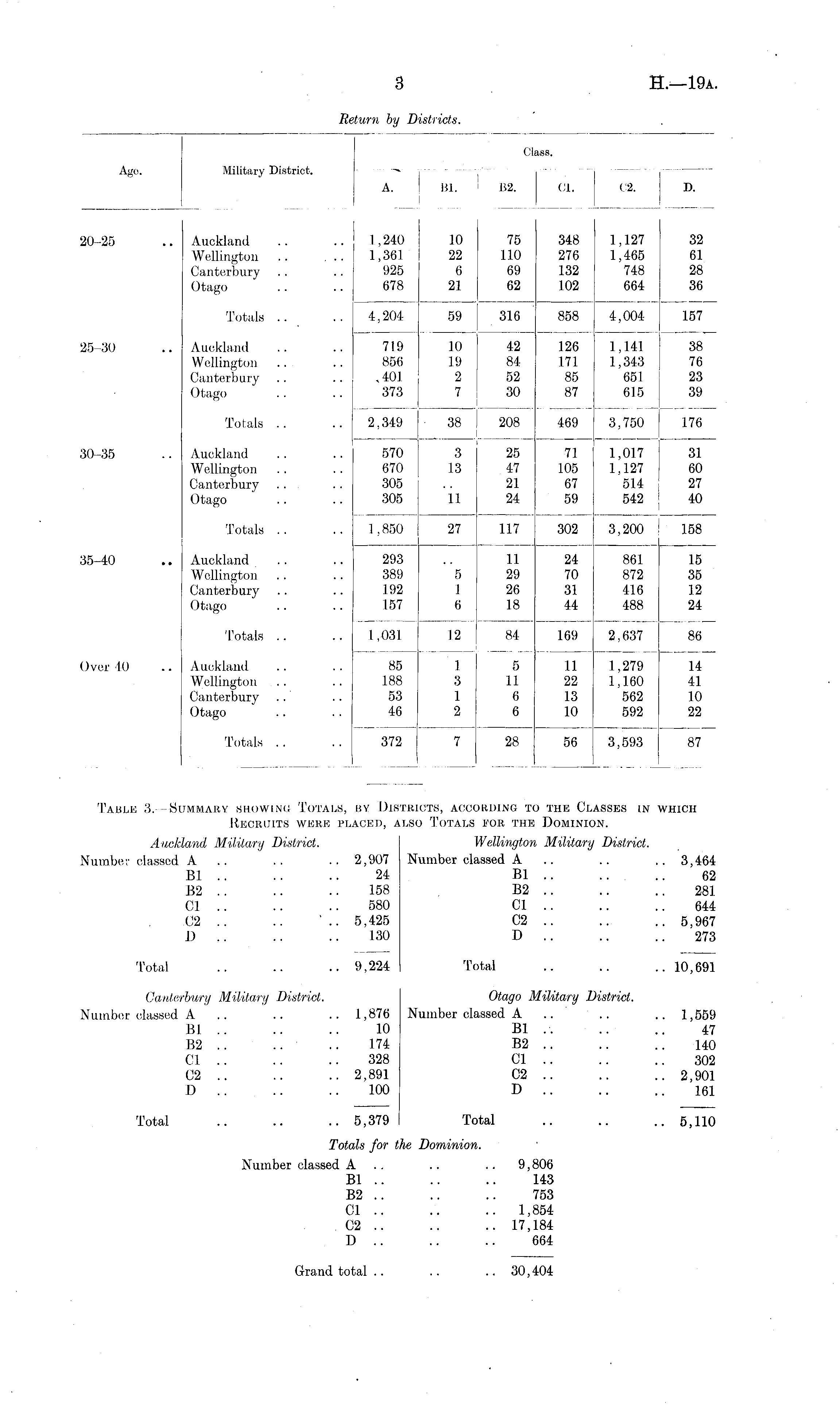 CI ,ss. Age. Military District. B2. A. Bl. CI. C2. 1). 10-25 Auckland Wellington Canterbury Otago 1,240 1,361 925 678 10 22 6 21 75 110 69 62 348 276 132 102 1,127 1,465 748 664 32 61 28 36 Totals 4,204 59 316 858 4,004 157 15-30 Auckland Wellington Canterbury Otago 719 856 ,401 373 10 19 2 7 42 84 52 30 126 171 85 87 1,141 1,343 651 615 38 76 23 39 10-35 Totals 2,349 38 208 469 3,750 176 Auckland Wellington Canterbury Otago 570 670 305 305 3 13 25 47 21 24 71 105 67 59 1,017 1,127 514 542 31 60 27 40 11 I I Totals 1,850 27 117 302 3,200 158 15-40 Auckland Wellington Canterbury Otago 293 389 192 157 5 I 6 11 29 26 .18 24 70 31 44 861 872 416 488 15 35 12 24 Totals 1,031 12 84 169 2,637 86 Iver 40 Auckland Wellington Canterbury Otago 85 188 53 46 1 3 I 2 5 II 6 6 II 22 13 10 1,279 1,160 562 592 14 41 10 22 Totals 372 7 28 56 3,593 87