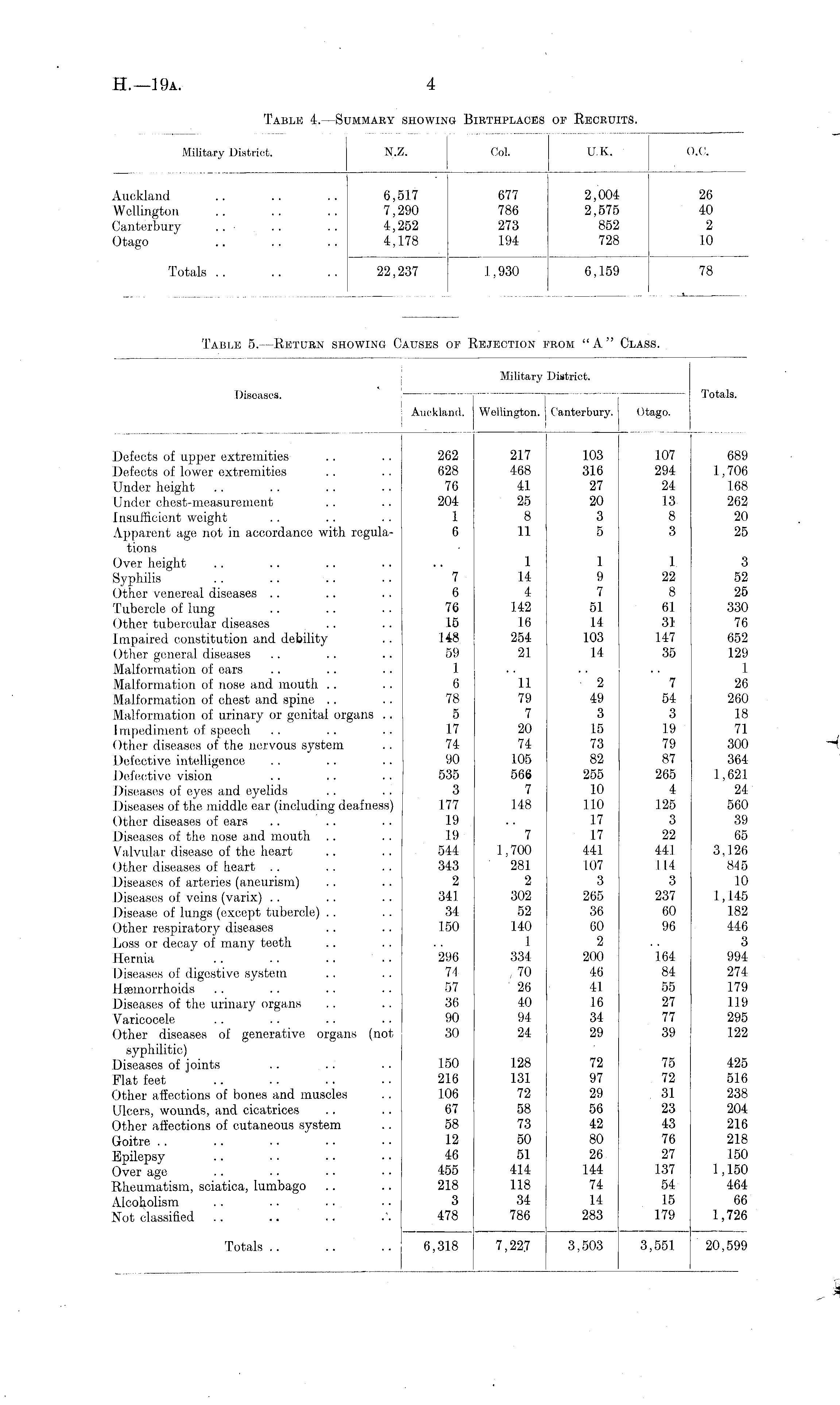 Diseases. Auckland. Military Wellington. District. I Canterbury. t Totals. Otago. Defects of upper extremities Defects of lower extremities Under height Under chest-measurement Insufficient weight Apparent age not in accordance with regulations Over height Syphilis Other venereal diseases Tubercle of lung Other tubercular diseases Impaired constitution and debility Other general diseases Malformation of ears Malformation of nose and mouth Malformation of chest and spine Malformation of urinary or genital organs .. Impediment of speech (Ither diseases of the nervous system Defective intelligence Defective vision Diseases of eyes and eyelids Diseases of the middle car (including deafness) Oilier diseases of ears Diseases of the nose and mouth Valvular disease of the heart Other diseases of heart Diseases of arteries (aneurism) Diseases of veins (varix) Disease of lungs (except tubercle) . . ()ther respiratory diseases Loss or decay of many teeth Hernia Diseases of digestive system Haemorrhoids Diseases of the urinary organs Varicocele Other diseases of generative organs (not syphilitic) Diseases of joints .. Flat feet Other affections of bones and muscles Ulcers, wounds, and cicatrices Other affections of cutaneous system Goitre Epilepsy Over age Rheumatism, sciatica, lumbago Alcoholism Not classified 262 628 76 204 1 6 217 468 41 25 8 11 103 316 27 20 3 5 103 316 27 20 3 5 107 689 294 1,706 24 168 13 262 8 20 3 25 7 6 76 15 148 59 1 6 78 5 17 74 90 535 3 177 19 19 544 343 2 341 34 150 1 14 4 142 16 254 21 1 9 7 51 14 103 14 2 49 3 15 73 82 255 10 110 17 1.7 441 107 3 265 36 60 2 200 46 41 16 34 29 1 9 7 51 14 103 14 1 3 22 52 8 25 61 330 31 76 147 652 35 129 1 7 26 54 260 3 18 19 71 79 300 87 364 265 1,621 4 21 125 560 3 39 22 65 441 3,126 114 845 3 10 237 1,145 60 182 96 446 3 164 994 84 274 55 179 27 119 77 295 39 122 11 79 7 20 74 105 566 7 148 7 1,700 281 2 302 52 140 1 334 ,70 26 40 94 24 2 49 3 15 73 82 255 10 110 17 1.7 441 107 3 265 36 60 2 200 46 41 16 34 29 296 71 57 36 90 30 150 216 106 67 58 12 46 455 218 3 478 128 131 72 58 73 50 51 414 118 34 786 72 97 29 56 42 80 26 144 74 14 283 72 97 29 56 42 80 26 144 74 14 283 75 425 72 516 31 238 23 204 43 216 76 218 27 150 137 .1,150 54 464 15 66 179 1,726 Totals 6,318 7,227 3,503 3,551 20,599