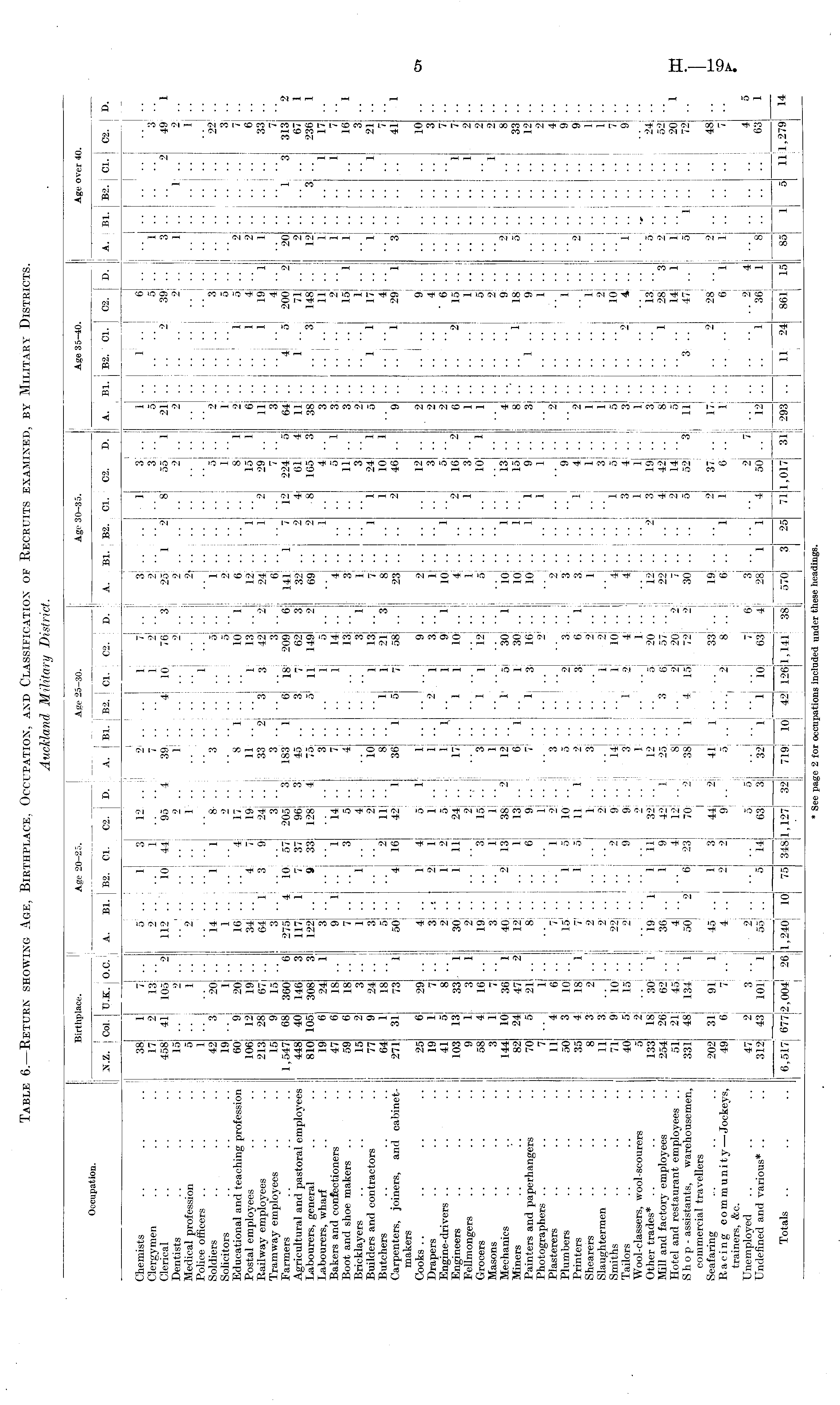 Table 6.—Return showing Age, Birthplace, Occupation, and Classification of Recruits examined, by Military Districts. Auckland Military District.