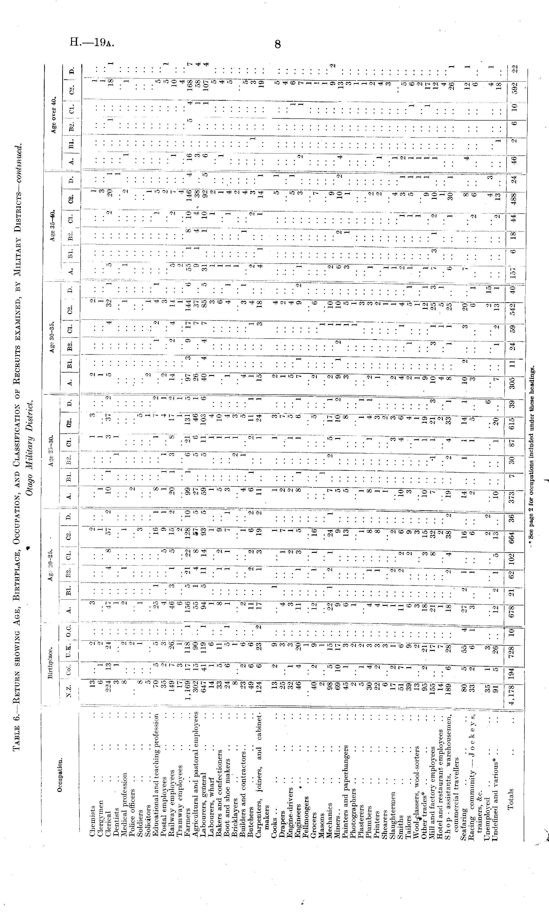 Table 6.—Return showing Age, Birthplace, Occupation, and Classification of Recruits examined, by Military Districts— continued. Otago Military District.