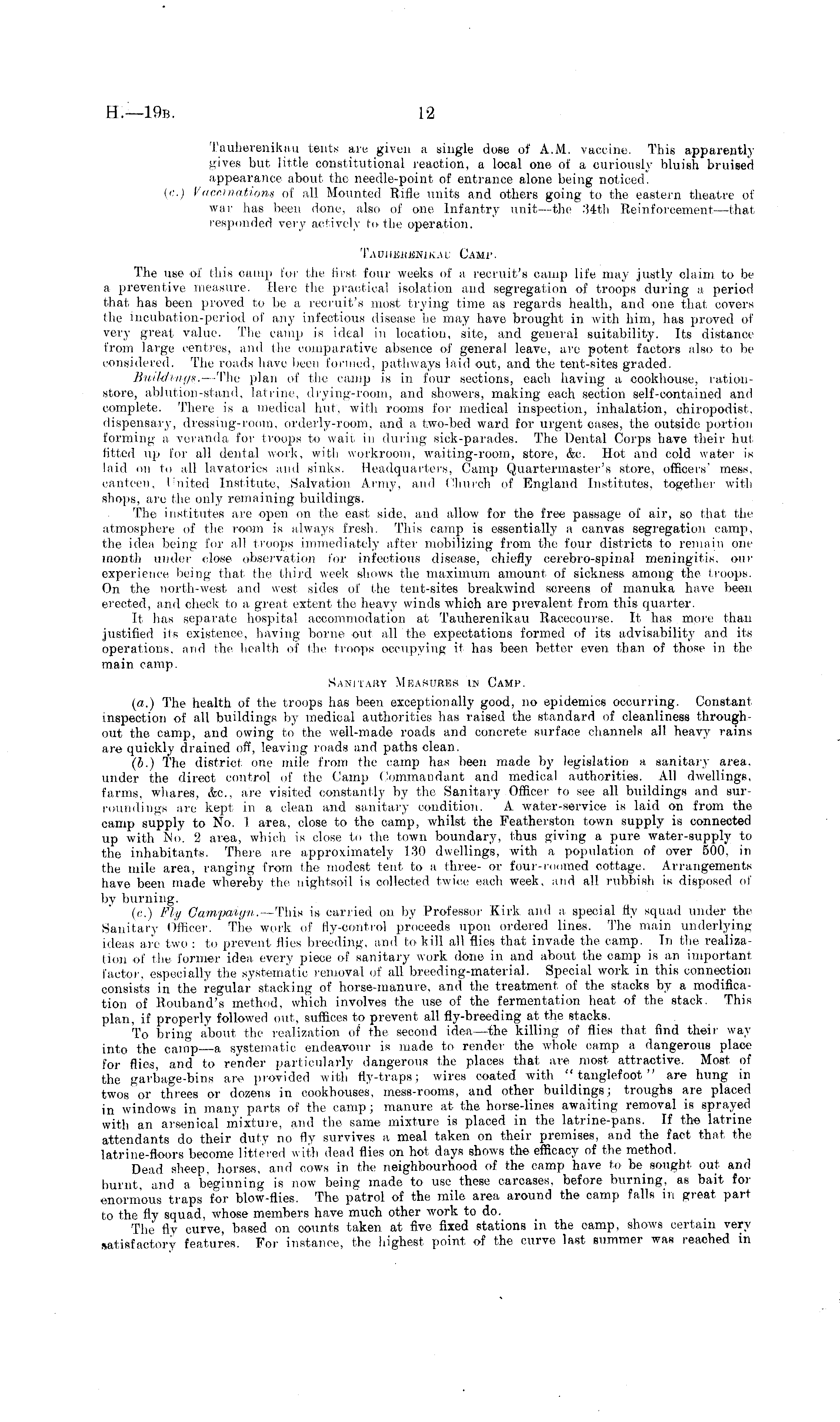 Tauherenikau tents are given a single dose of A.M. vaccine. This apparently gives but little constitutional reaction, a local one of a curiously bluish bruised appearance about the needle-point of entrance alone being noticed*, (c.) Vaccinations of all Mounted Rifle units and others going to the eastern theatre of war has been done, also of one Infantry unit—the 34th Reinforcement -that responded very actively to the operation. T.ujnivifENiK.u: Camp. The use of this camp for the first four weeks of a recruit's camp life may justly claim to be a preventive measure. Here the practical isolation and segregation of troops during a period that has been proved to lie a recruit's most trying time as regards health, and one that covers the incubation-period of any infectious disease be may have brought in with him, has proved of very great value. The camp is ideal in location, site, and general suitability. Its distance from large centres, and the comparative absence of general leave, are potent factors also to be considered. The roads have been formed, pathways laid out, and the tent-sites graded. Buildings.—The plan of the camp is in four sections, each having a cookhouse, rationstore, ablution-stand, latrine, drying-room, and showers, making each section self-contained and complete. There is a medical hut. with rooms for medical inspection, inhalation, chiropodist, dispensary, dressing-room, orderly-room, and a two-bed ward for urgent cases, the outside portion forming a veranda for troops to wait, in during sick-parades. The Dental Corps have their hut fitted up for all dental work, with workroom, waiting-room, store, &c. Hot and cold water is laid on to nil lavatories and sinks. Headquarters, Camp Quartermaster's store, officers' mess, canteen, United Institute, Salvation Army, and Church of England Institutes, together with shops, are the only remaining buildings. The institutes are open on the east side, and allow for the free passage of air, so that the atmosphere of the room is always fresh. This camp is essentially a canvas segregation camp, the idea being for all troops immediately after mobilizing from the four districts to remain one month under close observation for infectious disease, chiefly cerebro-spinal meningitis, our experience being that the third week shows the maximum amount of sickness among the troops. On the north-west and west sides of the tent-sites breakwind screens of manuka have been erected, and check to a, great extent the heavy winds which are prevalent from this quarter. It has separate hospital accommodation at Tauherenikau Racecourse. It has more than justified its existence, having borne out all the expectations formed of its advisability and its operations, and the health of the troops occupying it has been better even than of those in the main camp. Sanitary Measures in Camh. (a.) The health of the troops has been exceptionally good, no epidemics occurring. Constant inspection of all buildings by medical authorities has raised the standard of cleanliness throughout the camp, and owing to the well-made roads and concrete surface channels all heavy rains are quickly drained off, leaving roads and paths clean. (b.) The district one mile from the camp has been made by legislation a sanitary area, under the direct control of the Cam]) Commandant and medical authorities. All dwellings, farms, whares, &c, are visited constantly by the Sanitary Officer to see all buildings and surroundings are kept in a clean and sanitary condition. A. water-service is laid on from the camp supply to No. I area, close to the camp, whilst the Featherston town supply is connected up with No. 2 area, which is close to the town boundary, thus giving a pure water-supply to the inhabitants. There are approximately 130 dwellings, with a population of over 500, in the mile area, ranging from the modest tent to a three- or four-roomed cottage. Arrangements have been made whereby the nightsoil is collected twice each week, and all rubbish is disposed of by burning. (c.) Fly Campaign. —This is carried on by Professor Kirk and a special fly squad under the Sanitary Officer. The work of fly-control proceeds upon ordered lines. The main underlying ideas arc two : to prevent Hies breeding, and to kill all flies that invade the camp. _ Tn the realization of the former idea every piece of sanitary work done in and about the camp is an important, factor, especially the systematic removal of all breeding-material. Special work in this connection consists in the regular stacking of horse-manure, and the treatment of the stacks by a modification of Rouband's method, which involves the use of the fermentation heat of the stack. This plan, if properly followed out, suffices to prevent all fly-breeding at the stacks. To bring about the realization of the second idea—the killing of flies that find their way into the camp—a systematic endeavour is made to render the whole camp a dangerous place for flies, and to render particularly dangerous the places that, are most attractive. Most of the garbage-bins are provided with' fly-traps; wires coated with "tanglefoot" are hung in twos or threes or dozens in cookhouses, mess-rooms, and other buildings; troughs are placed in windows in many parts of the camp; manure at the horse-lines awaiting removal is sprayed with an arsenical mixture, and the same mixture is placed in the latrine-pans. If the latrine attendants do their duty no fly survives a meal taken on their premises, and the fact that the latrine-floors become littered with dead flies on hot days shows the efficacy of the method. Dead sheep, horses, and cows in the neighbourhood of the camp have to be sought, out and burnt, and a beginning is now being made to use these carcases, before burning, as bait for enormous traps for blow-flies. The patrol of the mile area around the camp falls in great, part to the fly squad, whose members have much other work to do. The fly curve, based on counts ta