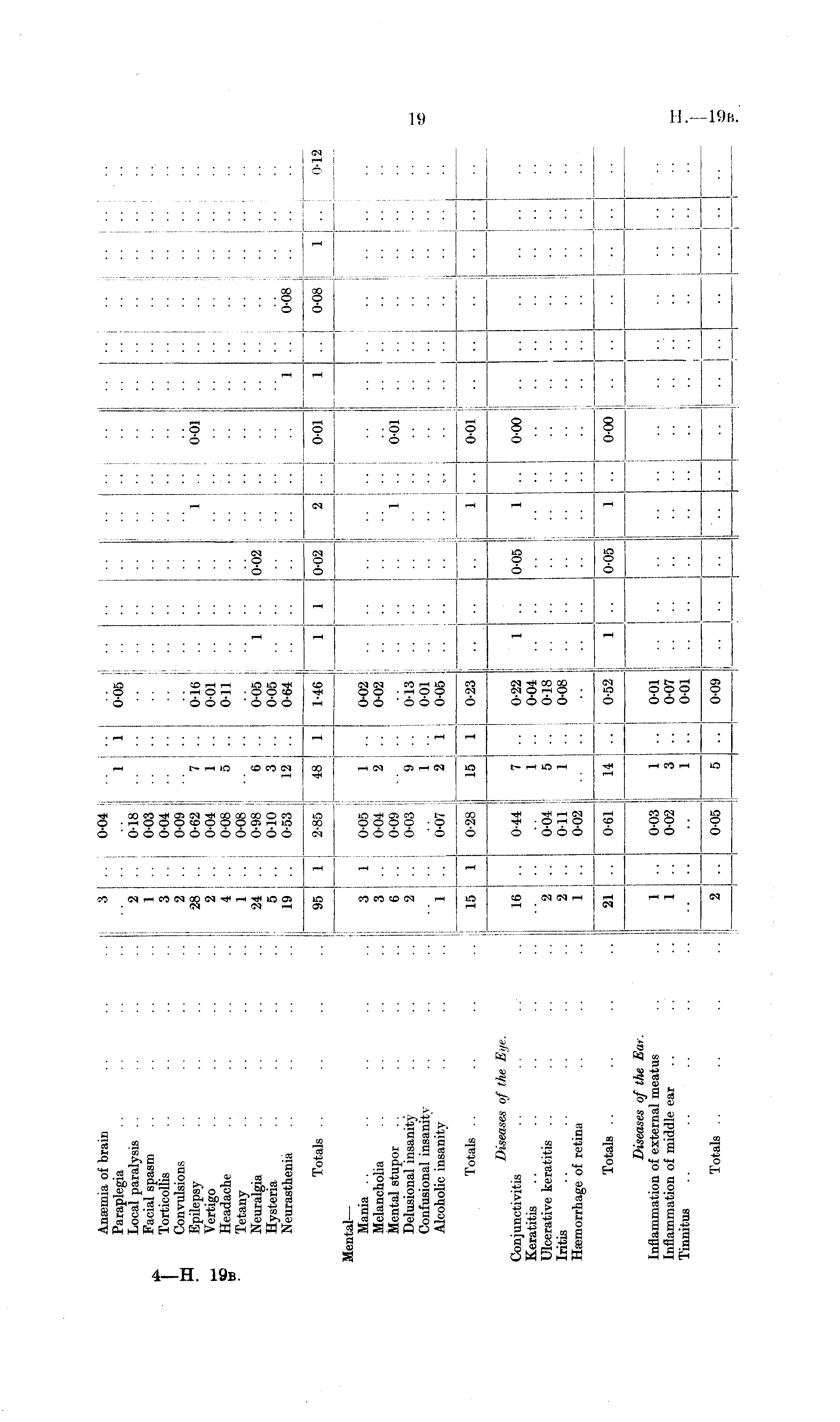 Anaemia of brain Paraplegia Local paralysis Facial spasm Torticollis Convulsions Epilepsy Vertigo Headache Tetany Neuralgia Hysteria Neurasthenia Totals Mental — Mania Melancholia Mental stupor Delusional insanity Confusional insanity Alcoholic insanity .. j 3 .. .. | 2 .. .. I 1 ..' 3 .. 2 .. 28 .. 2 .. 4 .. 1 .. 24 .. 5 .. 19 .. 95 1 3 1 3 .. 6 .. 2 .. 1 .. 0-04 > 0-18 0-03 0-04 0-09 0-62 0-04 0-08 ; 0-08 0-98 0-10 0-53 i 1 1 7 .. 1 .. 5 6 .. 3 .. 12 .. •• I 0-05 •■ i -• I I . . I I: . . I) •• 0-16 0-01 0-11 1 I 0-01 "rt ■ i • • I -• •■ •• 0-05 I 0-05 i 0-64 ; 1 0-02 •• I I .. ; i i •• ii I •• ' i •■ ; I : i. i .-. I 1 0-08 2-85 | 48 | 1 1-46 i " 0-02 2 . 0-01 0-08 !:" 0-12 il 0-05 : 0-04 0-09 0-03 0-07 1 2 9 .. 1 2 I 1 I T T 0-02 0-02 .. .. I .. j "l | '.'. 0-01 i j 0-13 0-01 0-05 . . I i •- i - \ •• \ i : •• i i ! ! i I Ii I I I " - Totals Diseases of the Eye. Conjunctivitis Keratitis Ulcerative keratitis Iritis Hemorrhage of retina Totals .. Diseases of the Ear. Inflammation of external meatus Inflammation of middle ear Tinnitus Totals 15 1 16 .. 2 .. 2 .. 1 .. 21 1 .. 1 .. 2 .. 0-28 i 15, 1 | 0-23 1 .. 0-01 l! " — 0-44 0-04 0-11 0-02 il 7 1 5 1 1 1 0-22 0-04 0-18 0-08 0-05 •• < 0-flO •• " : i .. .. I " I I I •• -• j : •■ •- i| " l " 1 I " ■• I I I " ■■ . . ! . . ■- I I I I — 0-61 14 0-52 0-05 0-00 i .. 0-03 I 0-02 1 1 3 1 .. I 0-01 0-07 0-01 I I " 0-05 | i 0-09 I i I I " ■ • i