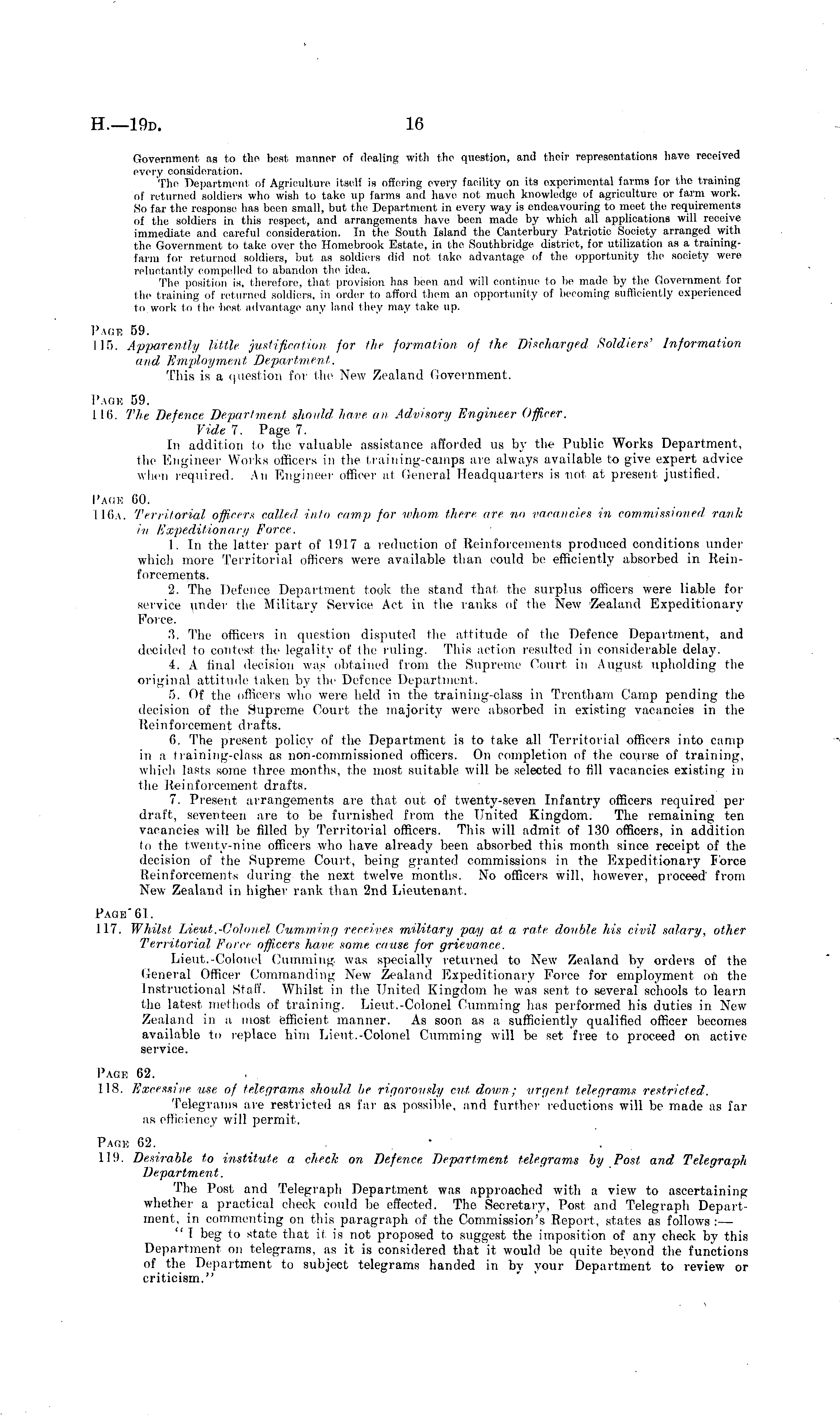Government as to the best manner of dealing with the question, and their representations have received every consideration. The Department of Agriculture itself is offering every facility on its experimental farms for the training of returned soldiers who wish to take up farms and have not much knowledge of agriculture or farm work. So far the response has been small, but the Department in every way is endeavouring to meet the requirements of the soldiers in this respect, and arrangements have been made by which all applications will receive immediate and careful consideration. In the South Island the Canterbury Patriotic Society arranged with the Government to take over tho Homebrook Estate, in the Southbridge district, for utilization as a trainingfarm for returned soldiers, but as soldiers did not take advantage of the opportunity the society were reluctantly compelled to abandon the idea. The position is, therefore, that provision has been and will continue to be made by the Government for (he training of returned soldiers, in order to afford them an opportunity of becoming sufficiently experienced to.work to the best advantage any land they may take up. Page 59. 115. Apparently little, justification for the formation of the Discharged Soldiers' Information and Employment, Department. This is a question for the Now Zealand Government. Page 59. 118, The Defence Department should, have an Advisory Engineer Officer. Vide 7. Page 7. In addition to the valuable assistance afforded us by the Public Works Department, the Engineer Works officers in the training-camps are always available to give expert advice when required. An Engineer officer at General Headquarters is not at present justified. Page CO. lICa. Territorial officers called into camp for whom there are no vacancies in commissioned rank in Expeditionary Force. 1. In the latter part of 1917 a reduction of Reinforcements produced conditions under which more Territorial officers were available than could be efficiently absorbed in Reinforcements. 2. The Defence Department took the stand that the surplus officers were liable for service under the Military Service Act in the ranks of the New Zealand Expeditionary Force. 3. The officers in question disputed the attitude of the Defence Department, and decided to contest the legality of the ruling. This action resulted in considerable delay. 4. A final decision was obtained from the Supreme Court in August upholding (he original attitude taken by the Defence Department. 5. Of the officers who were held in the training-class in Trentham Camp pending the decision of the Supreme Court the majority were absorbed in existing vacancies in the Reinforcement drafts. 6. The present policy of the Department is to take all Territorial officers into camp in a training-class as non-commissioned officers. On completion of the course of training, which lasts some three months, the most suitable will be selected to till vacancies existing in the Reinforcement drafts. 7. Present arrangements are that out of twenty-seven Infantry officers required per draft, seventeen are to be furnished from the United Kingdom. The remaining ten vacancies will be filled by Territorial officers. This will admit of 130 officers, in addition to the twenty-nine officers who have already been absorbed this month since receipt of the decision of the Supreme Court, being granted commissions in the Expeditionary Force Reinforcements during the next twelve months. No officers will, however, proceed from New Zealand in higher rank than 2nd Lieutenant. Page'6l. 117. Whilst Lieut.-Colonel Cummin g receives military pay at a rate double his civil salary, other Territorial Force officers have some, cause for grievance. Lieut.-Colonel Gumming was specially returned to New Zealand by orders of the General Officer Commanding New Zealand Expeditionary Force for employment on the Instructional Staff. Whilst in the United Kingdom he was sent to several schools to learn the latest methods of training. Lieut,-Colonel Gumming has performed his duties in New Zealand in a most efficient manner. As soon as a sufficiently qualified officer becomes available to replace him Lieut.-Colonel Gumming will be set free to proceed on active sei-vice. Page 62. 118. Excessive use of telegrams should be rigorously cut down; urgent telegrams restricted. Telegrams are restricted as far as possible, and further reductions will be made as far as efficiency will permit. Page 62. 119. Desirable to institute, a check on Defence, Department telegrams by Post and Telegraph Department. The Post and Telegraph Department was approached with a view to ascertaining whether a practical check could be effected. The Secretary, Post and Telegraph Department, in commenting on this paragraph of the Commission's Report, states as follows : — " I beg to state that it is not proposed to suggest the imposition of any check by this Department on telegrams, as it is considered that it would be quite beyond the functions of the Department to subject telegrams handed in by your Department to review or criticism."