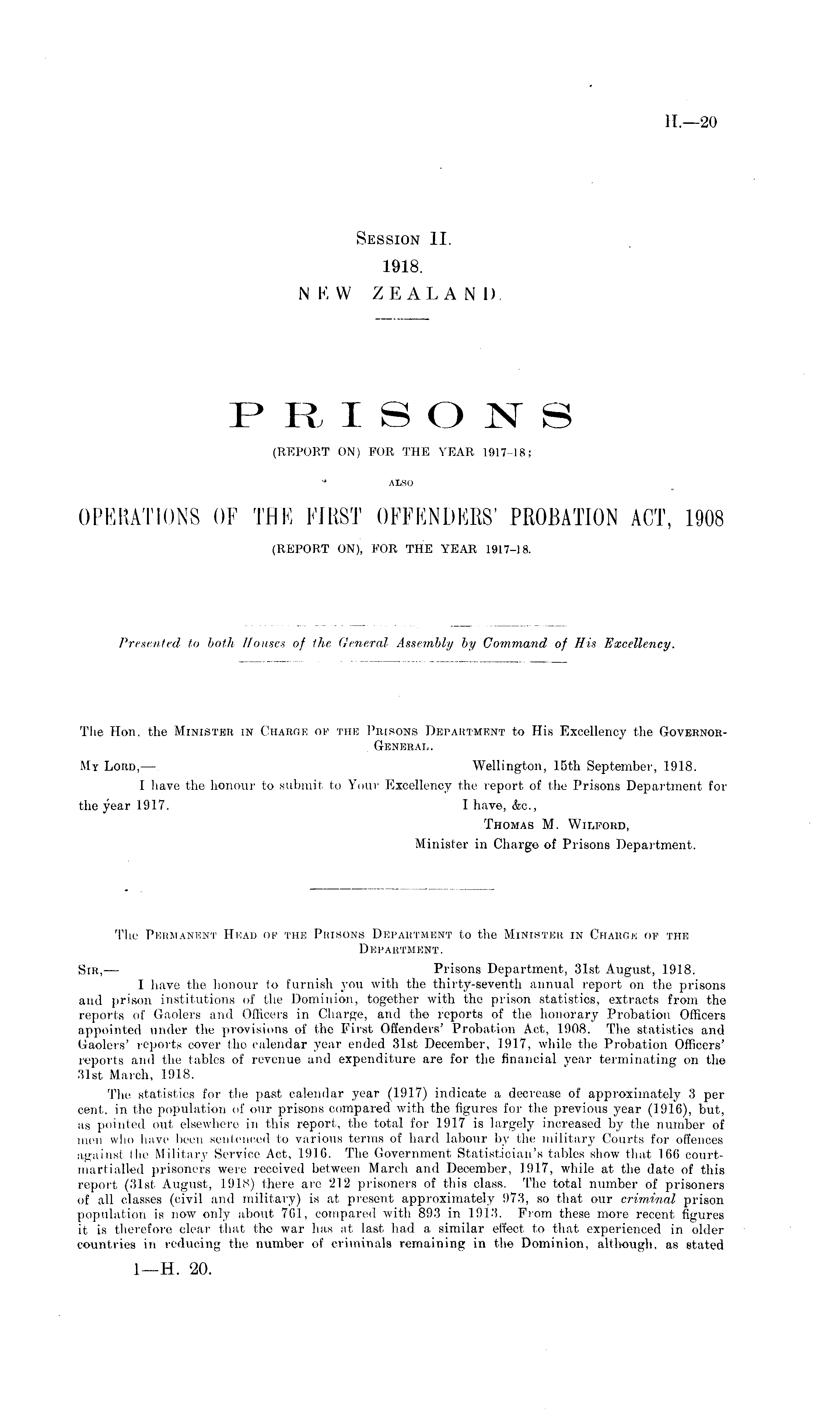 The Permanent Head of the Prisons Department to the Minister in Charge of the Department. Sir, — Prisons Department, 31st August, 1918. I have the honour to furnish, you with the thirty-seventh annual report on the prisons and prison institutions of the Dominion, together with the prison statistics, extracts from the reports of Gaolers and Officers in Charge, and the reports of the honorary Probation Officers appointed under the provisions of the First Offenders' Probation Act, 1908. The statistics and Gaolers' reports cover tho calendar year ended 31st December, 1917, while the Probation Officers' reports and the tables of revenue and expenditure are for the financial year terminating on the 31st March, 1918. The statistics for the past calendar year (1917) indicate a decrease of approximately 3 per cent, in the population of our prisons compared with the figures for the previous year (1916), but, as pointed out elsewhere in this re-port, the total for 1917 is largely increased by the number of men who have been sentenced to various terms of hard labour by the military Courts for offences against the Military Service Act, 1916. The Government Statistician's tables show that 166 courtmartialled prisoners were received between March and December, 1917, while at the date of this report (31st August, 1918) there are 212 prisoners of this class. The total number of prisoners of all classes (civil and military) is at present approximately 973, so that our criminal prison population is now only about 761, compared with 893 in 1913. From these more recent, figures it is therefore clear that the war has at last had a similar effect to that experienced in older countries in reducing the number of criminals remaining in the Dominion, although, as stated