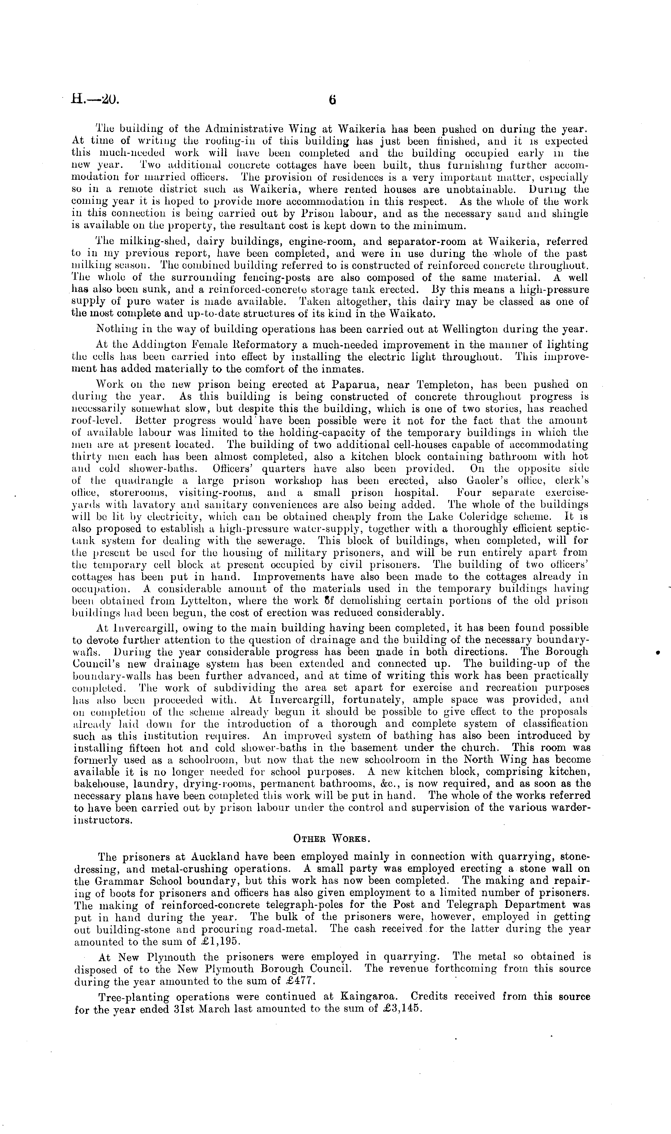 The building of the Administrative Wing at Waikeria has been pushed on during the year. At time of writing the rooling-in of this building has just been finished, and it is expected this much-needed work will have been completed and the building occupied early in the new year. Two additional concrete cottages have been built, thus furnishing further accommodation for married officers. The provision of residences is a very important matter, especially so in a remote district such as Waikeria, where rented houses are unobtainable. During the coming year it is hoped to provide more accommodation in this respect. As the whole of the work in this connection is being carried out by Prison labour, and as the necessary sand and shingle is available on the property, the resultant cost is kept down to the minimum. The milking-shed, dairy buildings, engine-room, and separator-room at Waikeria, referred to in my previous report, have been completed, and were in use during the whole of the past milking season. The combined building referred to is constructed of reinforced concrete throughout. The whole of the surrounding fencing-posts are also composed of the same material. A well has also been sunk, and a reinforced-concrete storage tank erected. By this means a high-pressure supply of pure water is made available. Taken altogether, this dairy may be classed as one of the most complete and up-to-date structures of its kind in the Waikato. Nothing in the way of building operations has been carried out at Wellington during the year. At the Addington Female Reformatory a much-needed improvement in the manner of lighting the cells has been carried into effect by installing the electric light throughout. This improvement has added materially to the comfort of the inmates. Work on the now prison being erected at Paparua, near Templeton, has been pushed on during the year. As this building is being constructed of concrete throughout progress is necessarily somewhat slow, but despite this the building, which is one of two stories, has reached roof-level. Better progress would have been possible were it not for the fact that the amount of available labour was limited to the holding-capacity of the temporary buildings in which the men are at present located. The building of two additional cell-houses capable of accommodating thirty men each has been almost completed, also a kitchen block containing bathroom with hot and cold shower-baths. Officers' quarters have also been provided. On the opposite side of the quadrangle a large prison workshop has been erected, also Gaoler's office, clerk's office, storerooms, visiting-rooms, and a small prison hospital. hour separate exerciseyards with lavatory and sanitary conveniences are also being added. The whole of the buildings will be lit by electricity, which can be obtained cheaply from the Lake Coleridge scheme. It is also proposed to establish a high-pressure water-supply, together with a thoroughly efficient septictank system for dealing with the sewerage. This block of buildings, when completed, will for the present be used for the housing of military prisoners, and will be run entirely apart from the temporary cell block at present occupied by civil prisoners. The building of two officers' cottages has been put in hand. Improvements have also been made to the cottages already in occupation. A considerable amount of the materials used in the temporary buildings having been obtained from Lyttelton, where the work 8f demolishing certain portions of the old prison buildings had been begun, the cost of erection was reduced considerably. At Invercargill, owing to the main building having been completed, it has been found possible to devote further attention to the question of drainage and the building of the necessary boundarywalls. During the year considerable progress has been made in both directions. The Borough Council's new drainage system has been extended and connected up. The building-up of the boundary-walls has been further advanced, and at time of writing this work has been practically completed. The work of subdividing the area set apart for exercise and recreation purposes has also been proceeded with. At Invercargill, fortunately, ample space was provided, and on completion of the scheme already begun it should be possible to give effect to the proposals already laid down for the introduction of a thorough and complete system of classification such as this institution requires, An improved system of bathing has also been introduced by installing fifteen hot and cold shower-baths in the basement under the church. This room was formerly used as a schoolroom, but now that the new schoolroom in the North Wing has become available it is no longer needed for school purposes. A new kitchen block, comprising kitchen, bakehouse, laundry, drying-rooms, permanent bathrooms, &c, is now required, and as soon as the necessary plans have been completed this work will be put in hand. The whole of the works referred to have been carried out by prison labour under the control and supervision of the various warderinstructors. Other Works. The prisoners at Auckland have been employed mainly in connection with quarrying, stonedressing, and metal-crushing operations. A small party was employed erecting a stone wall on the Grammar School boundary, but this work has now been completed. The making and repairing of boots for prisoners and officers has also given employment to a limited number of prisoners. The making of reinforced-concrete telegraph-poles for the Post and Telegraph Department was put in hand during the year. The bulk of the prisoners were, however, employed in getting out building-stone and procuring road-metal. The cash received for the latter during the year amounted to the sum of £1,195. At New Plymouth the prisoners were employed in quarrying. The metal so obtained is disposed of to the New Plymouth Borough Council. The revenue forthcoming from this source